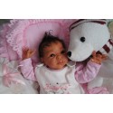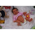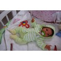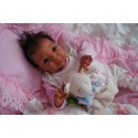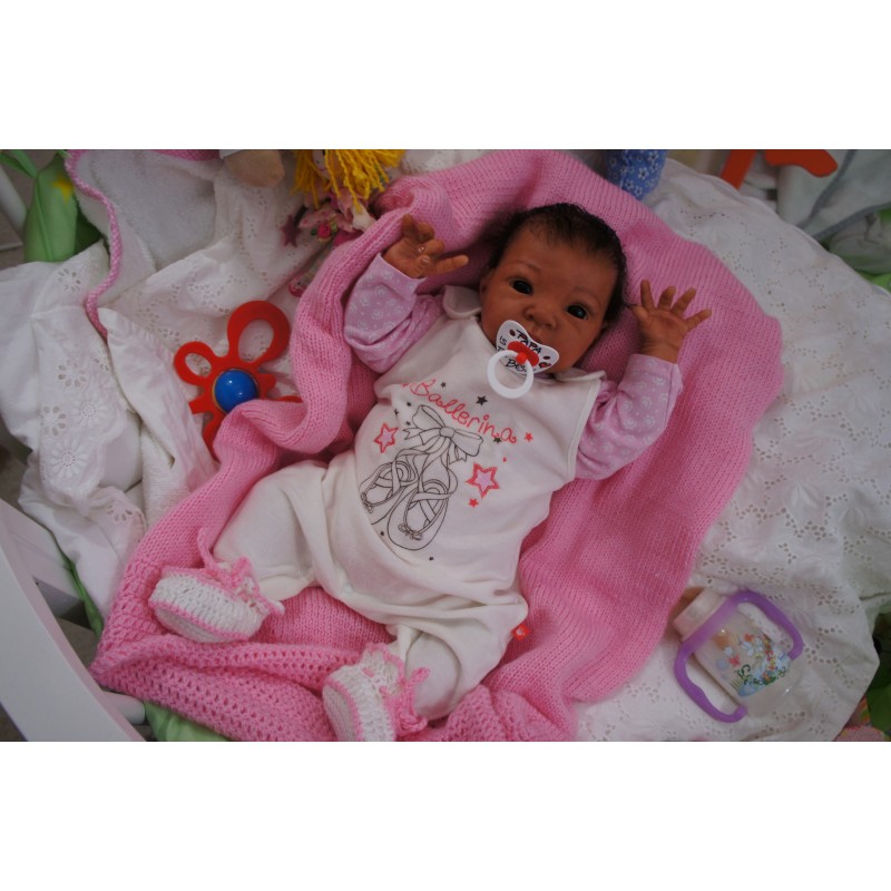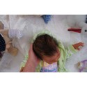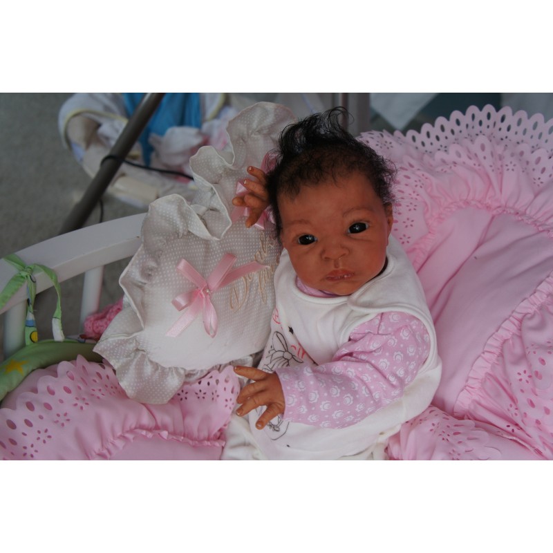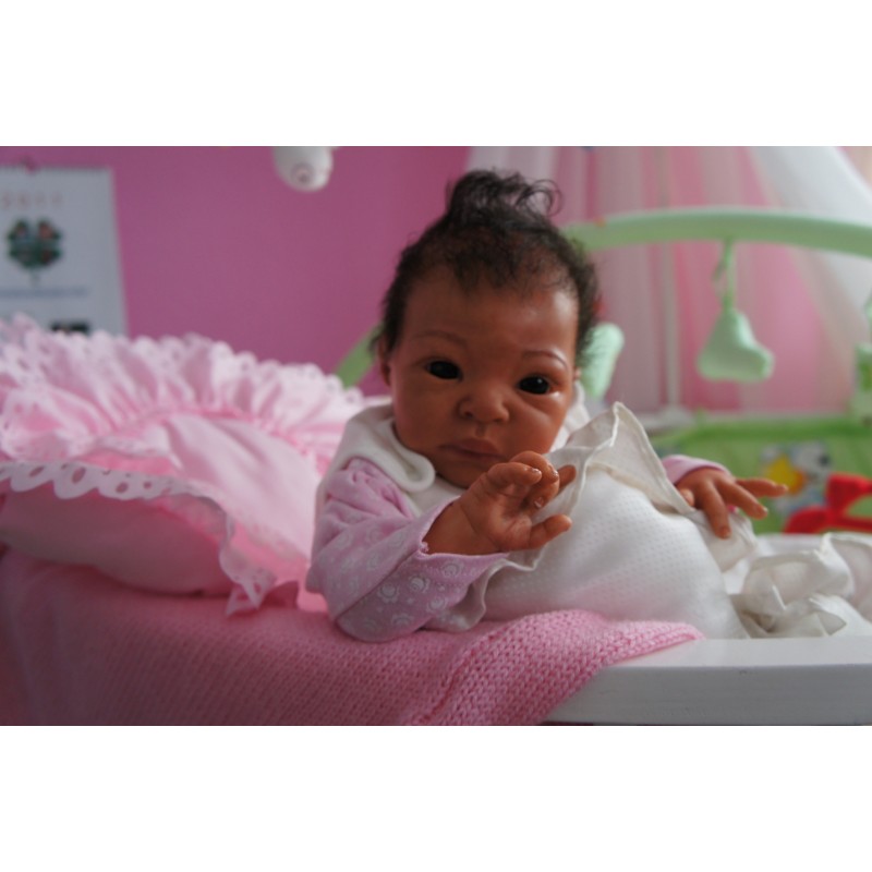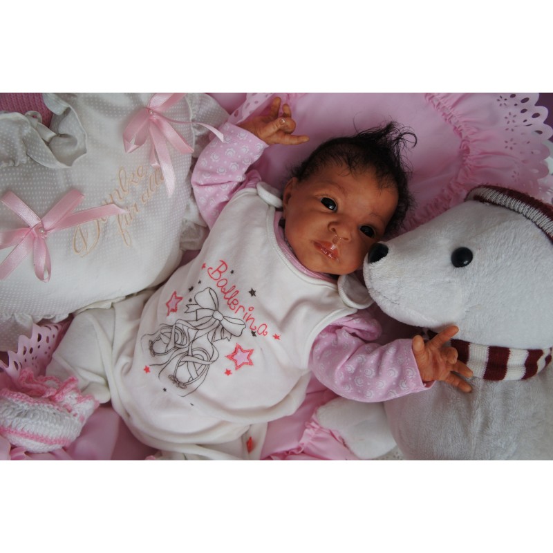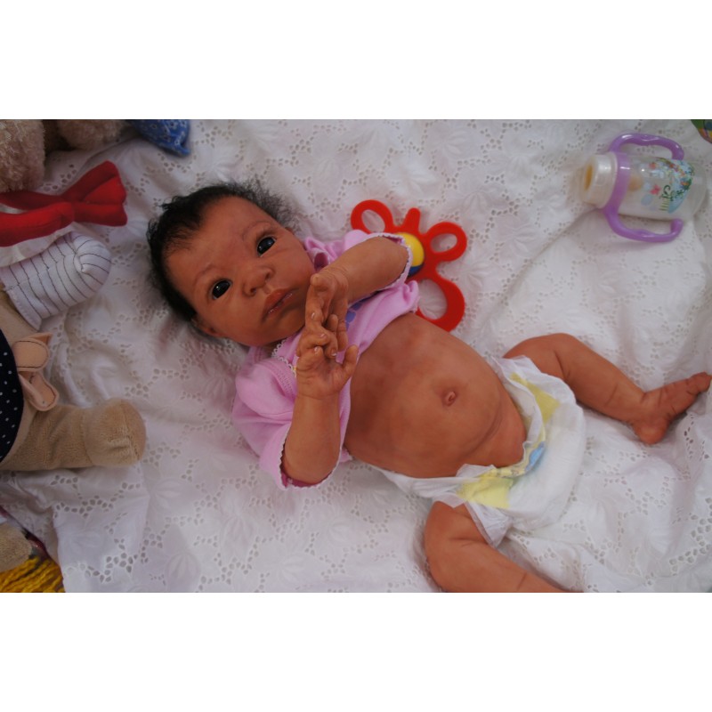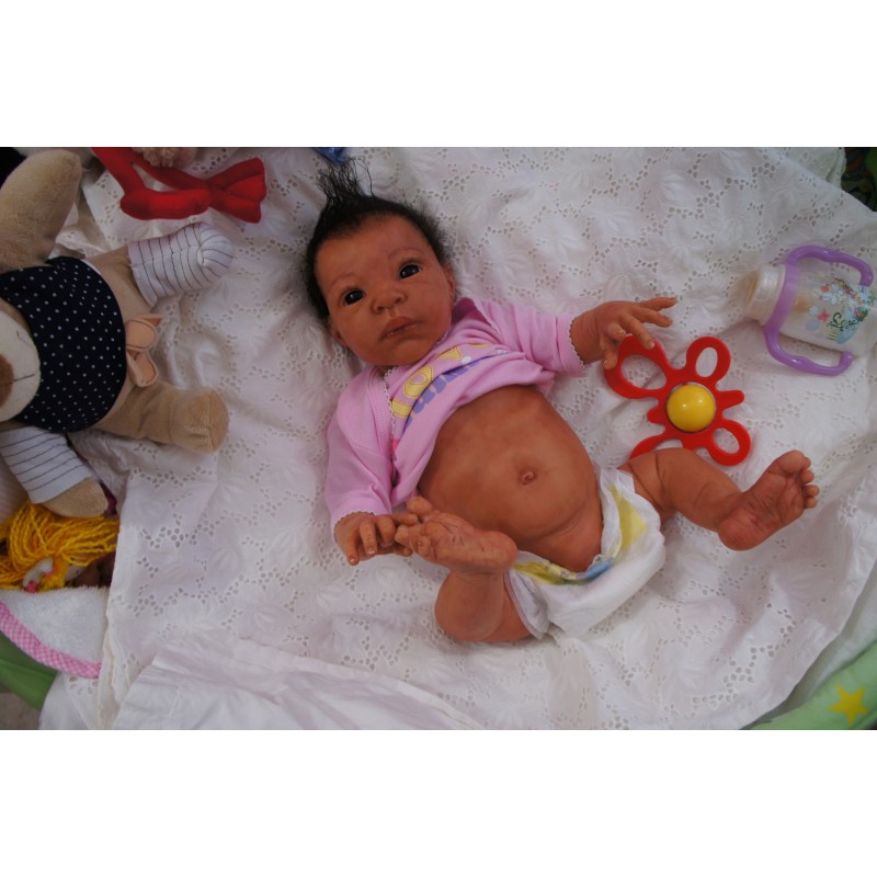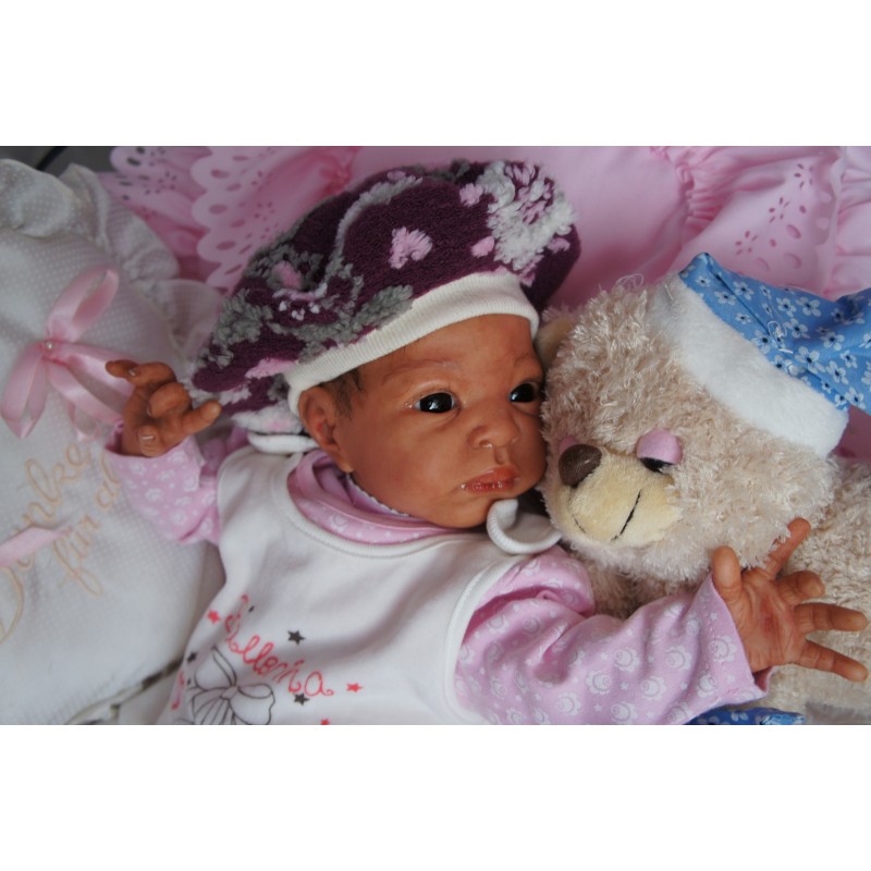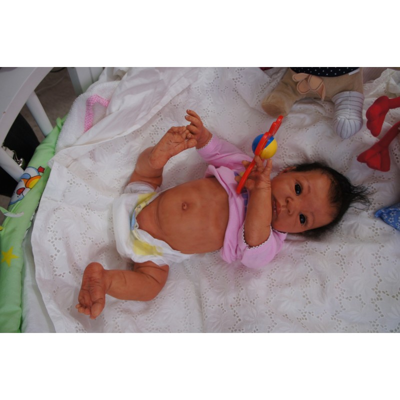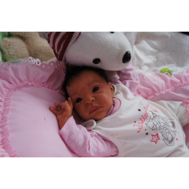 Ich wurde mit hochwertigen Farben in Real Effekt Technik eingefärbt. Mit Genesis Farben habe ich dieses alles noch mal zum Schluss gut versiegelt und eingebrannt. Diese wurde in mehreren Schichten aufgetragen, sodass ein sehr realistisches Hautbild entstanden ist. (Wisch- und Wasserfest kein Abblättern mgl). Feinste Schattierungen und leichte Betonung der Speckfalten wurden bei mir auch nicht vergessen. Leichte Äderchen an Händen, Armen, Füßchen, Beinen, Ohren, Kopf und Gesicht lassen mich wie ein echtes Baby aussehen. Jedes Fältchen an mir wurde einzeln betont. Zarte Augenbrauen wurden mir auch gegeben. Meine Nase wurde geöffnet und hinterlegt, sodass ich jetzt auch gut Luft bekomme. Auch zarte Befeuchtung der Augen, Mund und Nase lassen mich noch echter wirken.