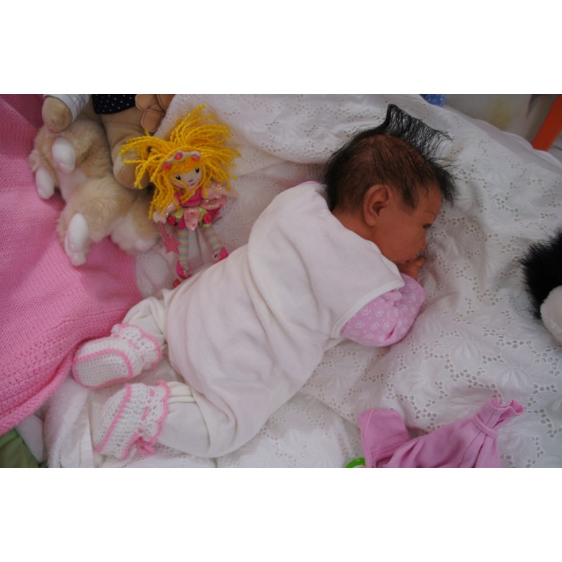 Meine Haare sind Schwarz und im micro Rooting Verfahren einzeln eingepflanzt (Feinstes Mohair ). Anschließend natürlich von innen versiegelt. Und nun kann man meine Haare kämmen und auch mal leicht waschen. Die passenden Wimpern habe ich auch dazu gerootet bekommen, das sieht jetzt richtig echt aus. Meine Finger- und Fußnägel wurden fein Pedi- und Manikürt und anschließend dauerhaft versiegelt. Zum Schluss bekam ich noch einen Magnetschnuller. Und ein Duftöl aufgetragen, jetzt riech ich auch noch wie ein echtes Baby.