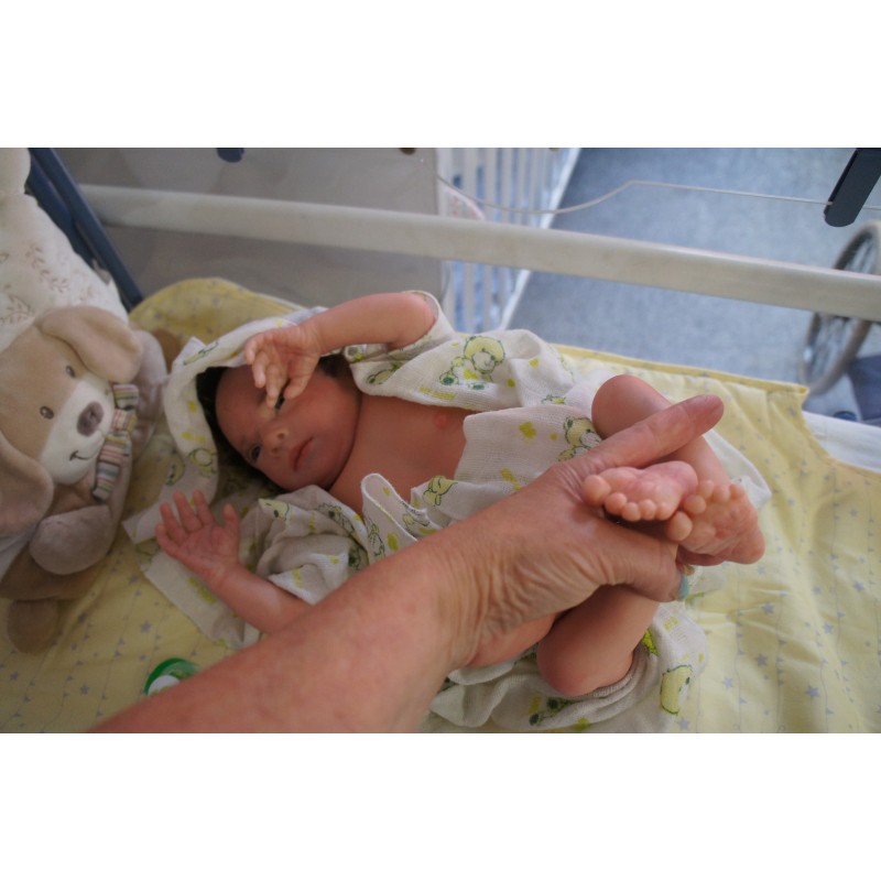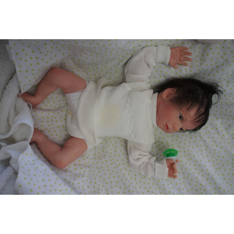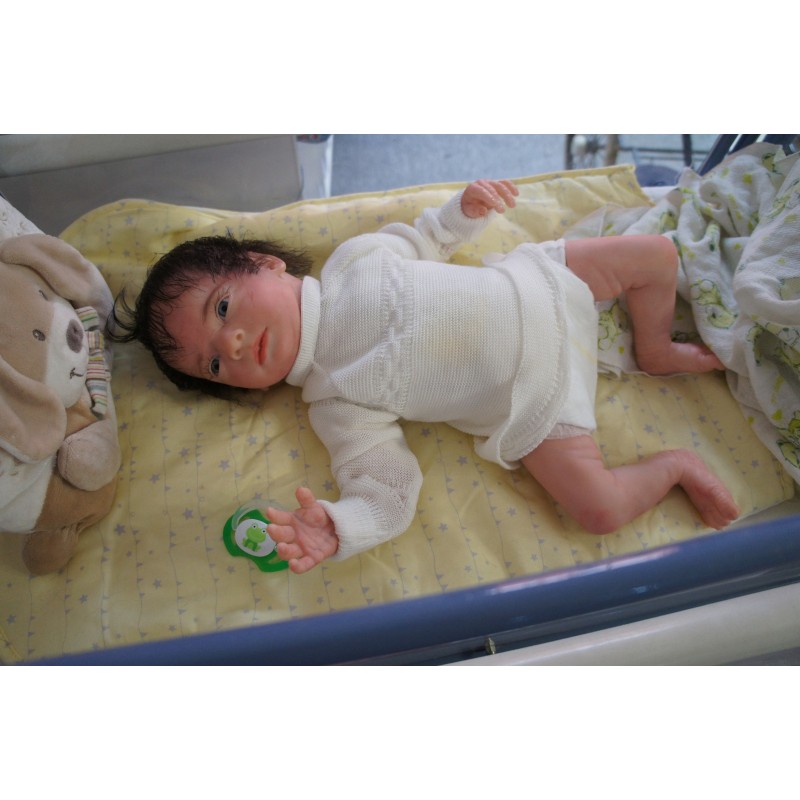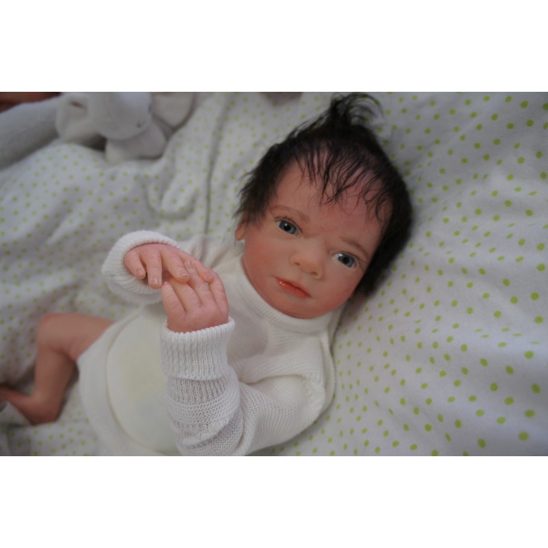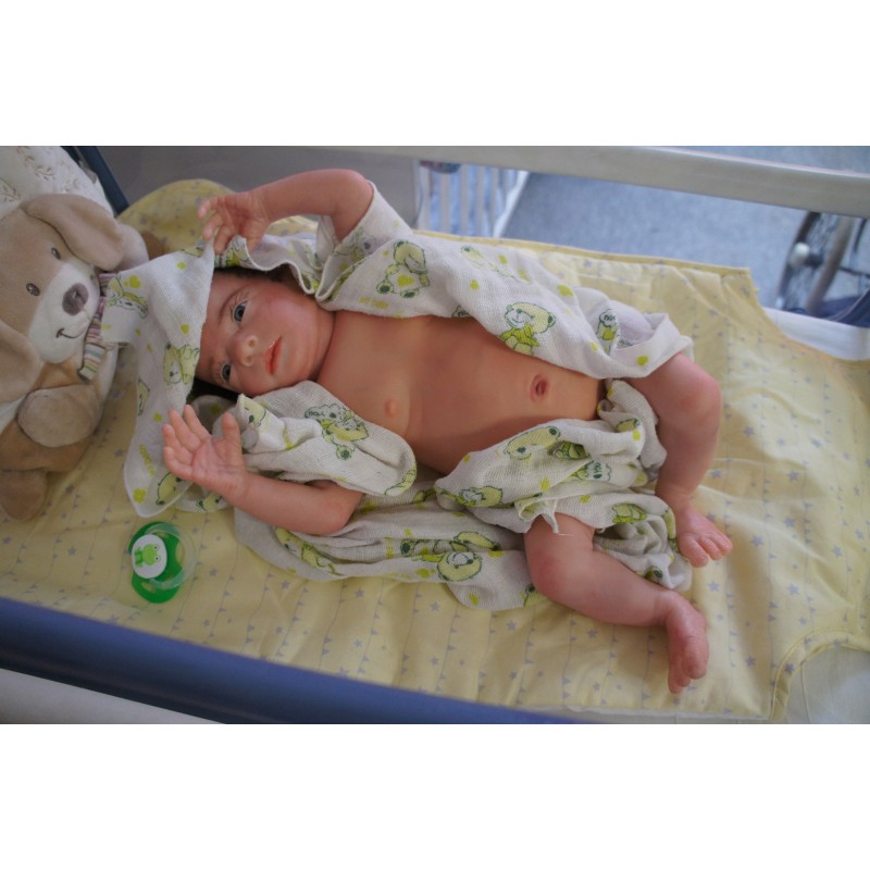 Ich wurde mit hochwertigen Farben in Real Effekt Technik eingefärbt. Mit Genesis Farben habe ich dieses alles noch mal zum Schluss gut versiegelt und eingebrannt. Diese wurde in mehreren Schichten aufgetragen, sodass ein sehr realistisches Hautbild entstanden ist. (Wisch- und Wasserfest kein Abblättern mgl). Feinste Schattierungen und leichte Betonung der Speckfalten wurden bei mir auch nicht vergessen. Leichte Äderchen an Händen, Armen, Füßchen, Beinen, Ohren, Kopf und Gesicht lassen mich wie ein echtes Baby aussehen. Jedes Fältchen an mir wurde einzeln betont. Zarte Augenbrauen wurden mir auch gegeben. Meine Nase wurde geöffnet und hinterlegt, sodass ich jetzt auch gut Luft bekomme. Auch zarte Befeuchtung der Augen, Mund und Nase lassen mich noch echter wirken.