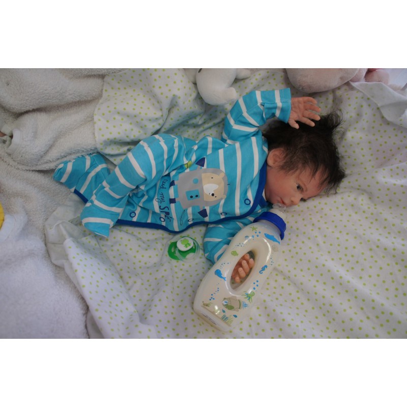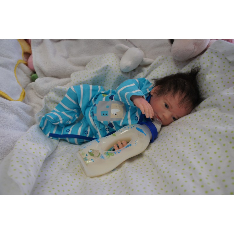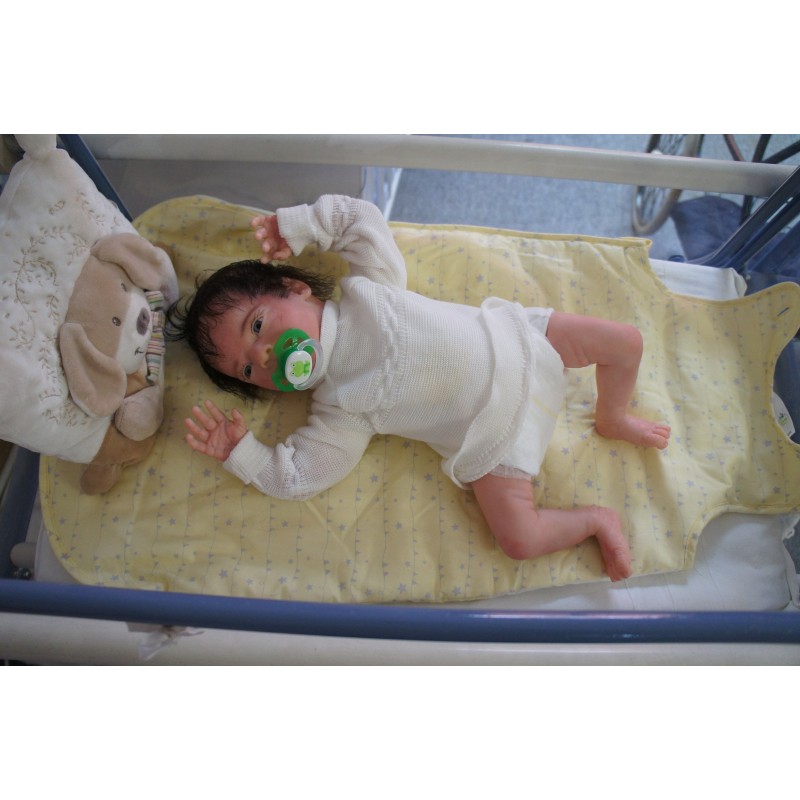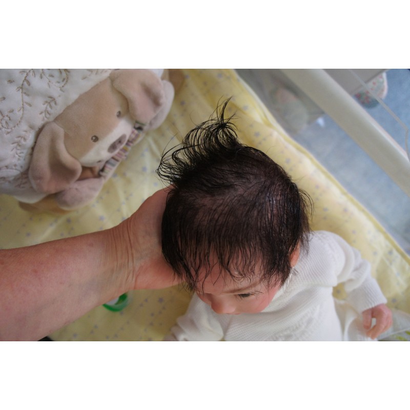 Meine Haare sind Dunkelbraun und im micro Rooting Verfahren einzeln eingepflanzt (Feinstes Mohair ). Anschließend natürlich von innen versiegelt. Und nun kann man meine Haare kämmen und auch mal leicht waschen. Die passenden Wimpern habe ich auch dazu gerootet bekommen, das sieht jetzt richtig echt aus. Meine Finger- und Fußnägel wurden fein Pedi- und Manikürt und anschließend dauerhaft versiegelt. Zum Schluss bekam ich noch einen Magnetschnuller. Und ein Duftöl aufgetragen, jetzt riech ich auch noch wie ein echtes Baby.