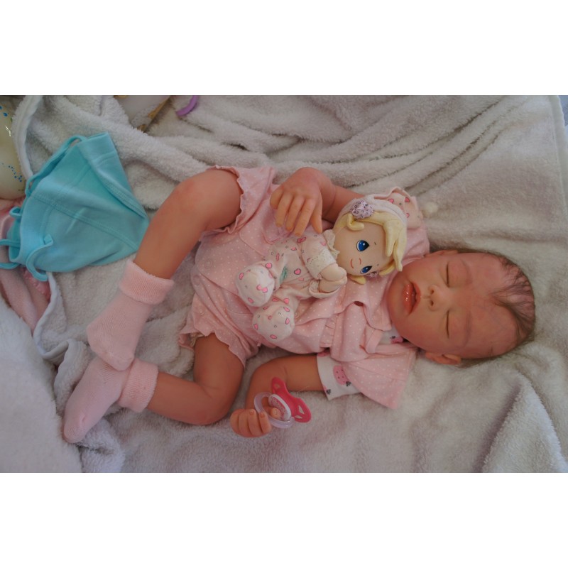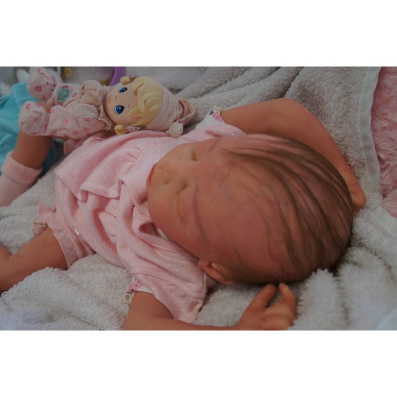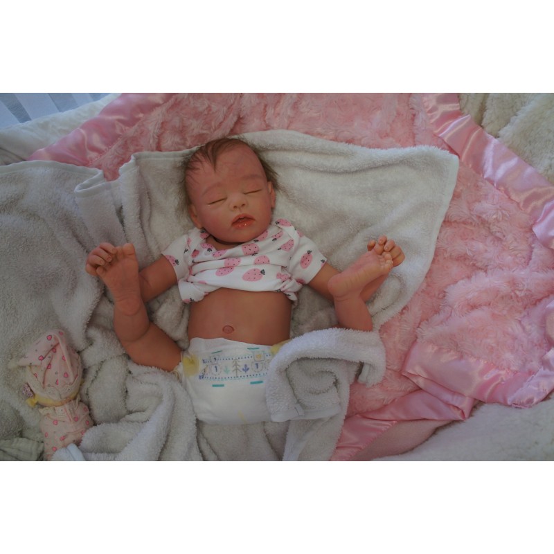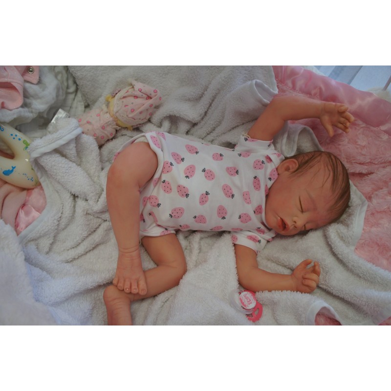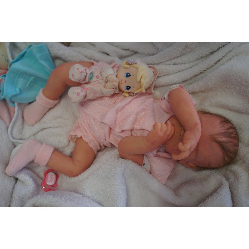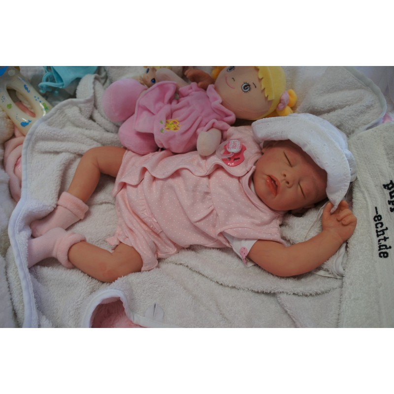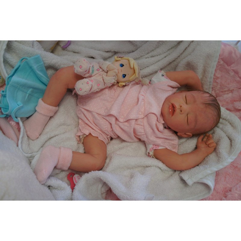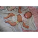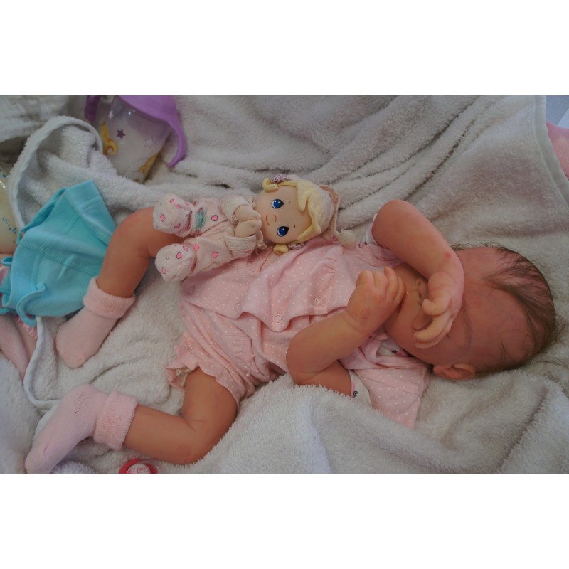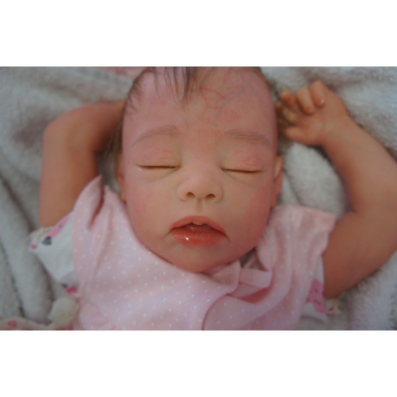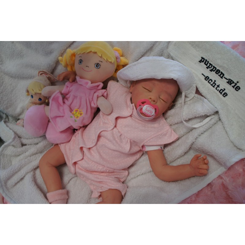 Ich wurde mit hochwertigen Farben in Real Effekt Technik eingefärbt. Mit Genesis Farben habe ich dieses alles noch mal zum Schluss gut versiegelt und eingebrannt. Diese wurde in mehreren Schichten aufgetragen, sodass ein sehr realistisches Hautbild entstanden ist. (Wisch- und Wasserfest kein Abblättern mgl). Feinste Schattierungen und leichte Betonung der Speckfalten wurden bei mir auch nicht vergessen. Leichte Äderchen an Händen, Armen, Füßchen, Beinen, Ohren, Kopf und Gesicht lassen mich wie ein echtes Baby aussehen. Jedes Fältchen an mir wurde einzeln betont. Zarte Augenbrauen wurden mir auch gegeben. Meine Nase wurde geöffnet und hinterlegt, sodass ich jetzt auch gut Luft bekomme. Auch zarte Befeuchtung der Augen, Mund und Nase lassen mich noch echter wirken.