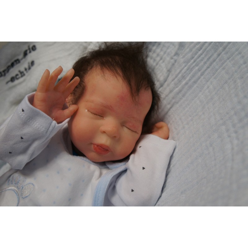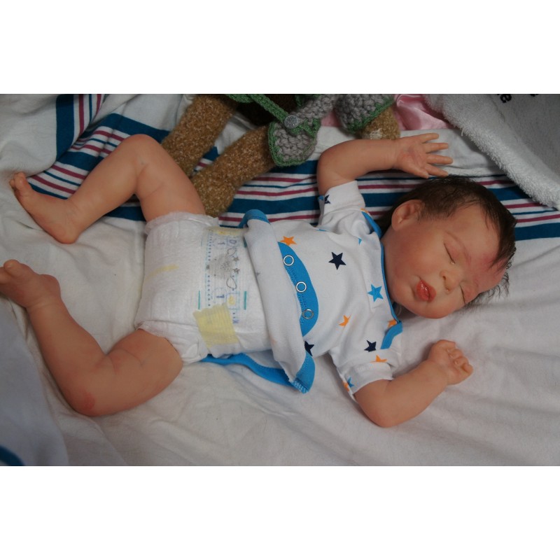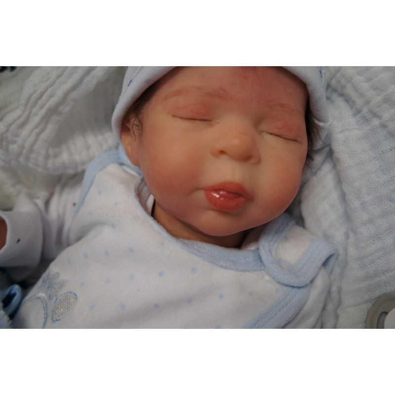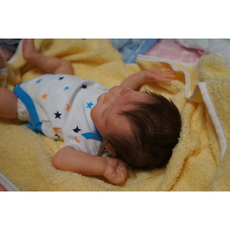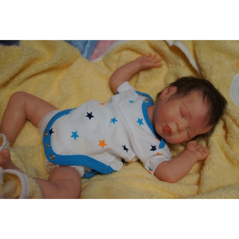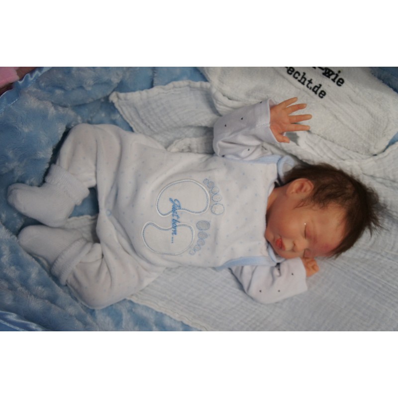 Ich wurde mit hochwertigen Farben in Real Effekt Technik eingefärbt. Mit Genesis Farben habe ich dieses alles noch mal zum Schluss gut versiegelt und eingebrannt. Diese wurde in mehreren Schichten aufgetragen, sodass ein sehr realistisches Hautbild entstanden ist. (Wisch- und Wasserfest kein Abblättern mgl). Feinste Schattierungen und leichte Betonung der Speckfalten wurden bei mir auch nicht vergessen. Leichte Äderchen an Händen, Armen, Füßchen, Beinen, Ohren, Kopf und Gesicht lassen mich wie ein echtes Baby aussehen. Jedes Fältchen an mir wurde einzeln betont. Zarte Augenbrauen wurden mir auch gegeben. Meine Nase wurde geöffnet und hinterlegt, sodass ich jetzt auch gut Luft bekomme. Auch zarte Befeuchtung der Augen, Mund und Nase lassen mich noch echter wirken.