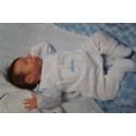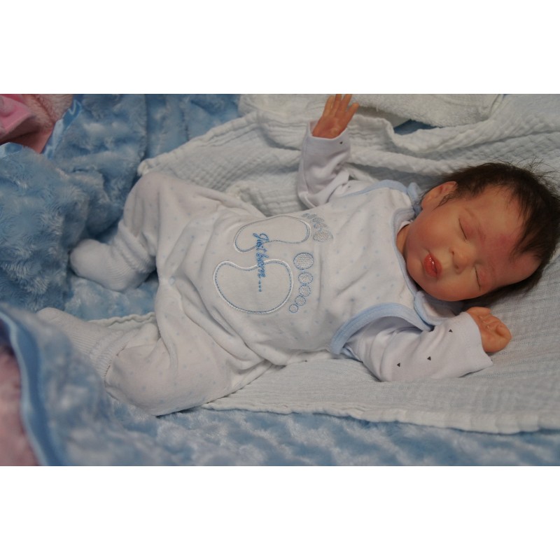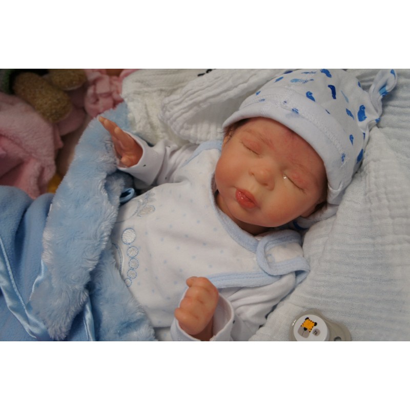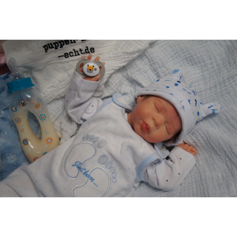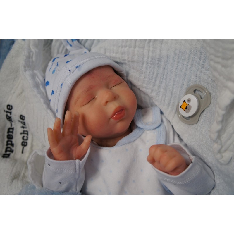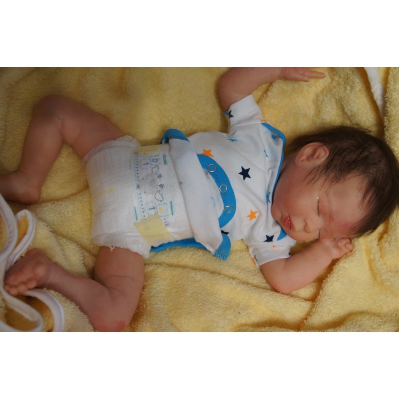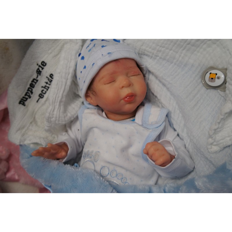 Ich wurde mit hochwertigen Farben in Real Effekt Technik eingefärbt. Mit Genesis Farben habe ich dieses alles noch mal zum Schluss gut versiegelt und eingebrannt. Diese wurde in mehreren Schichten aufgetragen, sodass ein sehr realistisches Hautbild entstanden ist. (Wisch- und Wasserfest kein Abblättern mgl). Feinste Schattierungen und leichte Betonung der Speckfalten wurden bei mir auch nicht vergessen. Leichte Äderchen an Händen, Armen, Füßchen, Beinen, Ohren, Kopf und Gesicht lassen mich wie ein echtes Baby aussehen. Jedes Fältchen an mir wurde einzeln betont. Zarte Augenbrauen wurden mir auch gegeben. Meine Nase wurde geöffnet und hinterlegt, sodass ich jetzt auch gut Luft bekomme. Auch zarte Befeuchtung der Augen, Mund und Nase lassen mich noch echter wirken.