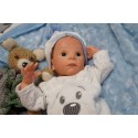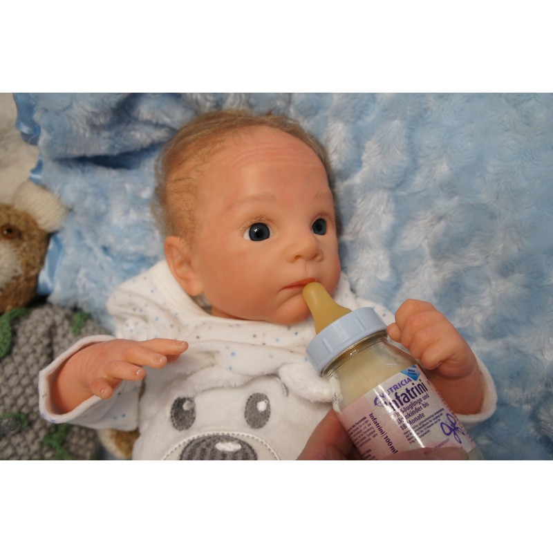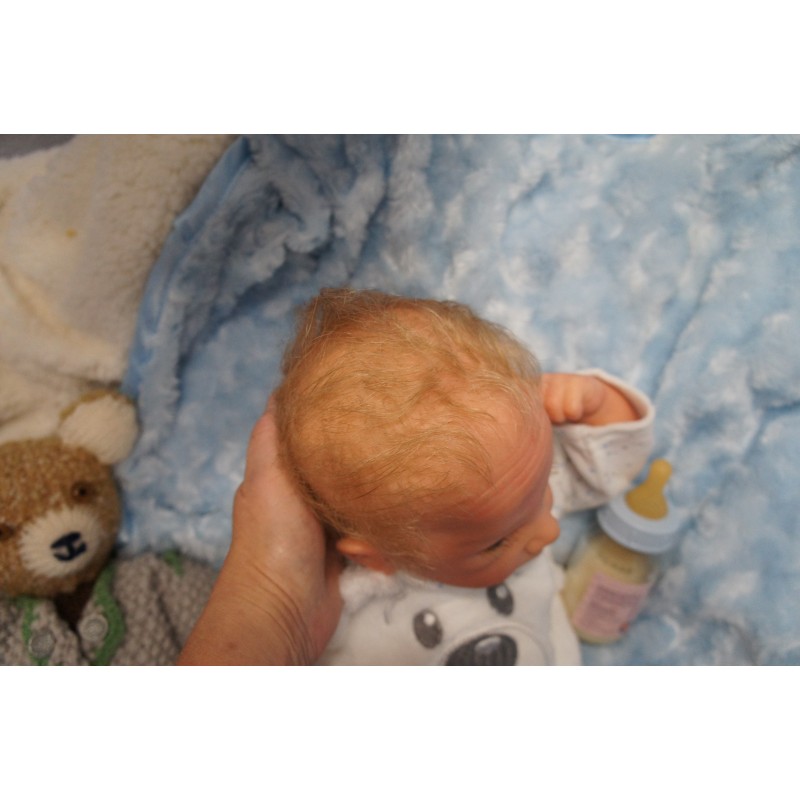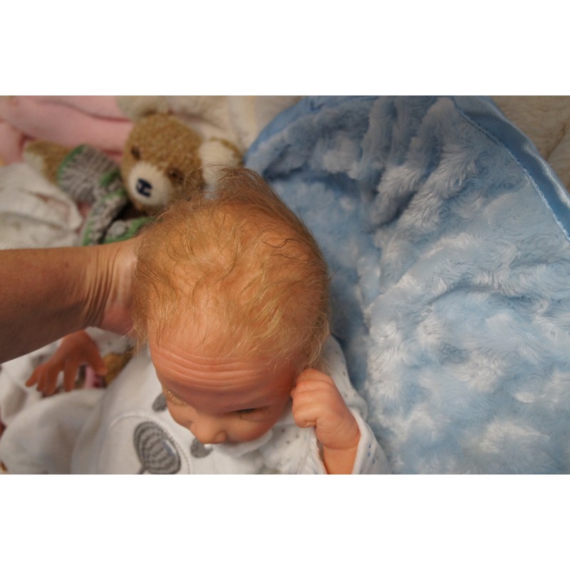 Meine Haare sind blond und im micro Rooting Verfahren einzeln eingepflanzt (Feinstes Mohair ). Anschließend natürlich von innen versiegelt. Und nun kann man meine Haare kämmen und auch mal leicht waschen. Die passenden Wimpern habe ich auch dazu gerootet bekommen, das sieht jetzt richtig echt aus. Meine Finger- und Fußnägel wurden fein Pedi- und Manikürt und anschließend dauerhaft versiegelt. Zum Schluss bekam ich noch einen Magnetschnuller. Und ein Duftöl aufgetragen, jetzt riech ich auch noch wie ein echtes Baby.