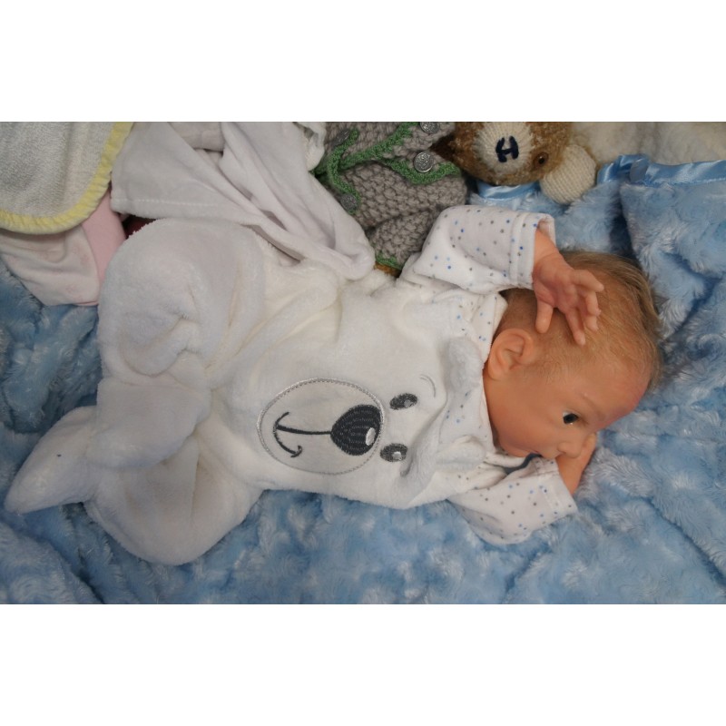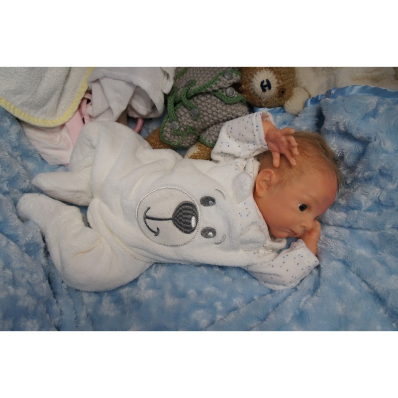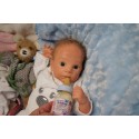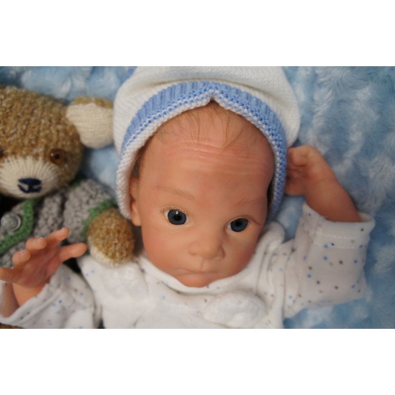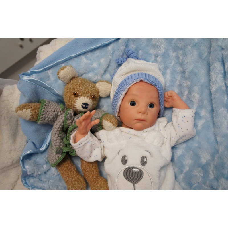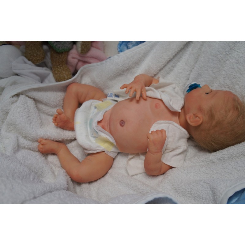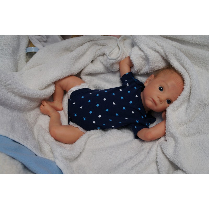 Ich wurde mit hochwertigen Farben in Real Effekt Technik eingefärbt. Mit Genesis Farben habe ich dieses alles noch mal zum Schluss gut versiegelt und eingebrannt. Diese wurde in mehreren Schichten aufgetragen, sodass ein sehr realistisches Hautbild entstanden ist. (Wisch- und Wasserfest kein Abblättern mgl). Feinste Schattierungen und leichte Betonung der Speckfalten wurden bei mir auch nicht vergessen. Leichte Äderchen an Händen, Armen, Füßchen, Beinen, Ohren, Kopf und Gesicht lassen mich wie ein echtes Baby aussehen. Jedes Fältchen an mir wurde einzeln betont. Zarte Augenbrauen wurden mir auch gegeben. Meine Nase wurde geöffnet und hinterlegt, sodass ich jetzt auch gut Luft bekomme. Auch zarte Befeuchtung der Augen, Mund und Nase lassen mich noch echter wirken.