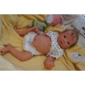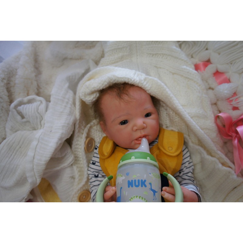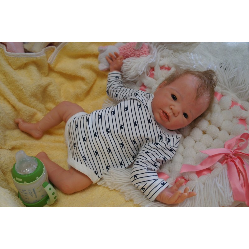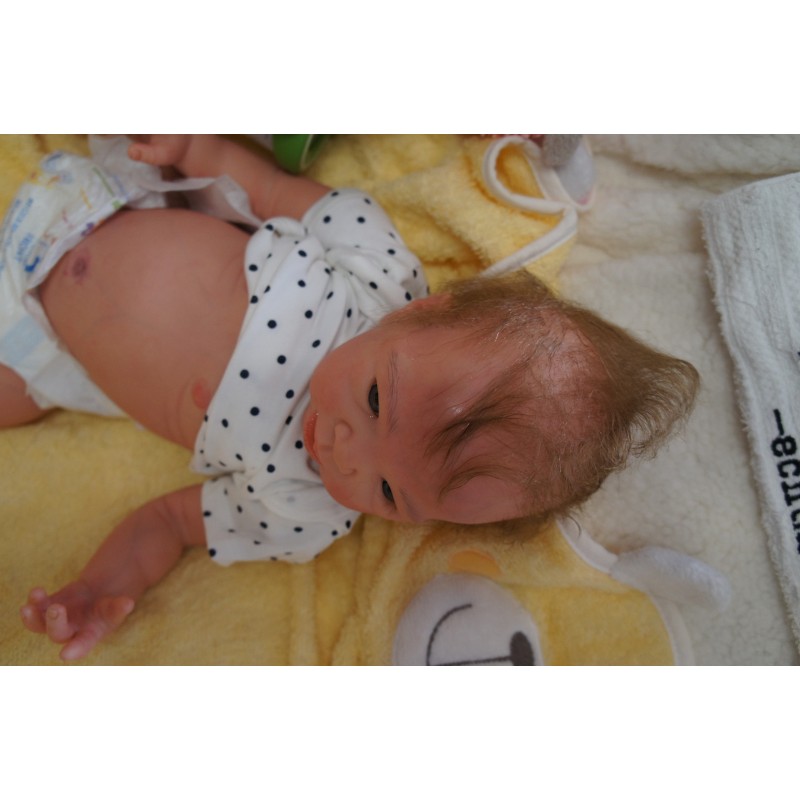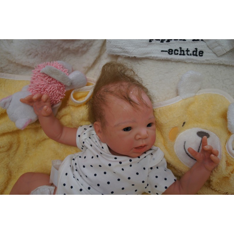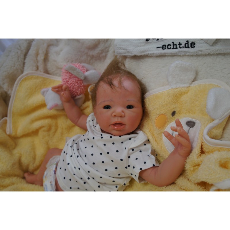 Ich wurde mit hochwertigen Farben in Real Effekt Technik eingefärbt. Mit Genesis Farben habe ich dieses alles noch mal zum Schluss gut versiegelt und eingebrannt. Diese wurde in mehreren Schichten aufgetragen, sodass ein sehr realistisches Hautbild entstanden ist. (Wisch- und Wasserfest kein Abblättern mgl). Feinste Schattierungen und leichte Betonung der Speckfalten wurden bei mir auch nicht vergessen. Leichte Äderchen an Händen, Armen, Füßchen, Beinen, Ohren, Kopf und Gesicht lassen mich wie ein echtes Baby aussehen. Jedes Fältchen an mir wurde einzeln betont. Zarte Augenbrauen wurden mir auch gegeben. Meine Nase wurde geöffnet und hinterlegt, sodass ich jetzt auch gut Luft bekomme. Auch zarte Befeuchtung der Augen, Mund und Nase lassen mich noch echter wirken.