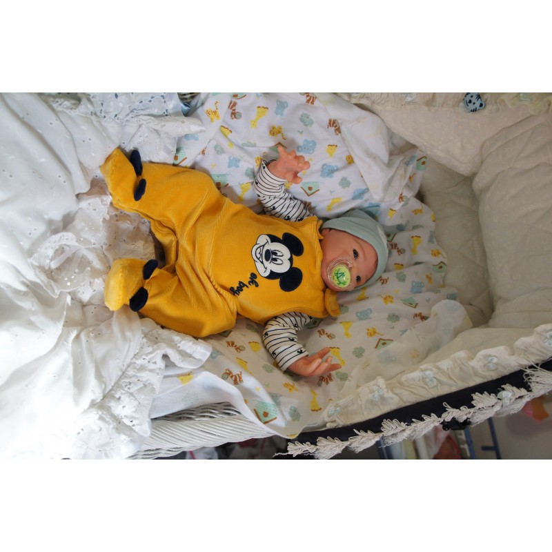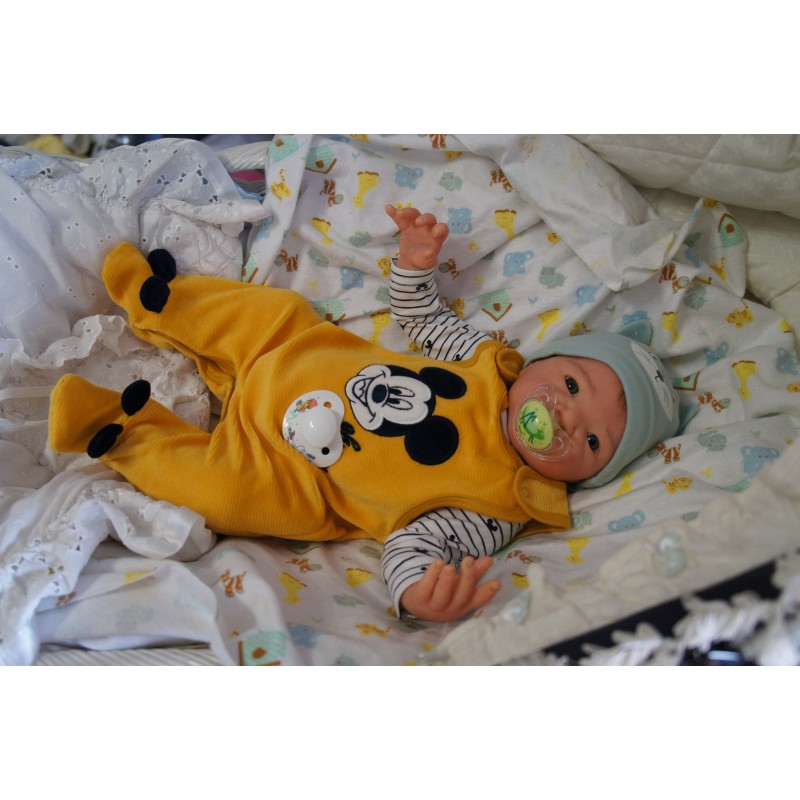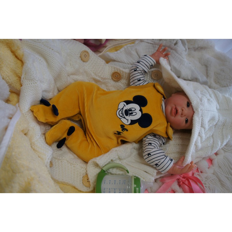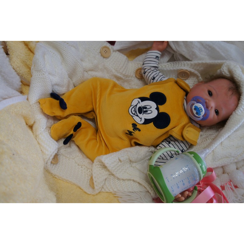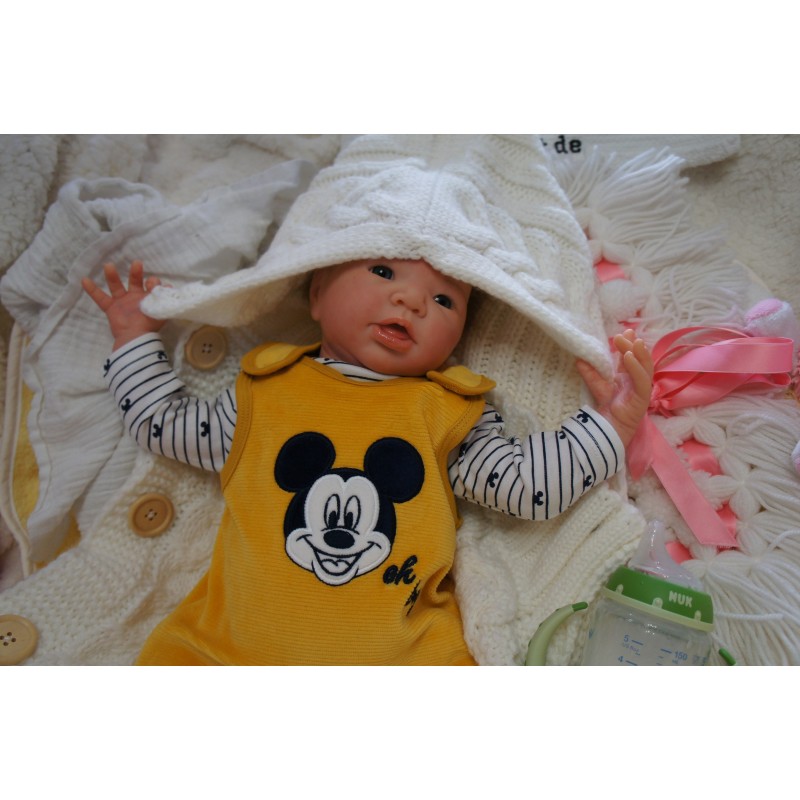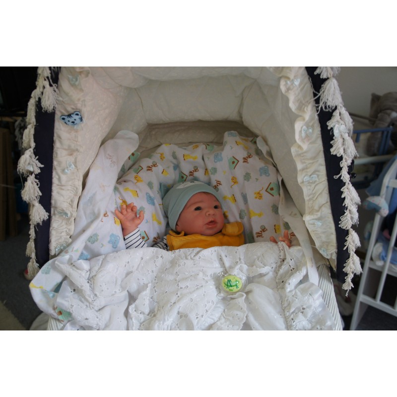 Ich wurde mit hochwertigen Farben in Real Effekt Technik eingefärbt. Mit Genesis Farben habe ich dieses alles noch mal zum Schluss gut versiegelt und eingebrannt. Diese wurde in mehreren Schichten aufgetragen, sodass ein sehr realistisches Hautbild entstanden ist. (Wisch- und Wasserfest kein Abblättern mgl). Feinste Schattierungen und leichte Betonung der Speckfalten wurden bei mir auch nicht vergessen. Leichte Äderchen an Händen, Armen, Füßchen, Beinen, Ohren, Kopf und Gesicht lassen mich wie ein echtes Baby aussehen. Jedes Fältchen an mir wurde einzeln betont. Zarte Augenbrauen wurden mir auch gegeben. Meine Nase wurde geöffnet und hinterlegt, sodass ich jetzt auch gut Luft bekomme. Auch zarte Befeuchtung der Augen, Mund und Nase lassen mich noch echter wirken.