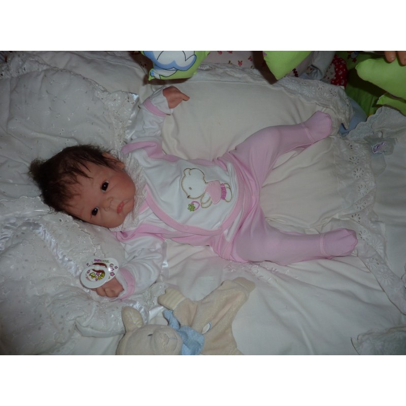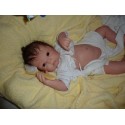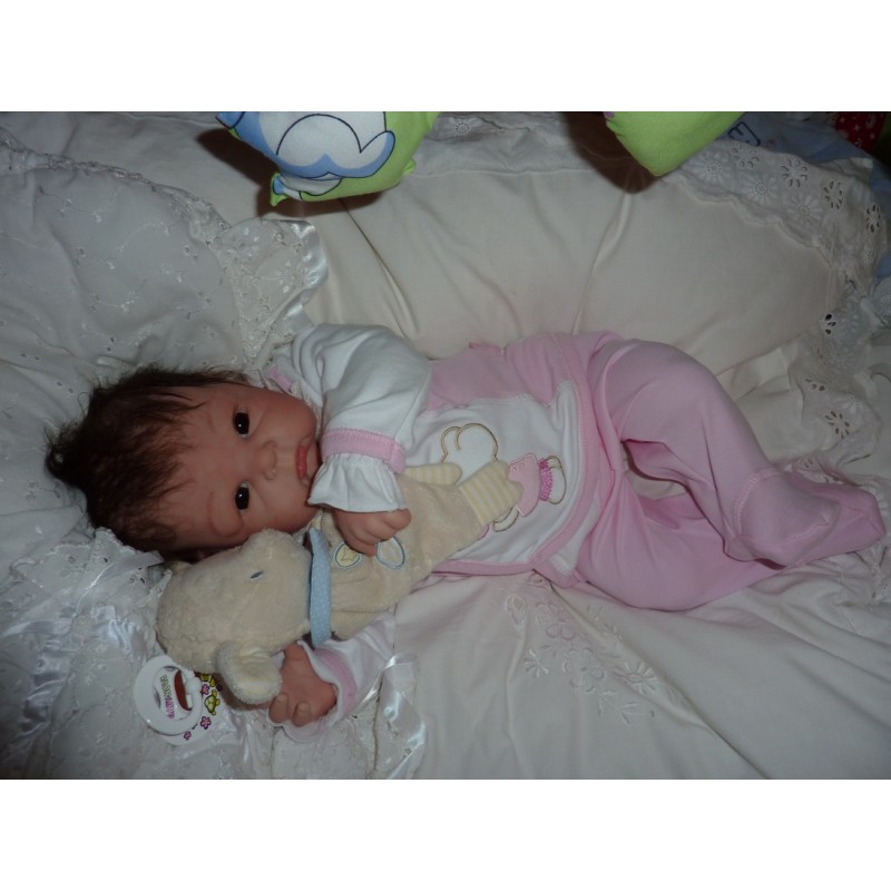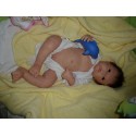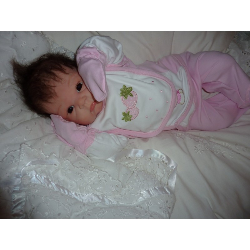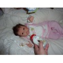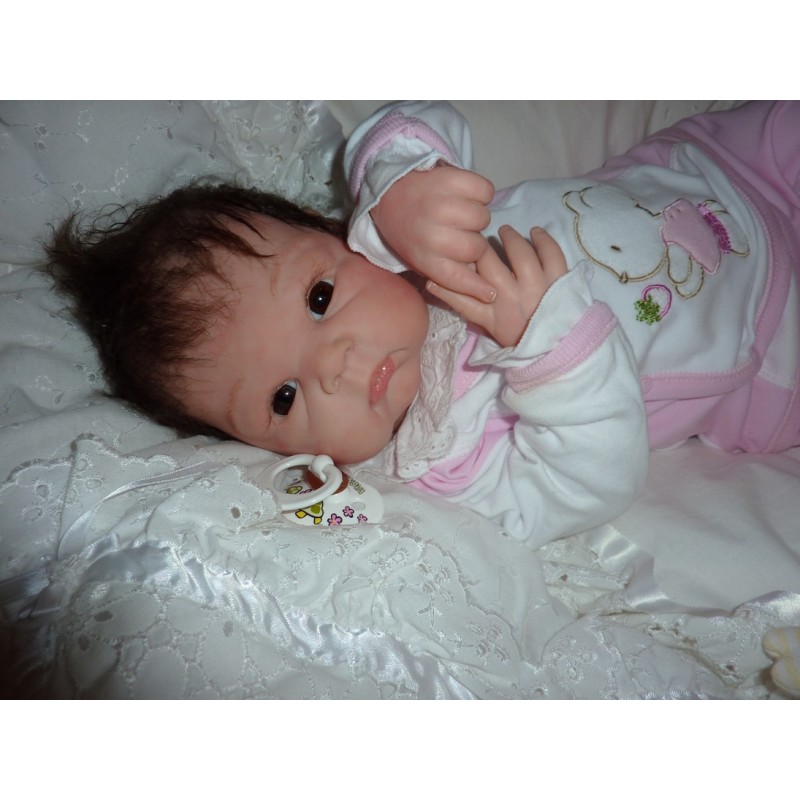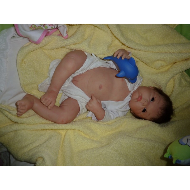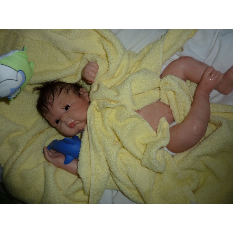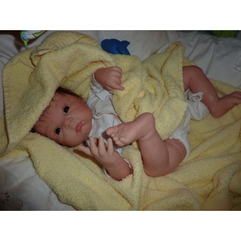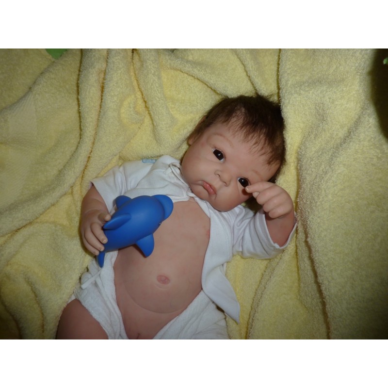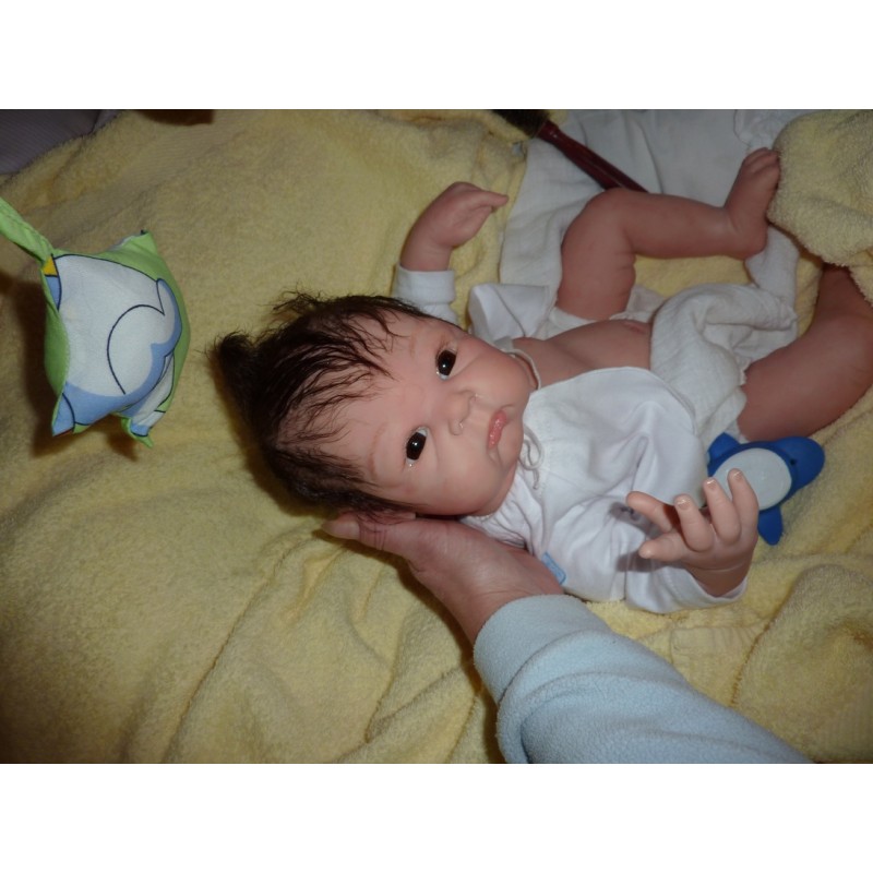 Ich wurde mit hochwertigen Farben in Real Effekt Technik eingefärbt. Mit Genesis Farben habe ich dieses alles noch mal zum Schluss gut versiegelt und eingebrannt. Diese wurde in mehreren Schichten aufgetragen, sodass ein sehr realistisches Hautbild entstanden ist. (Wisch- und Wasserfest kein Abblättern möglich). Feinste Schattierungen und leichte Betonung der Speckfalten wurden bei mir auch nicht vergessen. Leichte Äderchen an Händen, Armen, Füßchen, Beinen, Ohren, Kopf und Gesicht lassen mich wie ein echtes Baby aussehen. Jedes Fältchen an mir wurde einzeln betont. Zarte Augenbrauen wurden mir auch gegeben. Meine Nase wurde geöffnet und hinterlegt, sodass ich jetzt auch gut Luft bekomme. Auch zarte Befeuchtung der Augen, Mund und Nase lassen mich noch echter wirken.