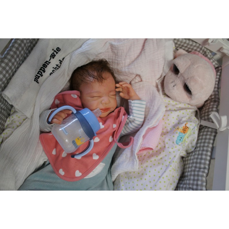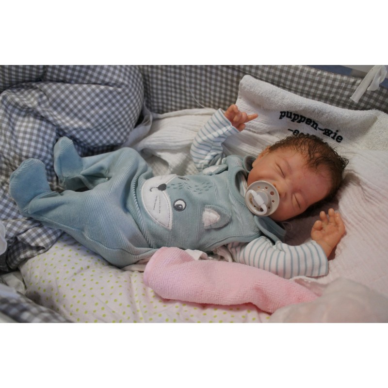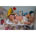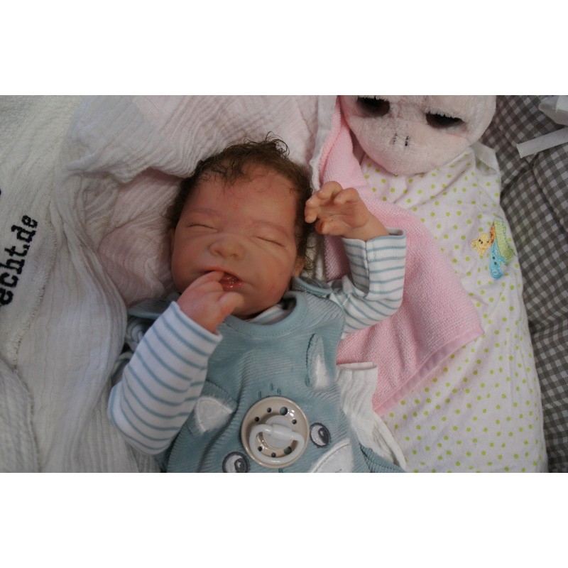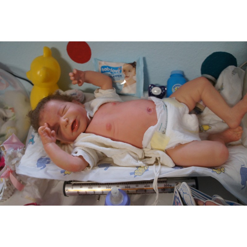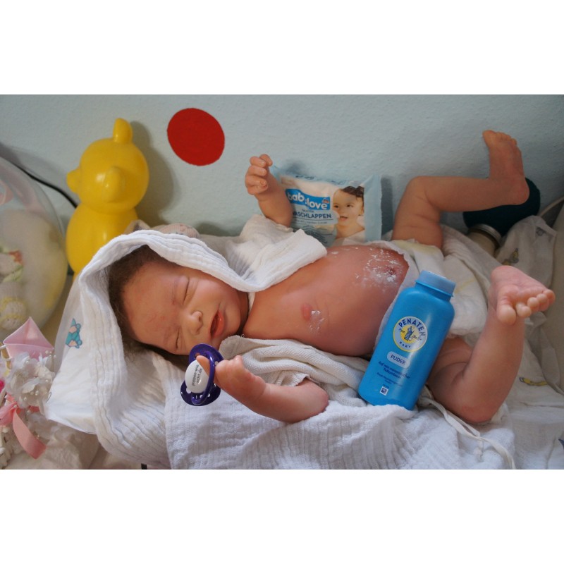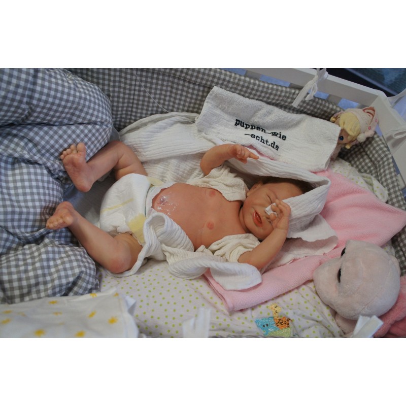 Ich wurde mit hochwertigen Farben in Real Effekt Technik eingefärbt. Mit Genesis Farben habe ich dieses alles noch mal zum Schluss gut versiegelt und eingebrannt. Diese wurde in mehreren Schichten aufgetragen, sodass ein sehr realistisches Hautbild entstanden ist. (Wisch- und Wasserfest kein Abblättern mgl). Feinste Schattierungen und leichte Betonung der Speckfalten wurden bei mir auch nicht vergessen. Leichte Äderchen an Händen, Armen, Füßchen, Beinen, Ohren, Kopf und Gesicht lassen mich wie ein echtes Baby aussehen. Jedes Fältchen an mir wurde einzeln betont. Zarte Augenbrauen wurden mir auch gegeben. Meine Nase wurde geöffnet und hinterlegt, sodass ich jetzt auch gut Luft bekomme. Auch zarte Befeuchtung der Augen, Mund und Nase lassen mich noch echter wirken.