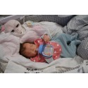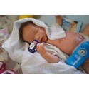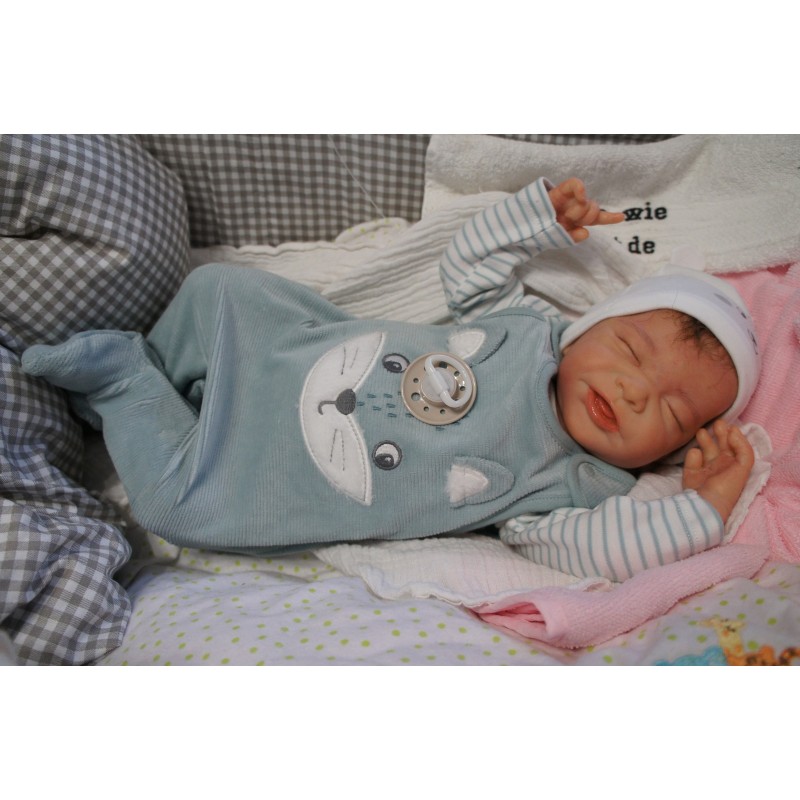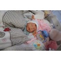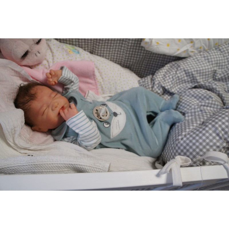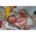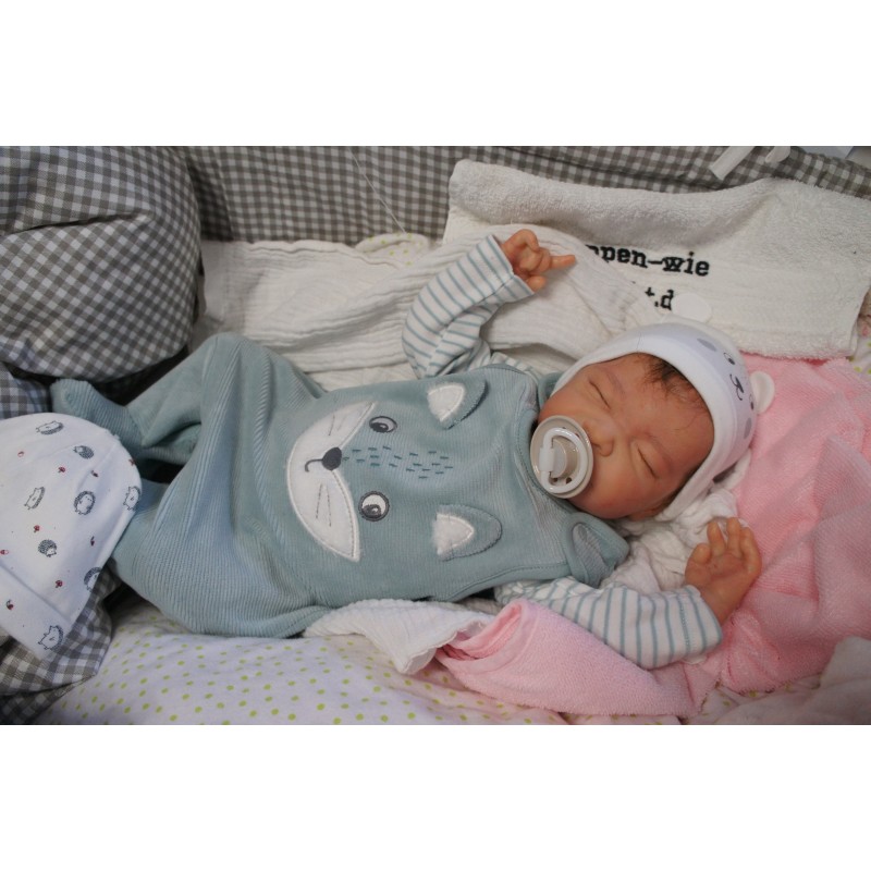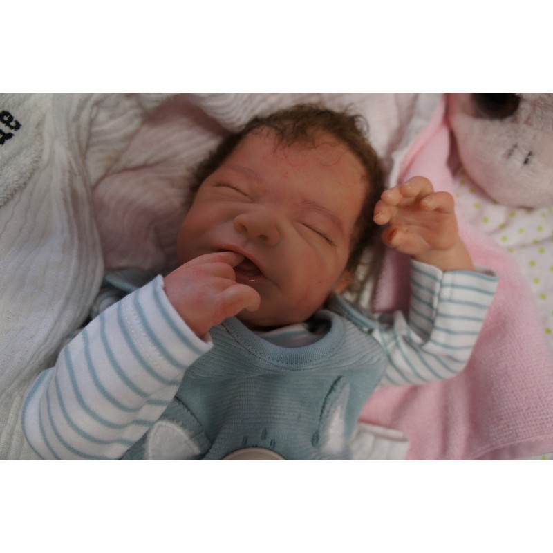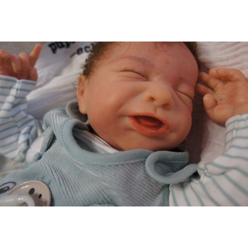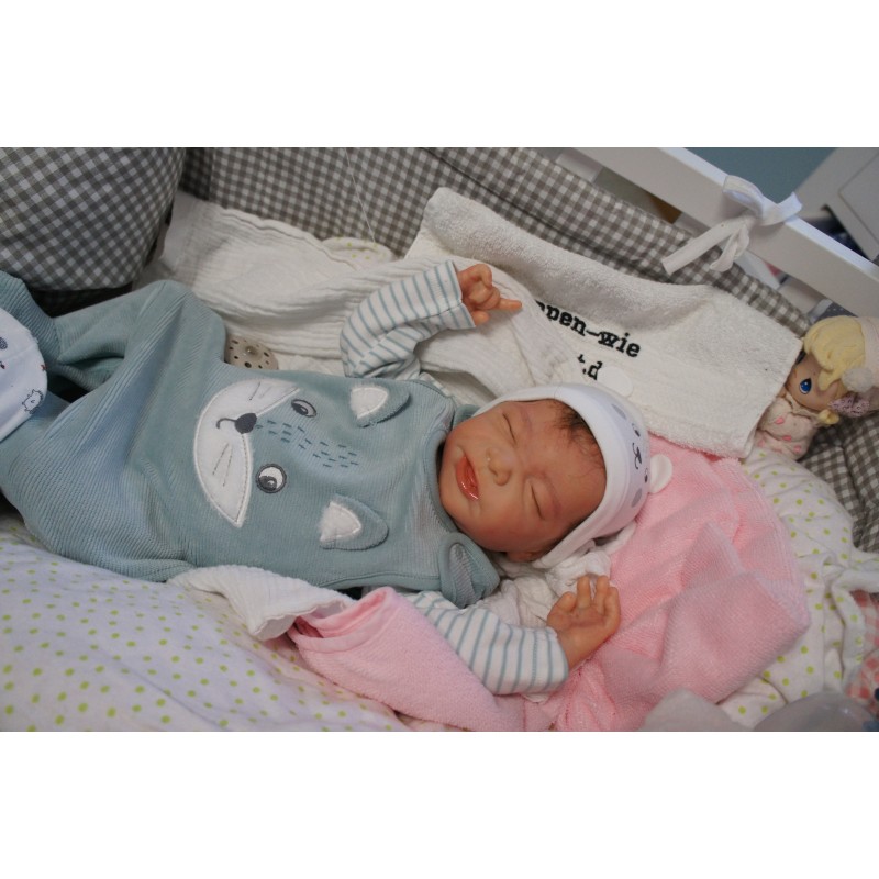 Ich wurde mit hochwertigen Farben in Real Effekt Technik eingefärbt. Mit Genesis Farben habe ich dieses alles noch mal zum Schluss gut versiegelt und eingebrannt. Diese wurde in mehreren Schichten aufgetragen, sodass ein sehr realistisches Hautbild entstanden ist. (Wisch- und Wasserfest kein Abblättern mgl). Feinste Schattierungen und leichte Betonung der Speckfalten wurden bei mir auch nicht vergessen. Leichte Äderchen an Händen, Armen, Füßchen, Beinen, Ohren, Kopf und Gesicht lassen mich wie ein echtes Baby aussehen. Jedes Fältchen an mir wurde einzeln betont. Zarte Augenbrauen wurden mir auch gegeben. Meine Nase wurde geöffnet und hinterlegt, sodass ich jetzt auch gut Luft bekomme. Auch zarte Befeuchtung der Augen, Mund und Nase lassen mich noch echter wirken.