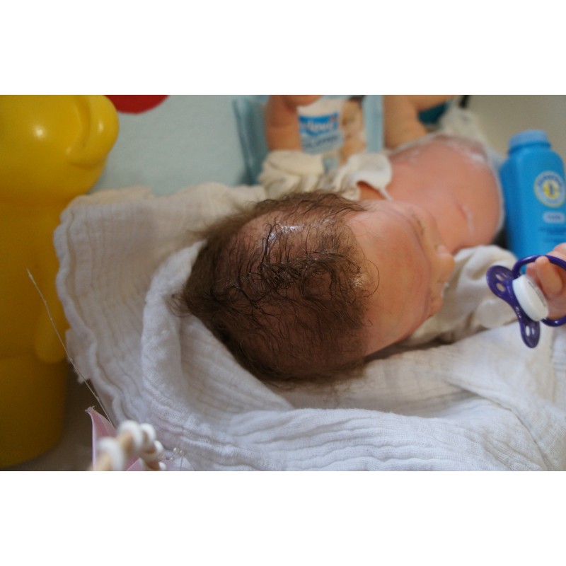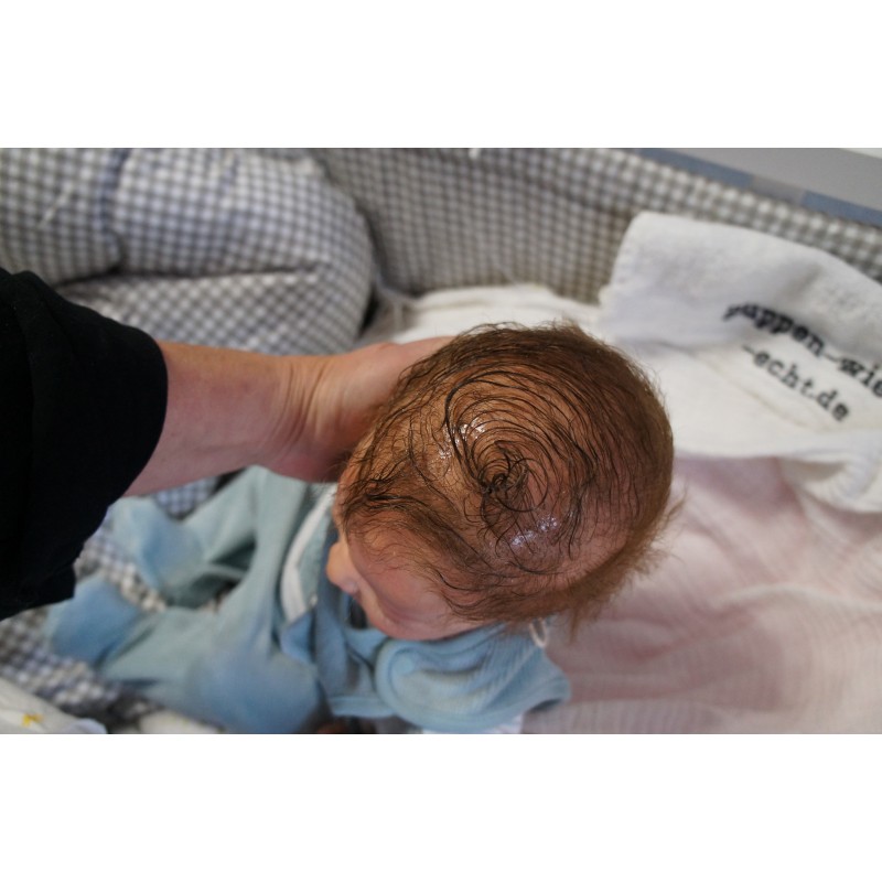 Meine Haare sind mittelbraun und im micro Rooting Verfahren einzeln eingepflanzt (Feinstes Mohair ). Anschließend natürlich von innen versiegelt. Und nun kann man meine Haare kämmen und auch mal leicht waschen. Die passenden Wimpern habe ich auch dazu gerootet bekommen, das sieht jetzt richtig echt aus. Meine Finger- und Fußnägel wurden fein Pedi- und Manikürt und anschließend dauerhaft versiegelt. Zum Schluss bekam ich noch einen Magnetschnuller. Und ein Duftöl aufgetragen, jetzt riech ich auch noch wie ein echtes Baby.