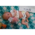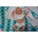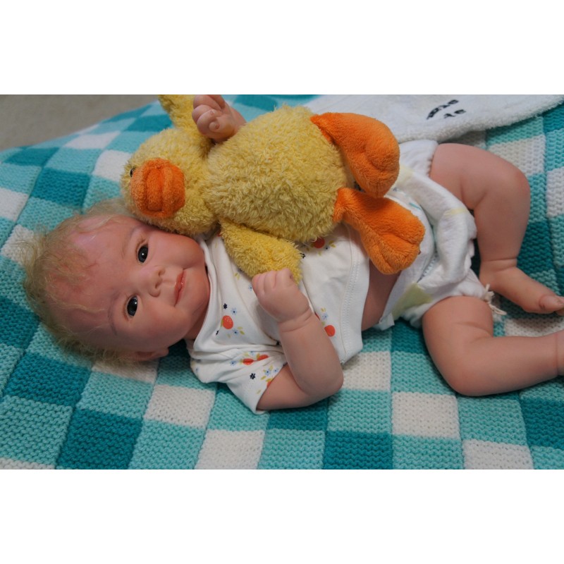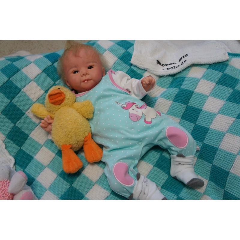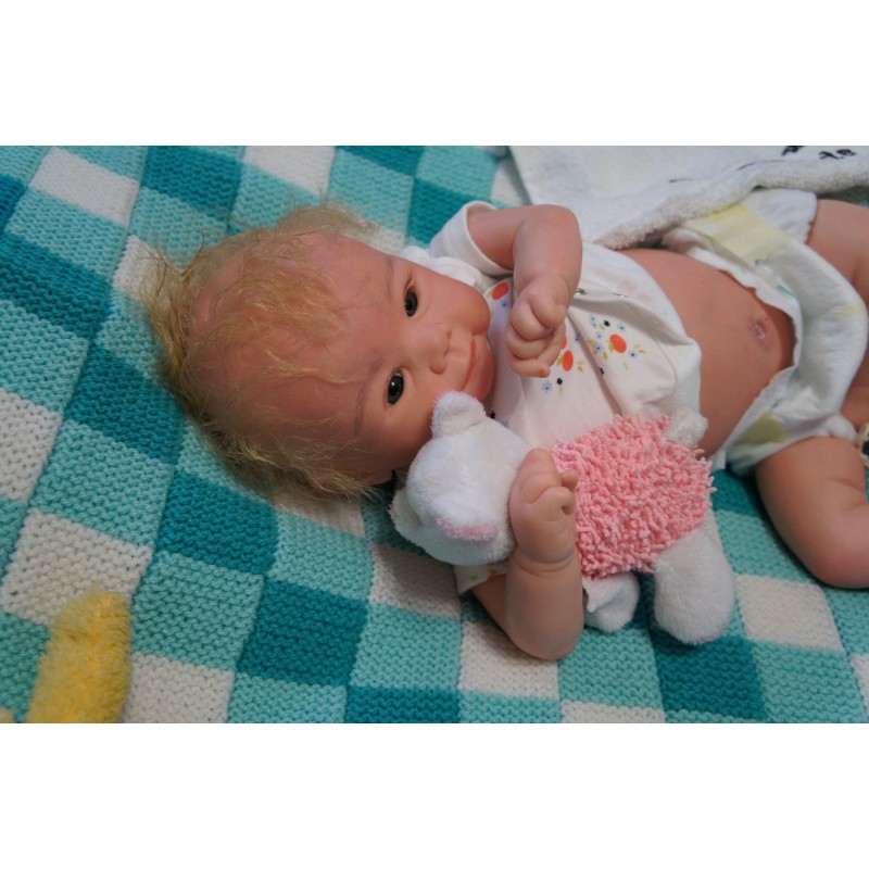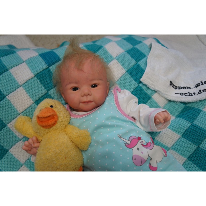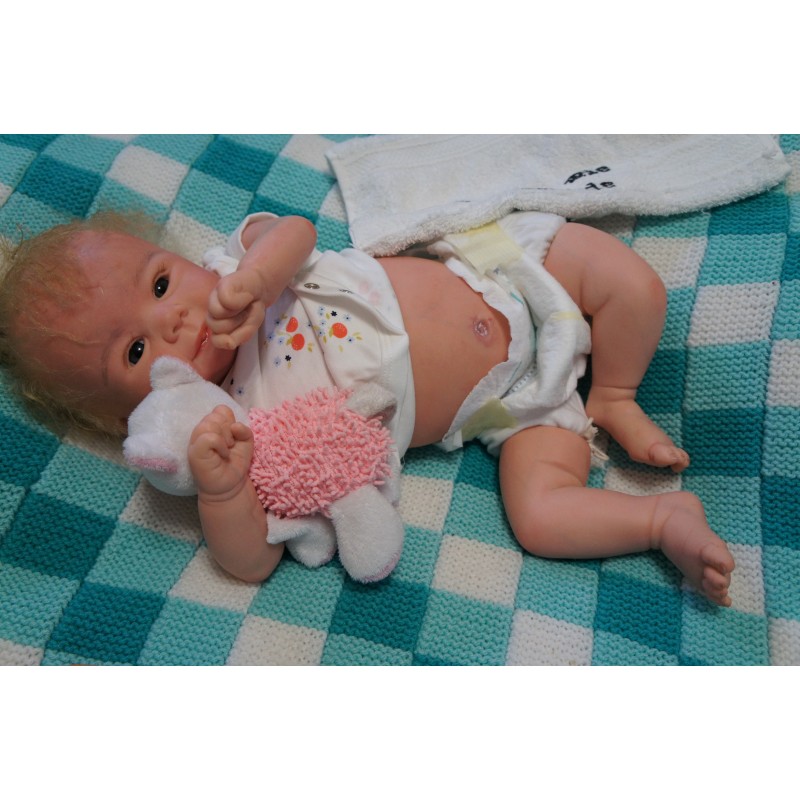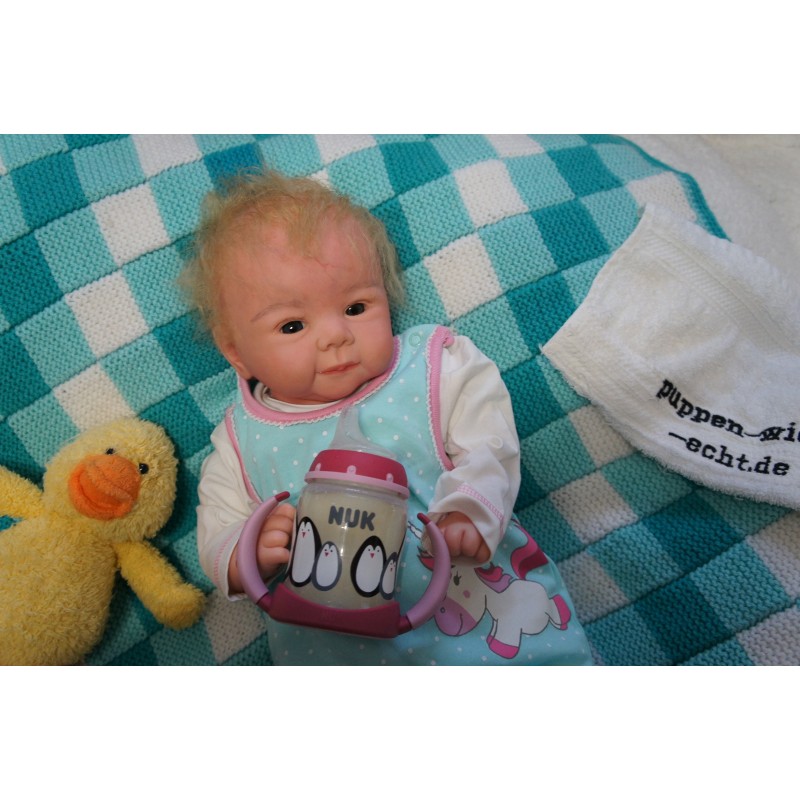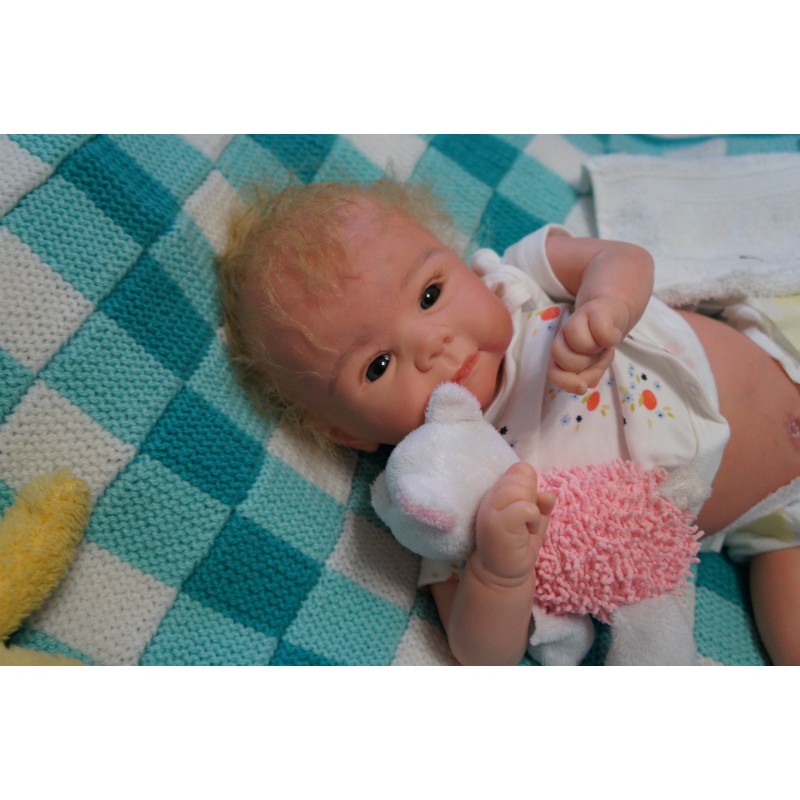 Meine Haare sind blond und im micro Rooting Verfahren einzeln eingepflanzt (Feinstes Mohair ). Anschließend natürlich von innen versiegelt. Und nun kann man meine Haare kämmen und auch mal leicht waschen. Die passenden Wimpern habe ich auch dazu gerootet bekommen, das sieht jetzt richtig echt aus. Meine Finger- und Fußnägel wurden fein Pedi- und Manikürt und anschließend dauerhaft versiegelt. Zum Schluss bekam ich noch einen Magnetschnuller. Und ein Duftöl aufgetragen, jetzt riech ich auch noch wie ein echtes Baby.