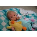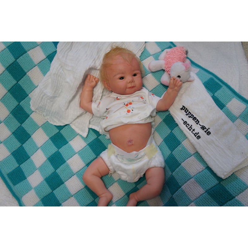 Ich wurde mit hochwertigen Farben in Real Effekt Technik eingefärbt. Mit Genesis Farben habe ich dieses alles noch mal zum Schluss gut versiegelt und eingebrannt. Diese wurde in mehreren Schichten aufgetragen, sodass ein sehr realistisches Hautbild entstanden ist. (Wisch- und Wasserfest kein Abblättern mgl). Feinste Schattierungen und leichte Betonung der Speckfalten wurden bei mir auch nicht vergessen. Leichte Äderchen an Händen, Armen, Füßchen, Beinen, Ohren, Kopf und Gesicht lassen mich wie ein echtes Baby aussehen. Jedes Fältchen an mir wurde einzeln betont. Zarte Augenbrauen wurden mir auch gegeben. Meine Nase wurde geöffnet und hinterlegt, sodass ich jetzt auch gut Luft bekomme. Auch zarte Befeuchtung der Augen, Mund und Nase lassen mich noch echter wirken.