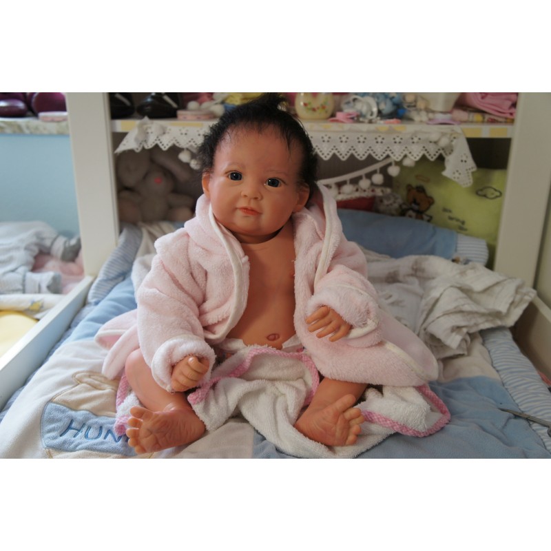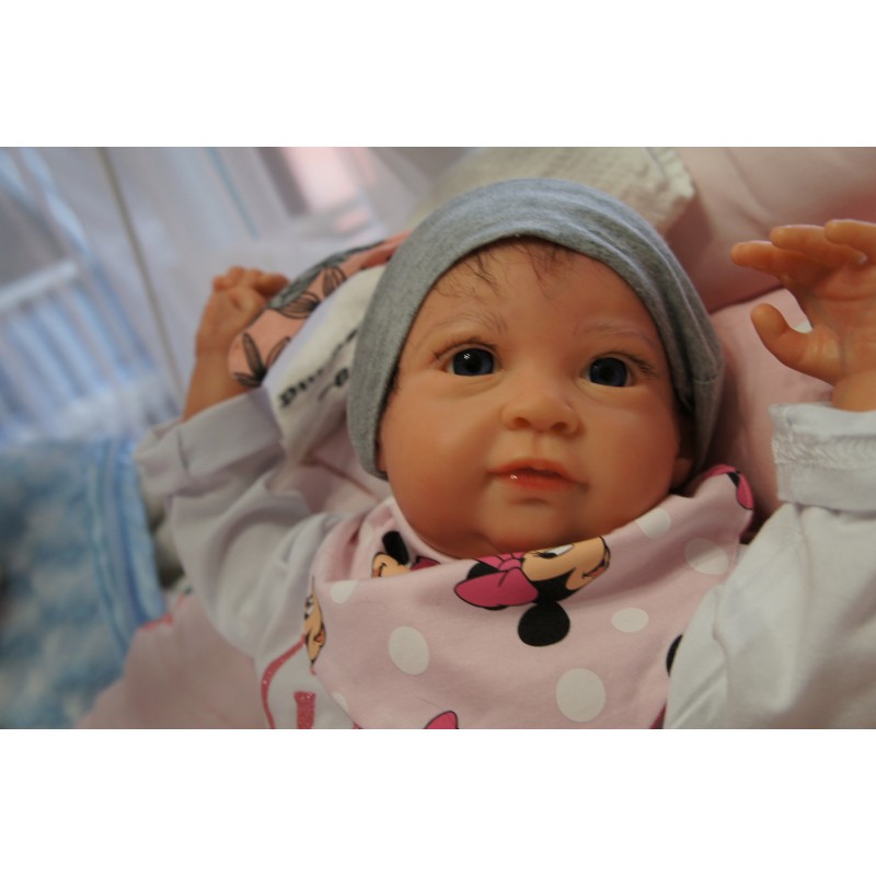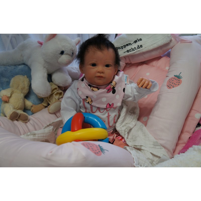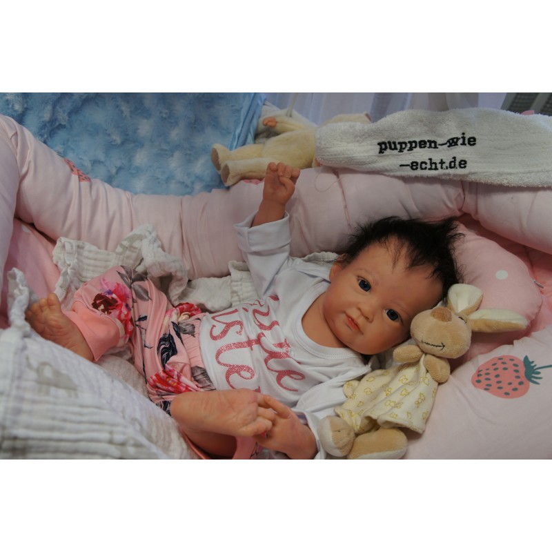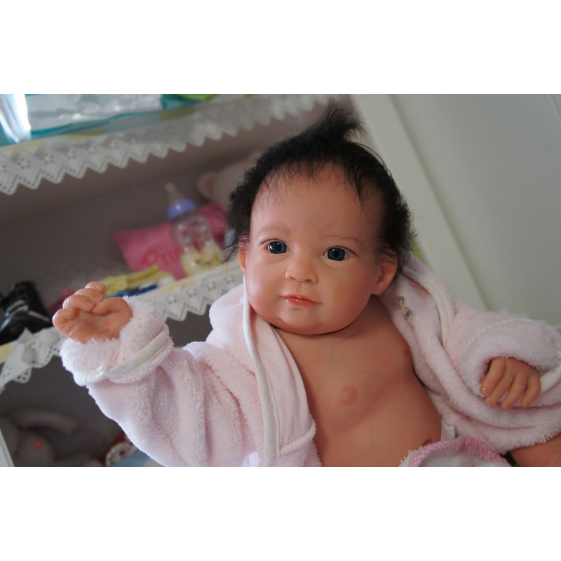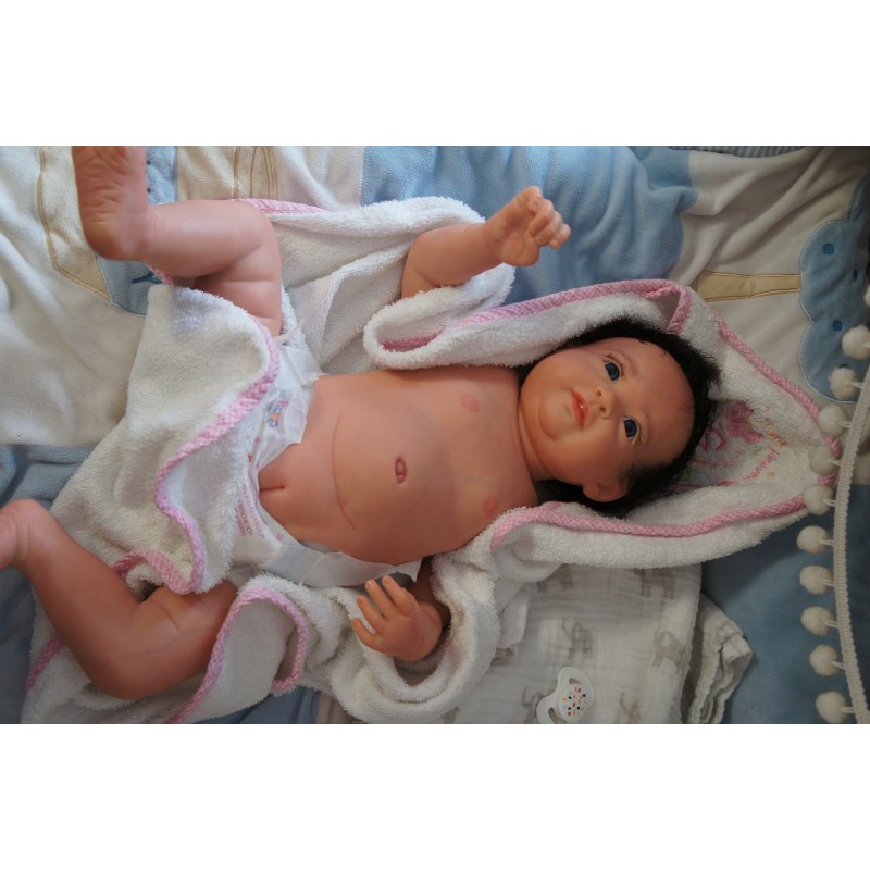 Ich wurde mit hochwertigen Farben in Real Effekt Technik eingefärbt. Mit Genesis Farben habe ich dieses alles noch mal zum Schluss gut versiegelt und eingebrannt. Diese wurde in mehreren Schichten aufgetragen, sodass ein sehr realistisches Hautbild entstanden ist. (Wisch- und Wasserfest kein Abblättern mgl). Feinste Schattierungen und leichte Betonung der Speckfalten wurden bei mir auch nicht vergessen. Leichte Äderchen an Händen, Armen, Füßchen, Beinen, Ohren, Kopf und Gesicht lassen mich wie ein echtes Baby aussehen. Jedes Fältchen an mir wurde einzeln betont. Zarte Augenbrauen wurden mir auch gegeben. Meine Nase wurde geöffnet und hinterlegt, sodass ich jetzt auch gut Luft bekomme. Auch zarte Befeuchtung der Augen, Mund und Nase lassen mich noch echter wirken.