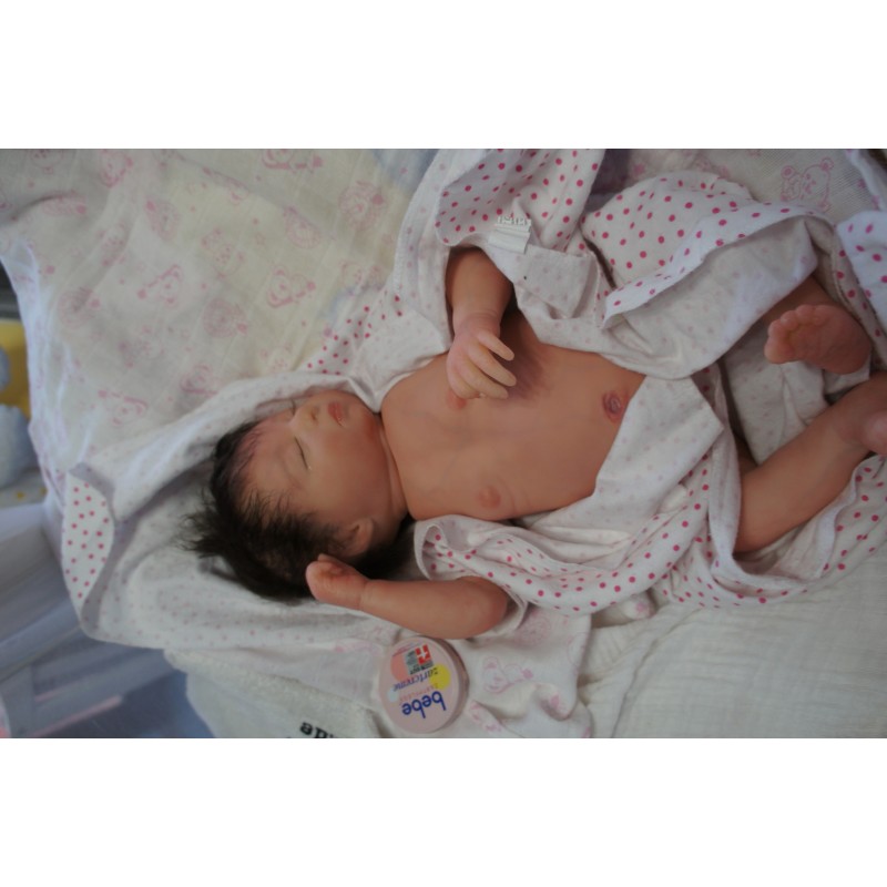 Ich wurde mit hochwertigen Farben in Real Effekt Technik eingefärbt. Mit Genesis Farben habe ich dieses alles noch mal zum Schluss gut versiegelt und eingebrannt. Diese wurde in mehreren Schichten aufgetragen, sodass ein sehr realistisches Hautbild entstanden ist. (Wisch- und Wasserfest kein Abblättern mgl). Feinste Schattierungen und leichte Betonung der Speckfalten wurden bei mir auch nicht vergessen. Leichte Äderchen an Händen, Armen, Füßchen, Beinen, Ohren, Kopf und Gesicht lassen mich wie ein echtes Baby aussehen. Jedes Fältchen an mir wurde einzeln betont. Zarte Augenbrauen wurden mir auch gegeben. Meine Nase wurde geöffnet und hinterlegt, sodass ich jetzt auch gut Luft bekomme. Auch zarte Befeuchtung der Augen, Mund und Nase lassen mich noch echter wirken.