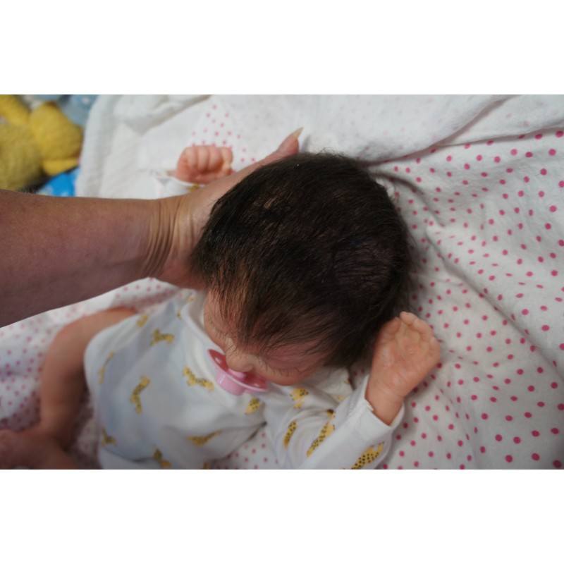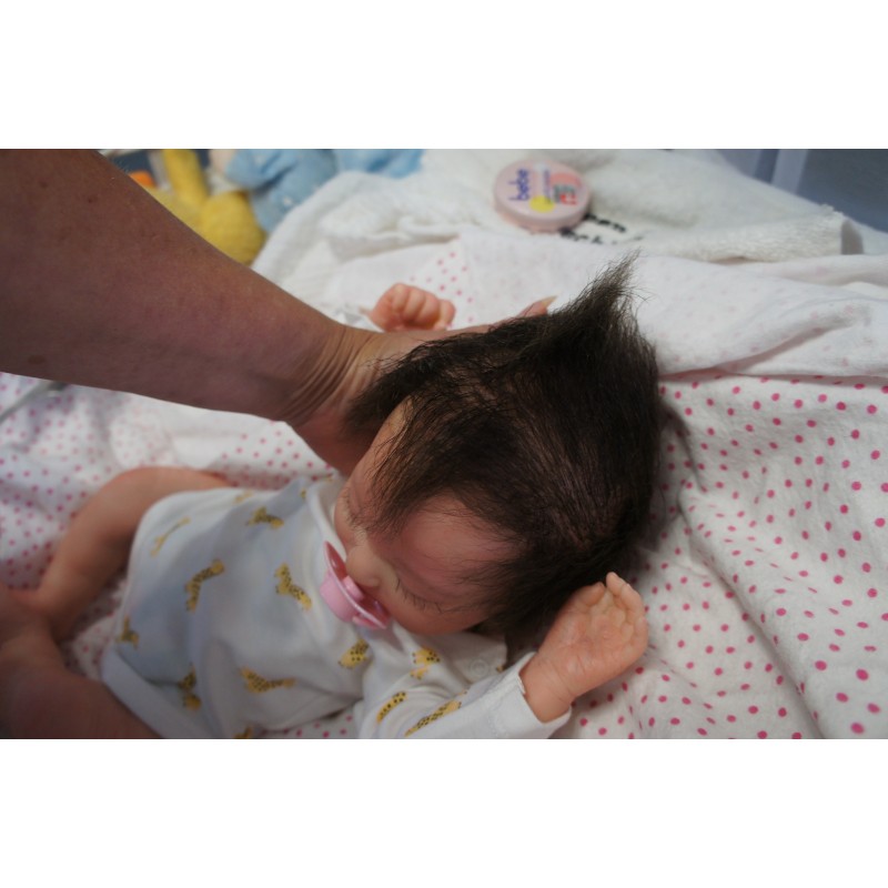 Meine Haare sind dunkelbraun und im micro Rooting Verfahren einzeln eingepflanzt (Feinstes Mohair ). Anschließend natürlich von innen versiegelt. Und nun kann man meine Haare kämmen und auch mal leicht waschen. Die passenden Wimpern habe ich auch dazu gerootet bekommen, das sieht jetzt richtig echt aus. Meine Finger- und Fußnägel wurden fein Pedi- und Manikürt und anschließend dauerhaft versiegelt. Zum Schluss bekam ich noch einen Magnetschnuller. Und ein Duftöl aufgetragen, jetzt riech ich auch noch wie ein echtes Baby.