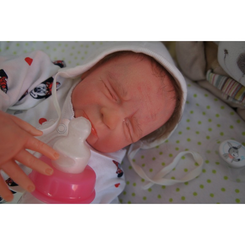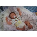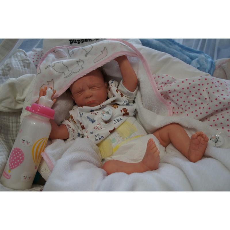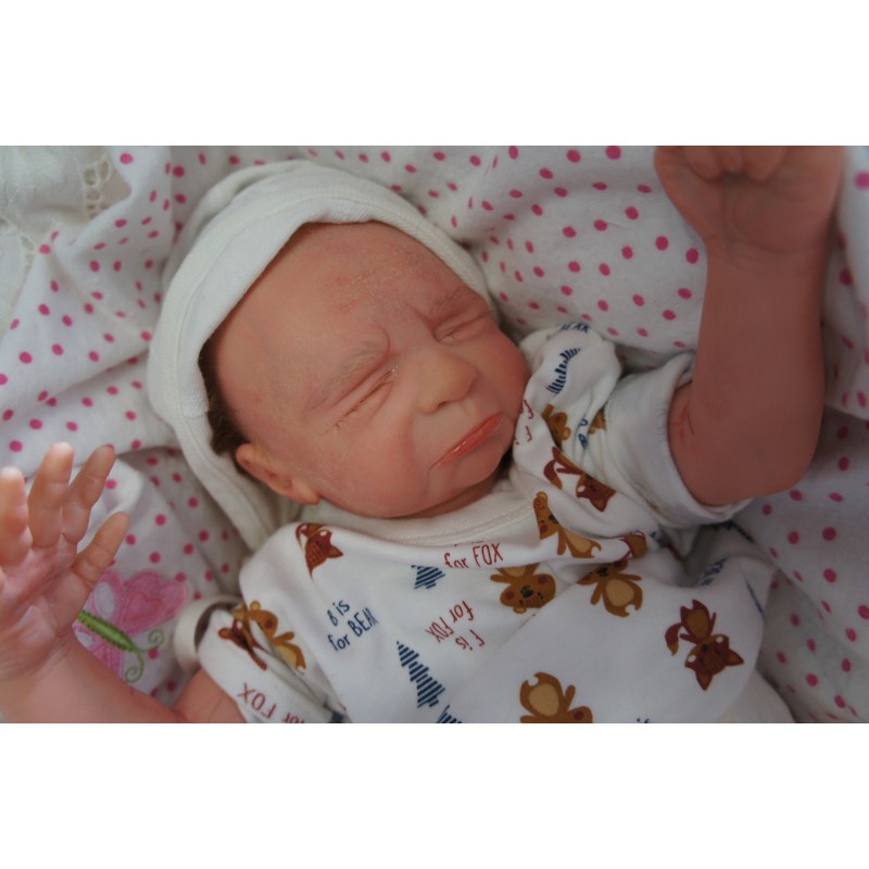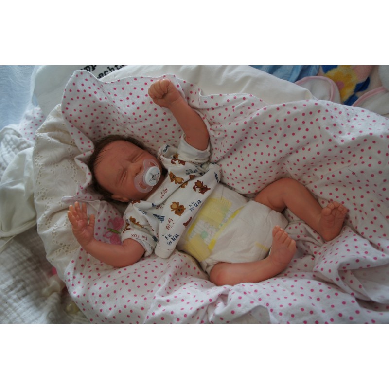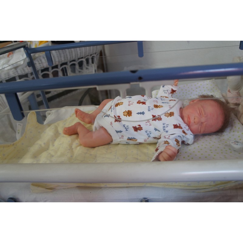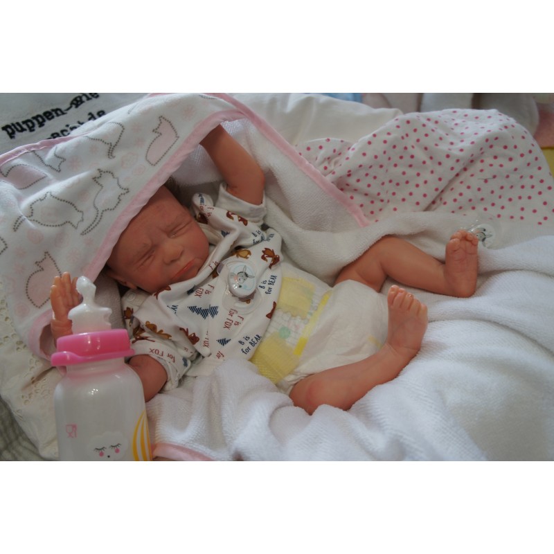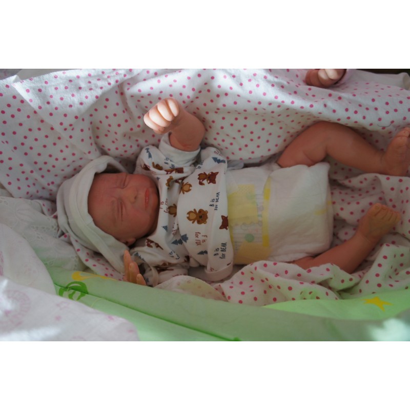 Ich wurde mit hochwertigen Farben in Real Effekt Technik eingefärbt. Mit Genesis Farben habe ich dieses alles noch mal zum Schluss gut versiegelt und eingebrannt. Diese wurde in mehreren Schichten aufgetragen, sodass ein sehr realistisches Hautbild entstanden ist. (Wisch- und Wasserfest kein Abblättern mgl). Feinste Schattierungen und leichte Betonung der Speckfalten wurden bei mir auch nicht vergessen. Leichte Äderchen an Händen, Armen, Füßchen, Beinen, Ohren, Kopf und Gesicht lassen mich wie ein echtes Baby aussehen. Jedes Fältchen an mir wurde einzeln betont. Zarte Augenbrauen wurden mir auch gegeben. Meine Nase wurde geöffnet und hinterlegt, sodass ich jetzt auch gut Luft bekomme. Auch zarte Befeuchtung der Augen, Mund und Nase lassen mich noch echter wirken.
