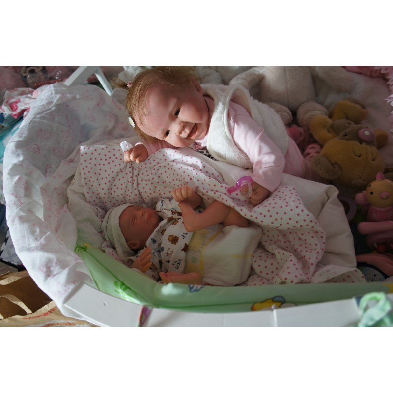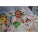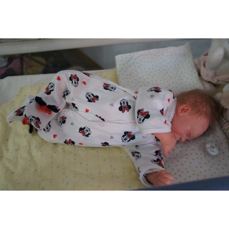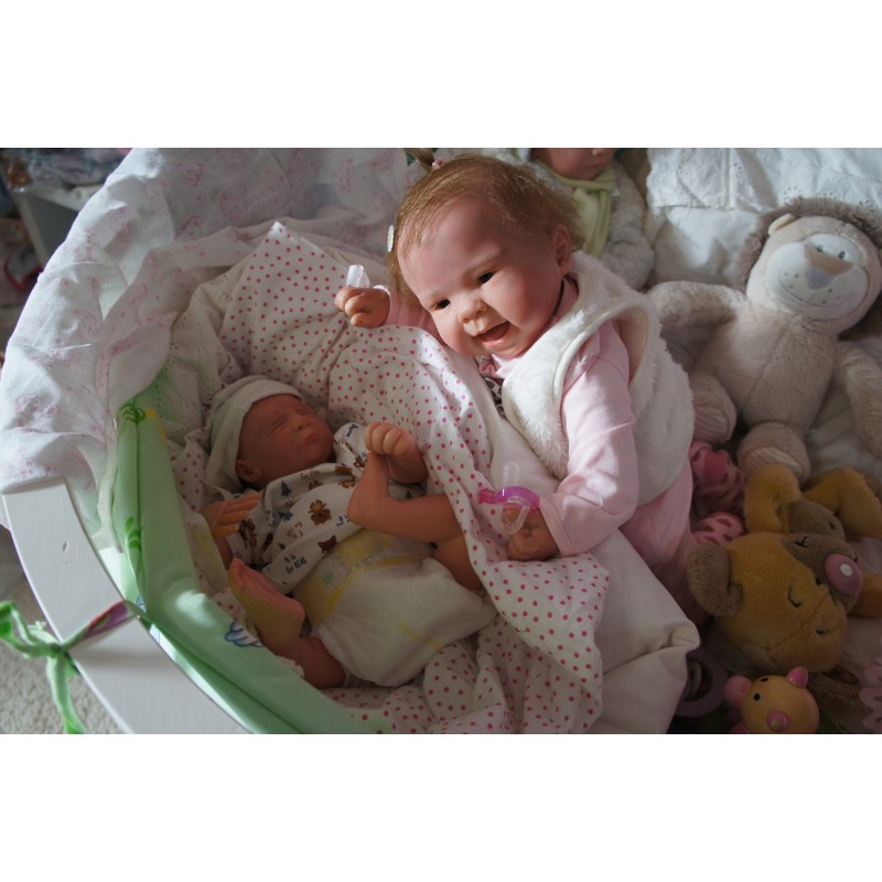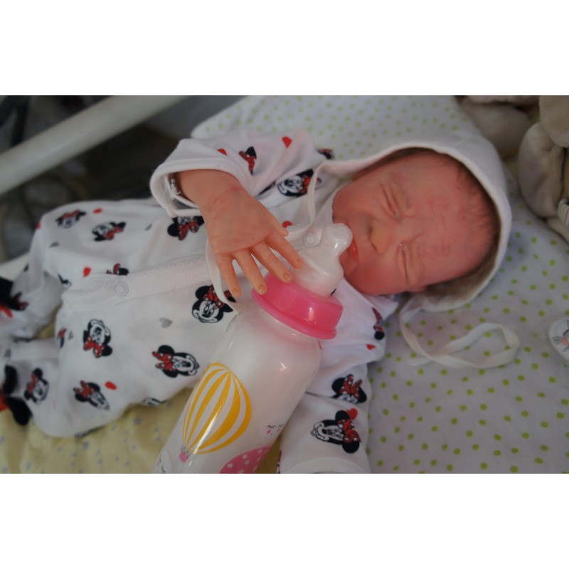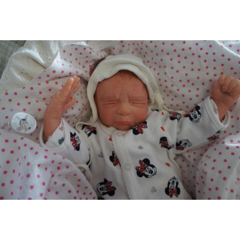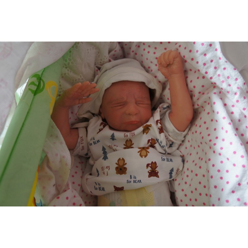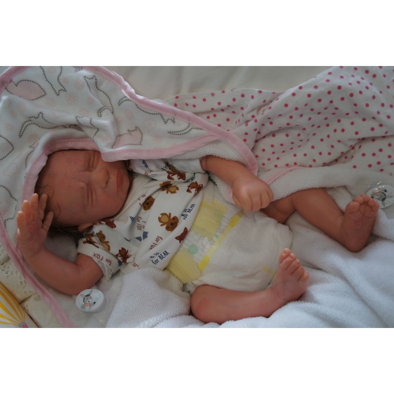 Ich wurde mit hochwertigen Farben in Real Effekt Technik eingefärbt. Mit Genesis Farben habe ich dieses alles noch mal zum Schluss gut versiegelt und eingebrannt. Diese wurde in mehreren Schichten aufgetragen, sodass ein sehr realistisches Hautbild entstanden ist. (Wisch- und Wasserfest kein Abblättern mgl). Feinste Schattierungen und leichte Betonung der Speckfalten wurden bei mir auch nicht vergessen. Leichte Äderchen an Händen, Armen, Füßchen, Beinen, Ohren, Kopf und Gesicht lassen mich wie ein echtes Baby aussehen. Jedes Fältchen an mir wurde einzeln betont. Zarte Augenbrauen wurden mir auch gegeben. Meine Nase wurde geöffnet und hinterlegt, sodass ich jetzt auch gut Luft bekomme. Auch zarte Befeuchtung der Augen, Mund und Nase lassen mich noch echter wirken.