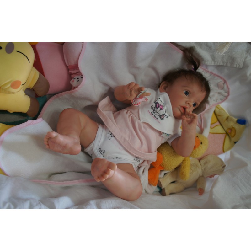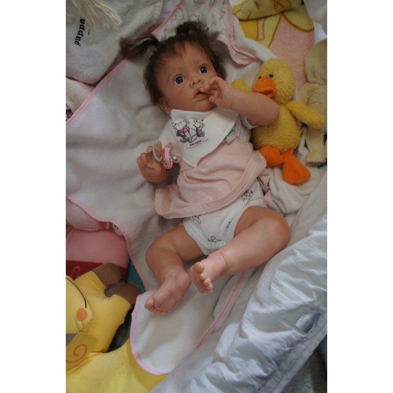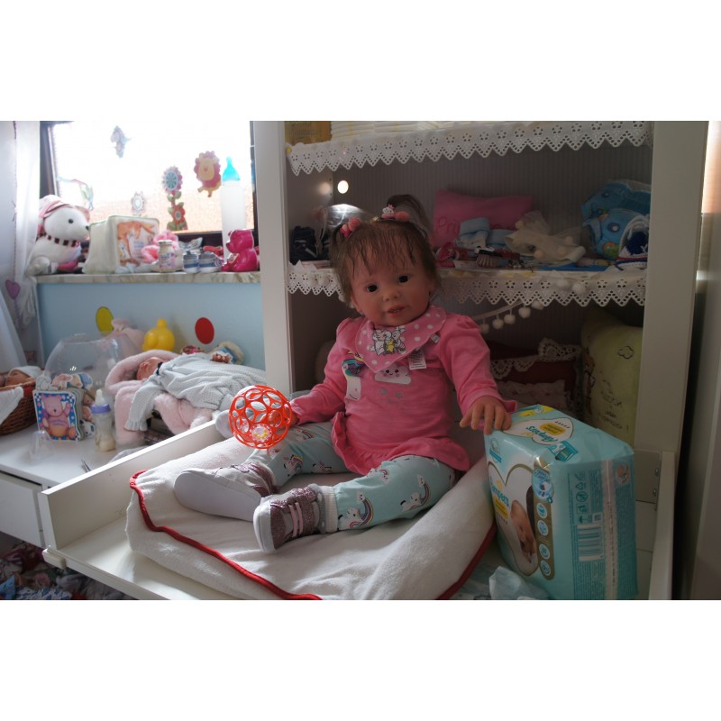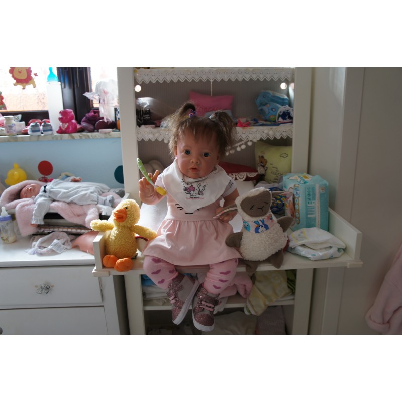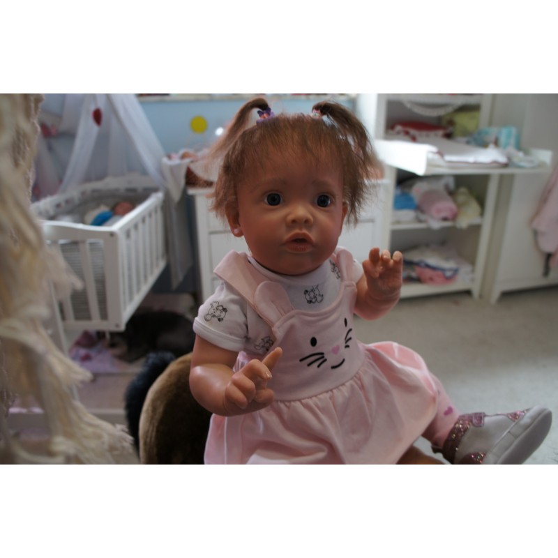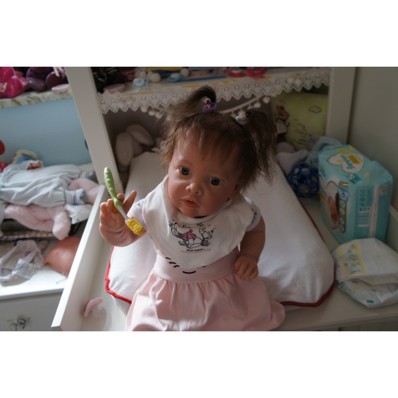Meine Haare sind Mocca und im micro Rooting Verfahren einzeln eingepflanzt (Feinstes "Babyfluff" Mohair ). Anschließend natürlich von innen versiegelt. Und nun kann man meine Haare kämmen und auch mal leicht waschen. Die passenden Wimpern habe ich auch dazu gerootet bekommen, das sieht jetzt richtig echt aus. Meine Finger- und Fußnägel wurden fein Pedi- und Manikürt und anschließend dauerhaft versiegelt. Zum Schluss bekam ich noch einen Magnetschnuller. Und ein Duftöl aufgetragen, jetzt riech ich auch noch wie ein echtes Baby.