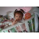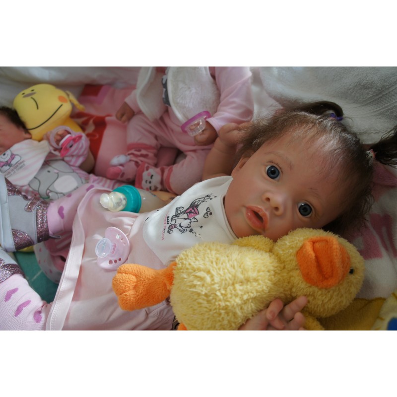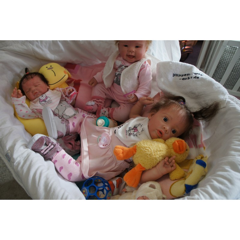 Ich wurde mit hochwertigen Farben in Real Effekt Technik eingefärbt. Mit Genesis Farben habe ich dieses alles noch mal zum Schluss gut versiegelt und eingebrannt. Diese wurde in mehreren Schichten aufgetragen, sodass ein sehr realistisches Hautbild entstanden ist. (Wisch- und Wasserfest kein Abblättern mgl). Feinste Schattierungen und leichte Betonung der Speckfalten wurden bei mir auch nicht vergessen. Leichte Äderchen an Händen, Armen, Füßchen, Beinen, Ohren, Kopf und Gesicht lassen mich wie ein echtes Baby aussehen. Jedes Fältchen an mir wurde einzeln betont. Zarte Augenbrauen wurden mir auch gegeben. Meine Nase wurde geöffnet und hinterlegt, sodass ich jetzt auch gut Luft bekomme. Auch zarte Befeuchtung der Augen, Mund und Nase lassen mich noch echter wirken.