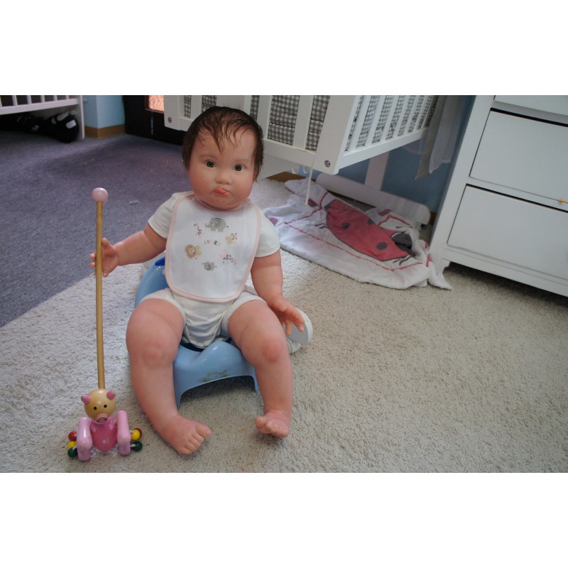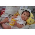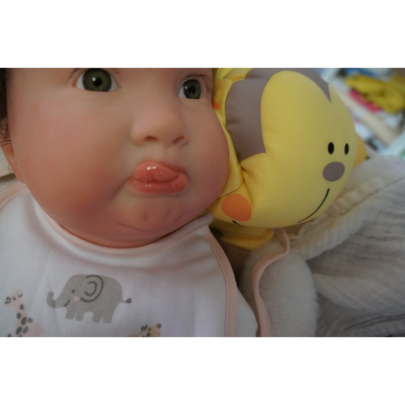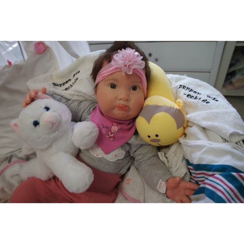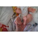 Ich wurde mit hochwertigen Farben in Real Effekt Technik eingefärbt. Mit Genesis Farben habe ich dieses alles noch mal zum Schluss gut versiegelt und eingebrannt. Diese wurde in mehreren Schichten aufgetragen, sodass ein sehr realistisches Hautbild entstanden ist. (Wisch- und Wasserfest kein Abblättern mgl). Feinste Schattierungen und leichte Betonung der Speckfalten wurden bei mir auch nicht vergessen. Leichte Äderchen an Händen, Armen, Füßchen, Beinen, Ohren, Kopf und Gesicht lassen mich wie ein echtes Baby aussehen. Jedes Fältchen an mir wurde einzeln betont. Zarte Augenbrauen wurden mir auch gegeben. Meine Nase wurde geöffnet und hinterlegt, sodass ich jetzt auch gut Luft bekomme. Auch zarte Befeuchtung der Augen, Mund und Nase lassen mich noch echter wirken.