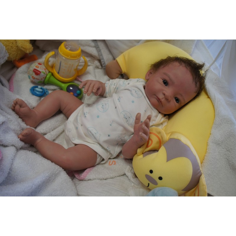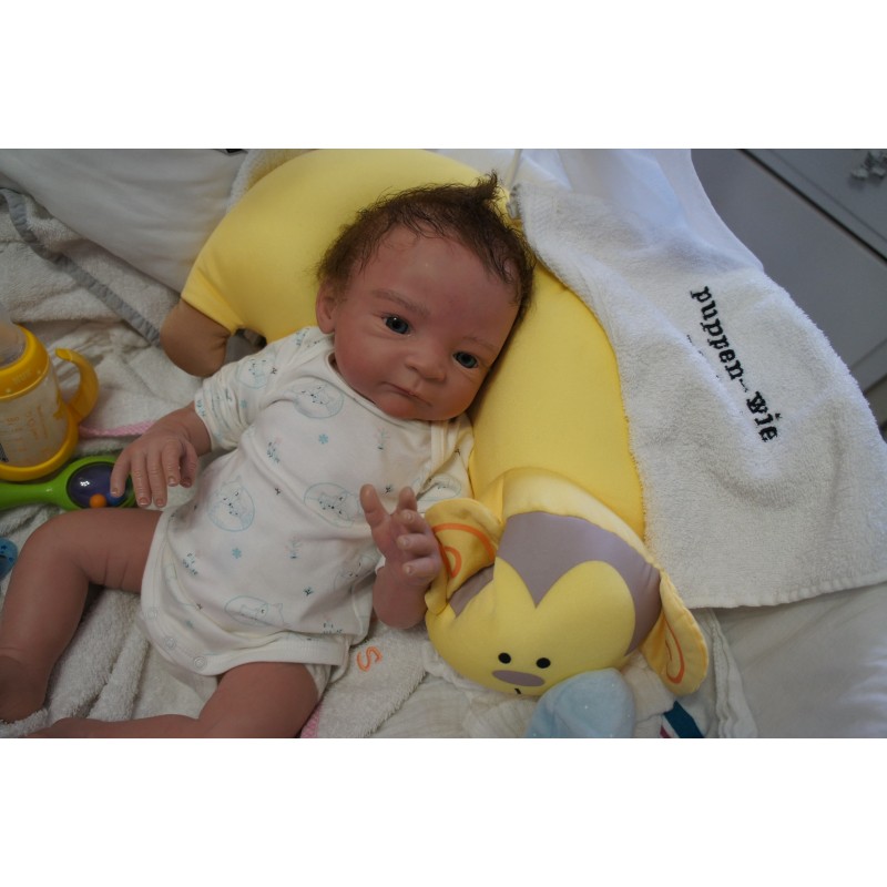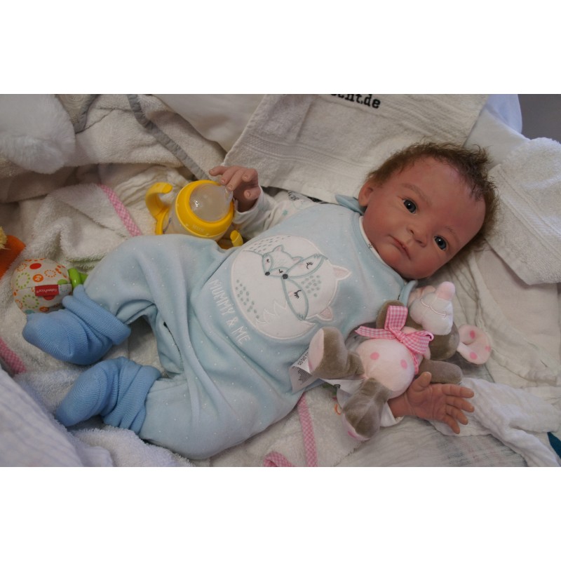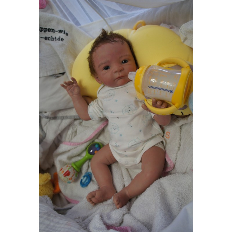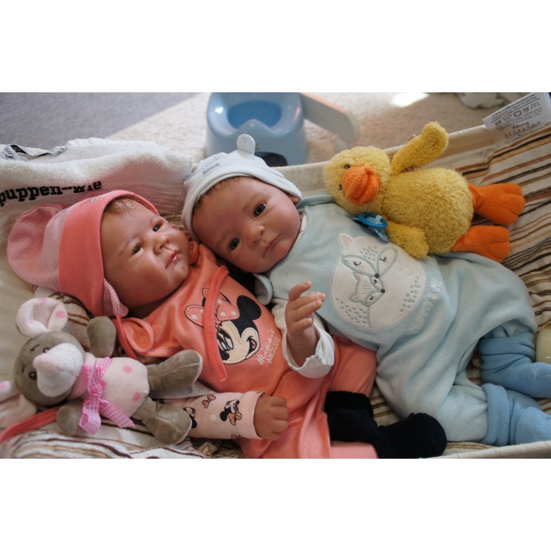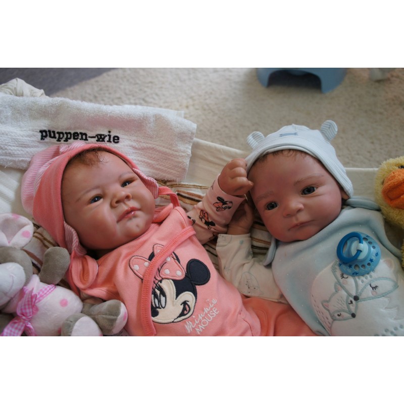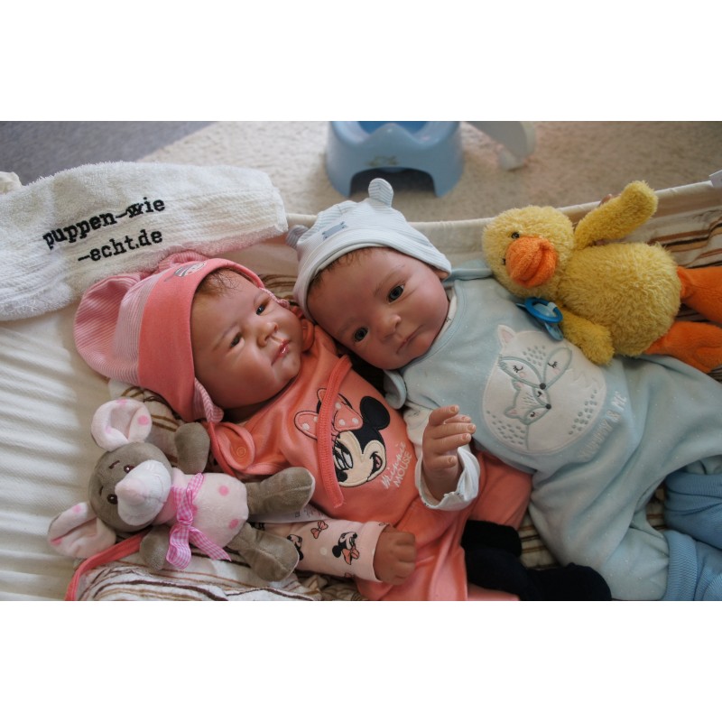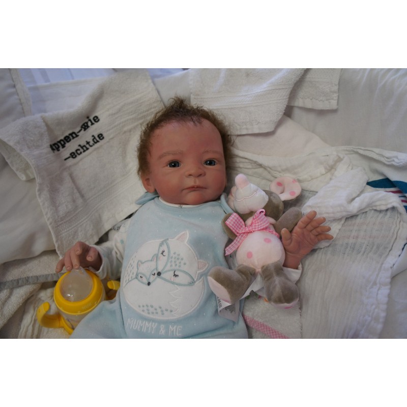 Wir wurden mit hochwertigen Farben in Real Effekt Technik eingefärbt. Mit Genesis Farben habe ich dieses alles noch mal zum Schluss gut versiegelt und eingebrannt. Diese wurde in mehreren Schichten aufgetragen, sodass ein sehr realistisches Hautbild entstanden ist. (Wisch- und Wasserfest kein Abblättern mgl). Feinste Schattierungen und leichte Betonung der Speckfalten wurden bei uns auch nicht vergessen. Leichte Äderchen an Händen, Armen, Füßchen, Beinen, Ohren, Kopf und Gesicht lassen uns wie ein echtes Baby aussehen. Jedes Fältchen an uns wurde einzeln betont. Zarte Augenbrauen wurden uns auch gegeben. Unsere Nase wurde geöffnet und hinterlegt, sodass wir jetzt auch gut Luft bekommen. Auch zarte Befeuchtung der Augen, Mund und Nase lassen uns noch echter wirken.