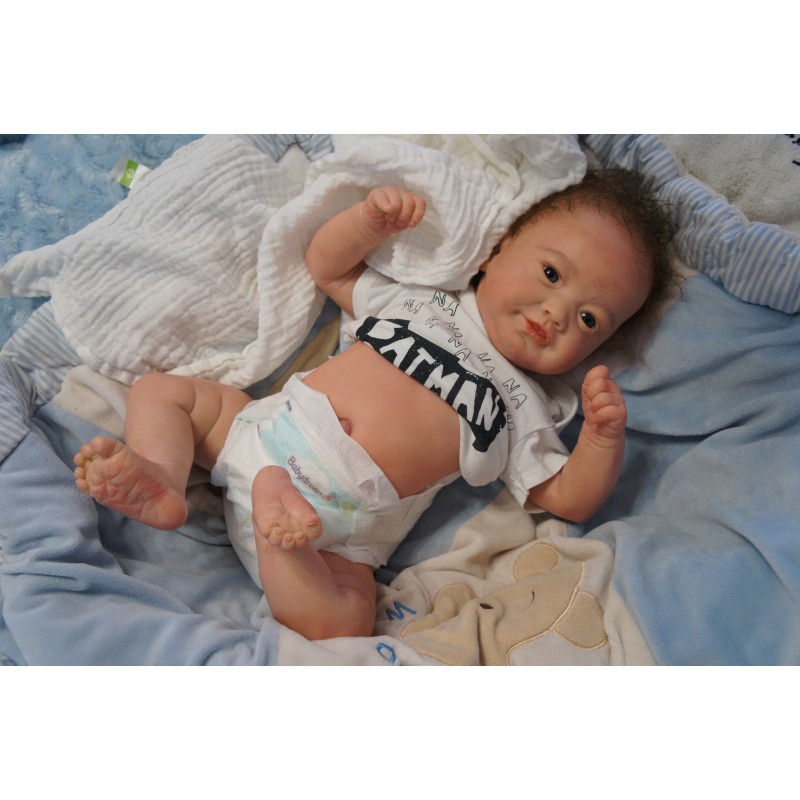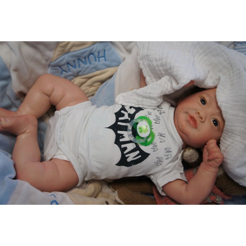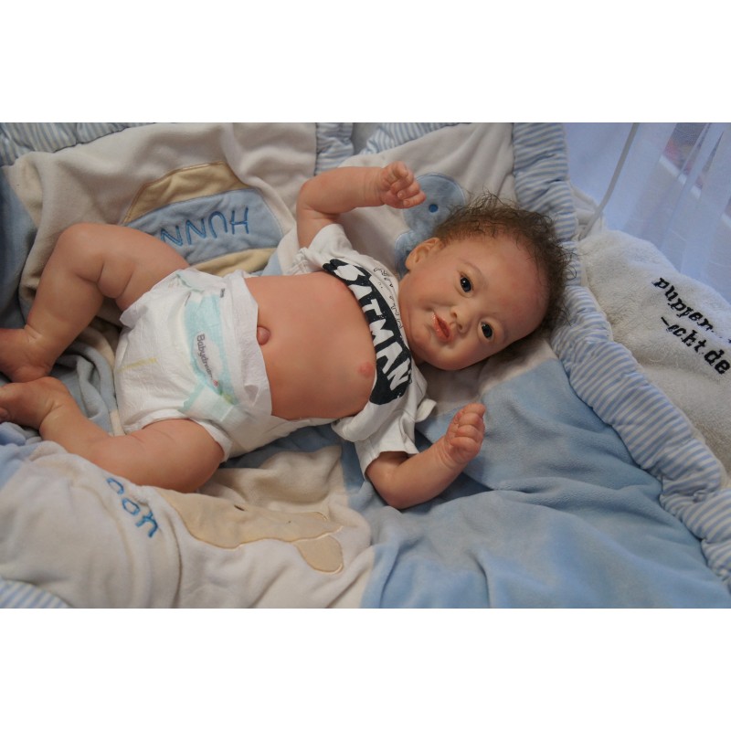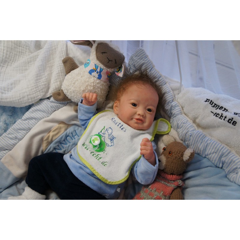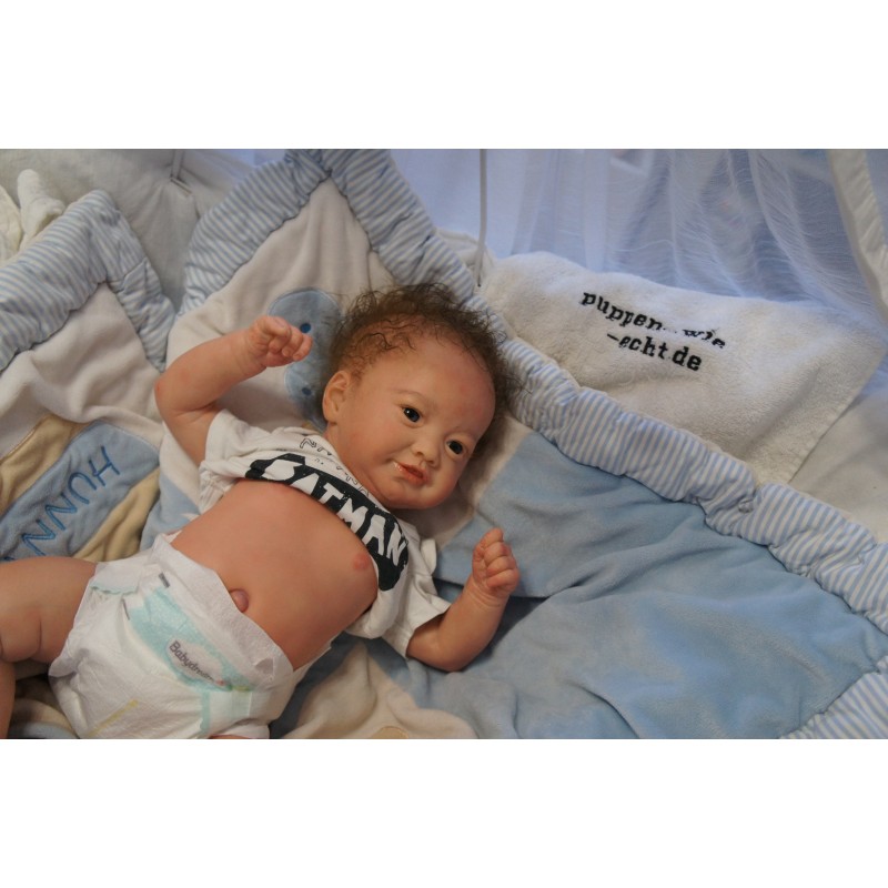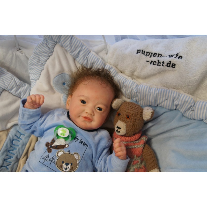 Ich wurde mit hochwertigen Farben in Real Effekt Technik eingefärbt. Mit Genesis Farben habe ich dieses alles noch mal zum Schluss gut versiegelt und eingebrannt. Diese wurde in mehreren Schichten aufgetragen, sodass ein sehr realistisches Hautbild entstanden ist. (Wisch- und Wasserfest kein Abblättern mgl). Feinste Schattierungen und leichte Betonung der Speckfalten wurden bei mir auch nicht vergessen. Leichte Äderchen an Händen, Armen, Füßchen, Beinen, Ohren, Kopf und Gesicht lassen mich wie ein echtes Baby aussehen. Jedes Fältchen an mir wurde einzeln betont. Zarte Augenbrauen wurden mir auch gegeben. Meine Nase wurde geöffnet und hinterlegt, sodass ich jetzt auch gut Luft bekomme. Auch zarte Befeuchtung der Augen, Mund und Nase lassen mich noch echter wirken.