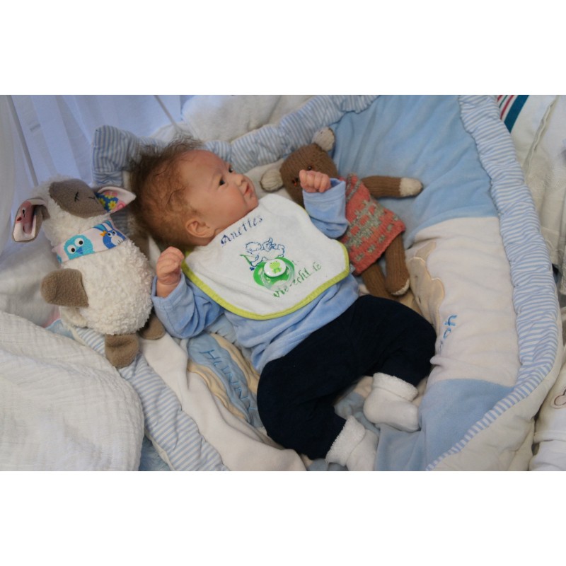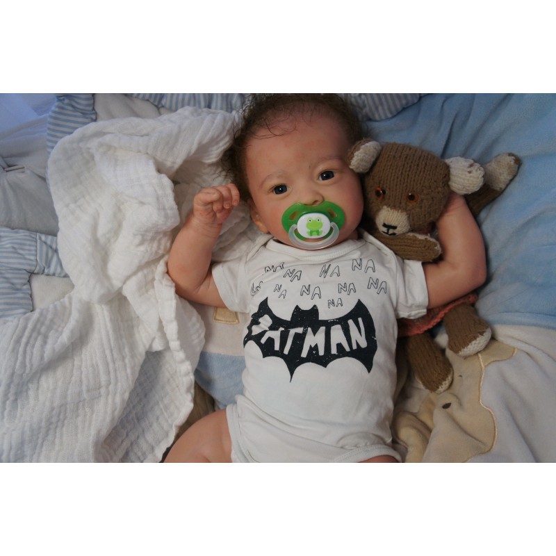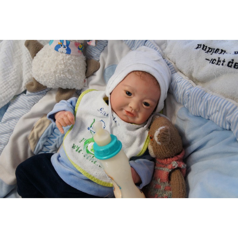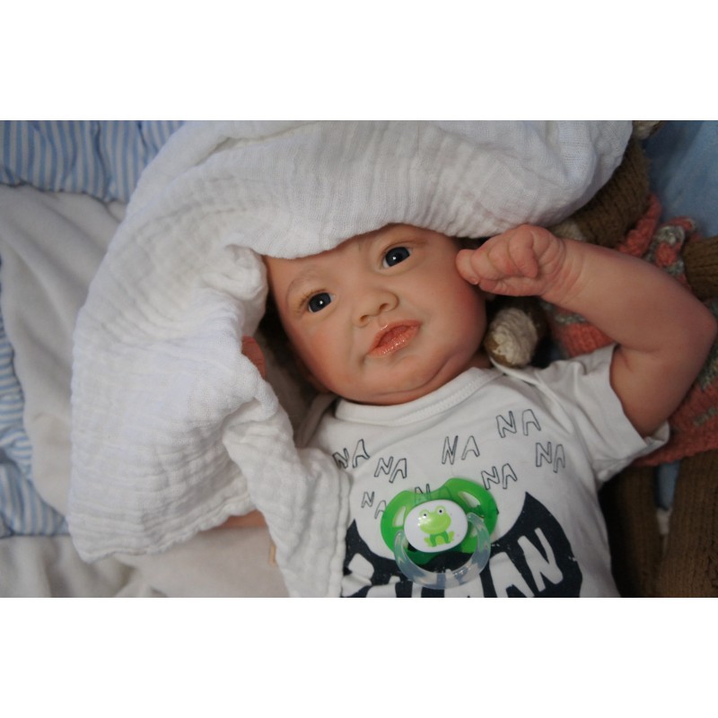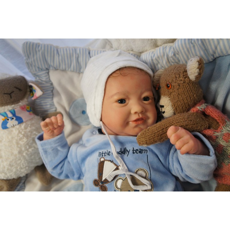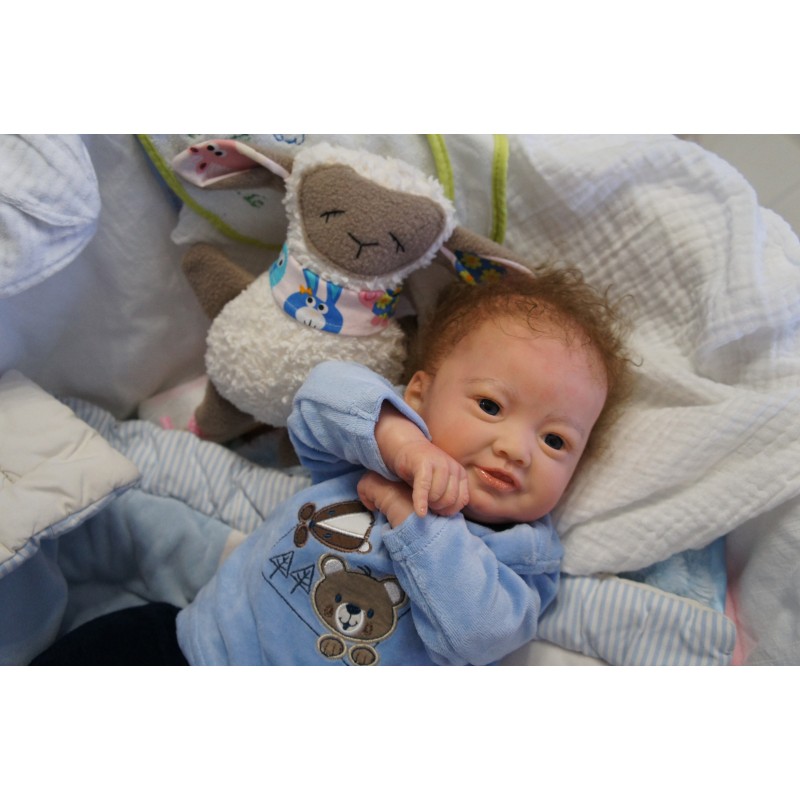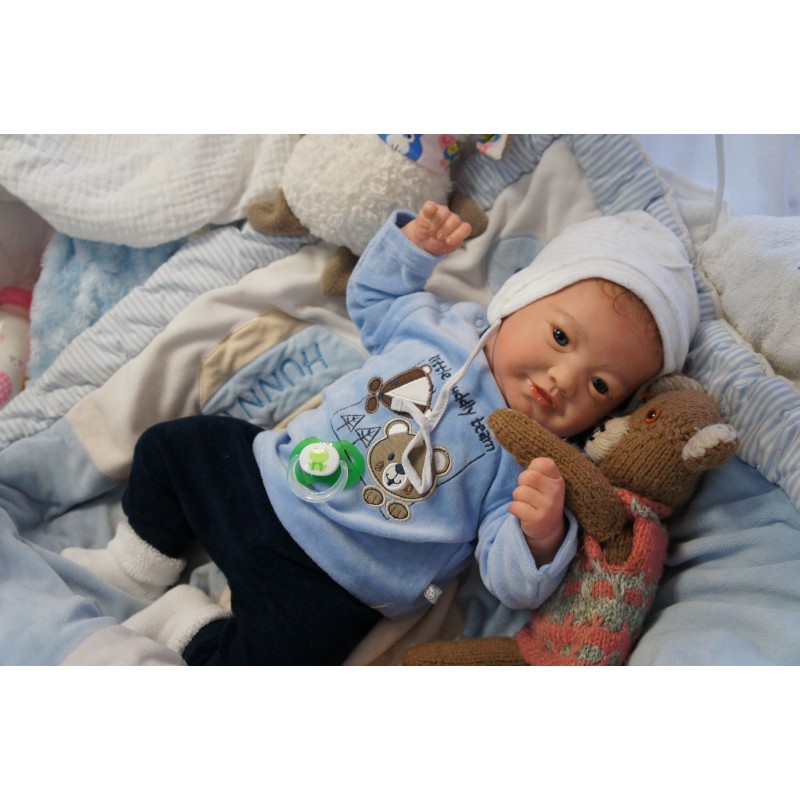 Ich wurde mit hochwertigen Farben in Real Effekt Technik eingefärbt. Mit Genesis Farben habe ich dieses alles noch mal zum Schluss gut versiegelt und eingebrannt. Diese wurde in mehreren Schichten aufgetragen, sodass ein sehr realistisches Hautbild entstanden ist. (Wisch- und Wasserfest kein Abblättern mgl). Feinste Schattierungen und leichte Betonung der Speckfalten wurden bei mir auch nicht vergessen. Leichte Äderchen an Händen, Armen, Füßchen, Beinen, Ohren, Kopf und Gesicht lassen mich wie ein echtes Baby aussehen. Jedes Fältchen an mir wurde einzeln betont. Zarte Augenbrauen wurden mir auch gegeben. Meine Nase wurde geöffnet und hinterlegt, sodass ich jetzt auch gut Luft bekomme. Auch zarte Befeuchtung der Augen, Mund und Nase lassen mich noch echter wirken.