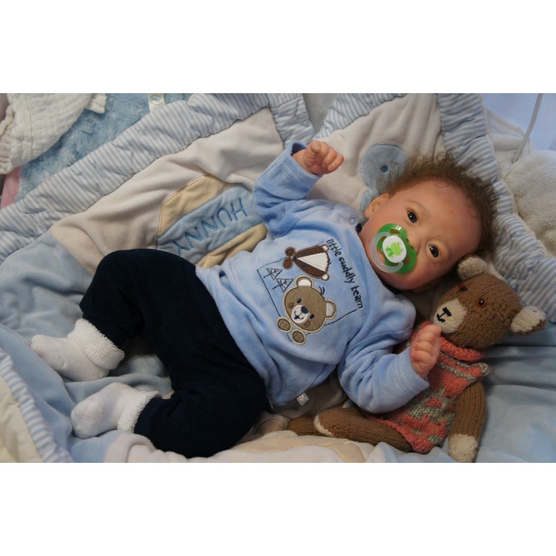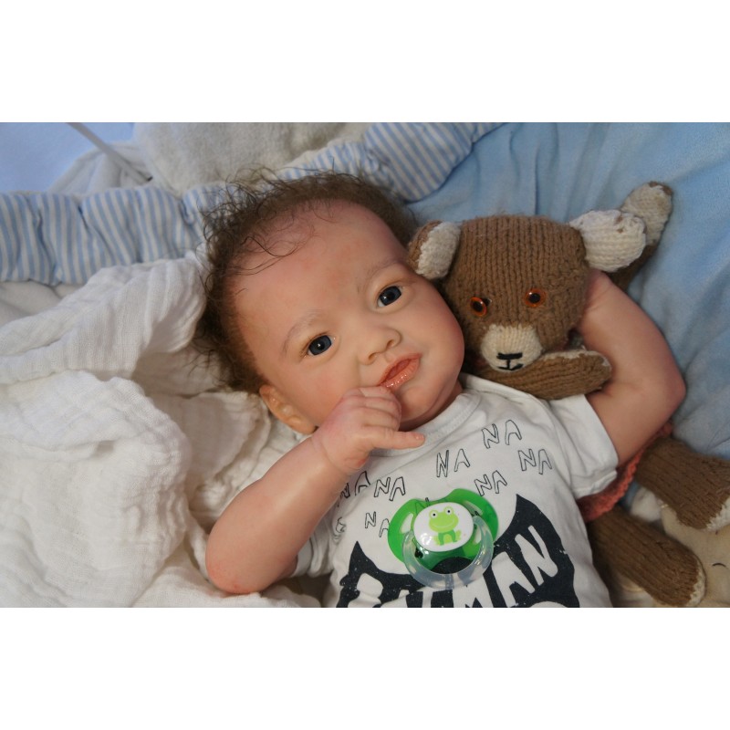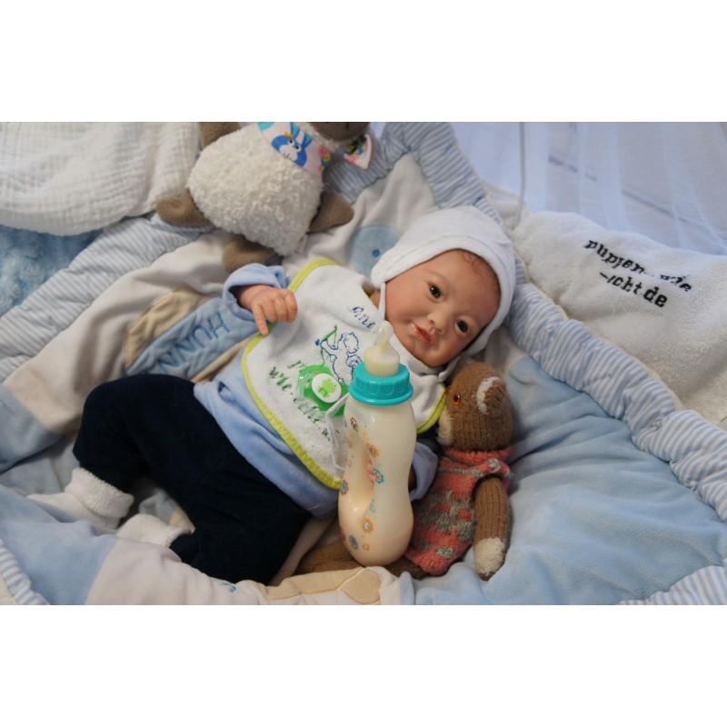 Meine Haare sind mittelbraun und im micro Rooting Verfahren einzeln eingepflanzt (Feinstes Mohair ). Anschließend natürlich von innen versiegelt. Und nun kann man meine Haare kämmen und auch mal leicht waschen. Die passenden Wimpern habe ich auch dazu gerootet bekommen, das sieht jetzt richtig echt aus. Meine Finger- und Fußnägel wurden fein Pedi- und Manikürt und anschließend dauerhaft versiegelt. Zum Schluss bekam ich noch einen Magnetschnuller. Und ein Duftöl aufgetragen, jetzt riech ich auch noch wie ein echtes Baby.