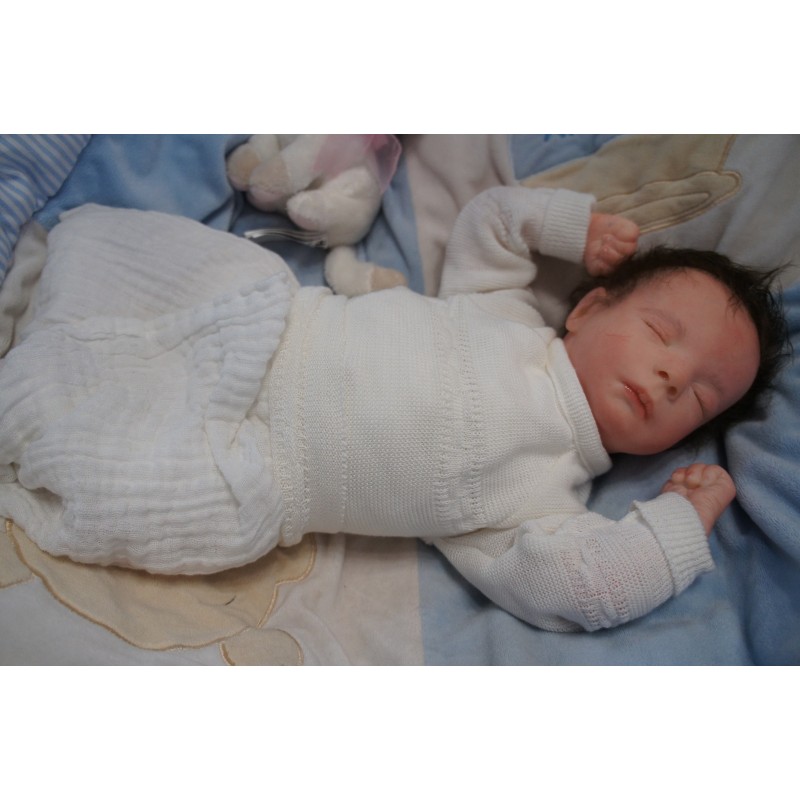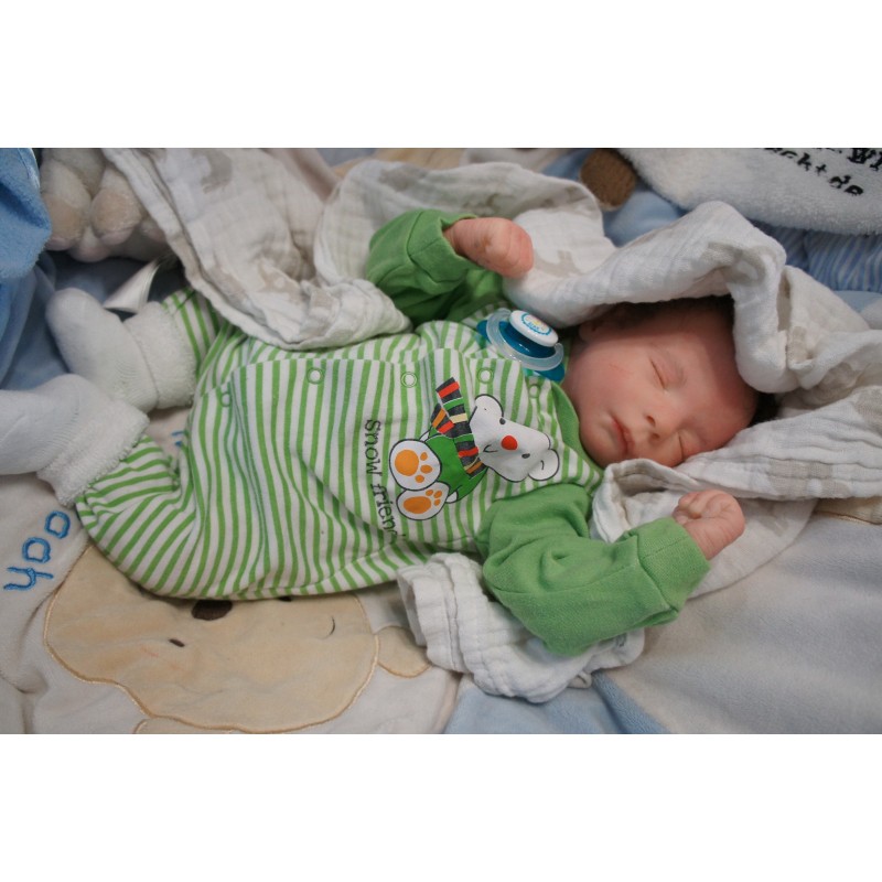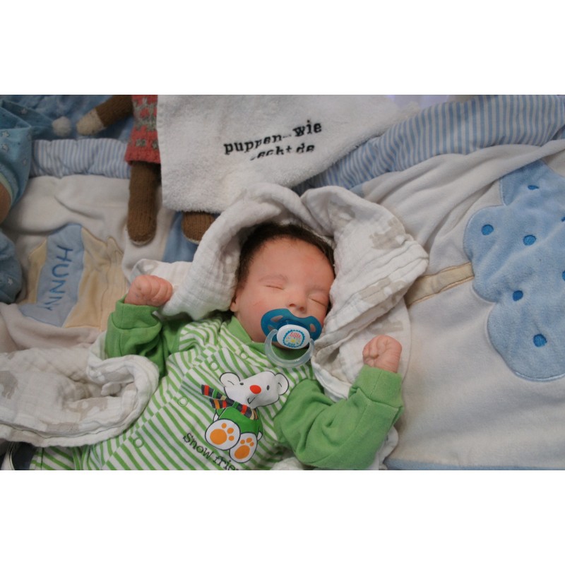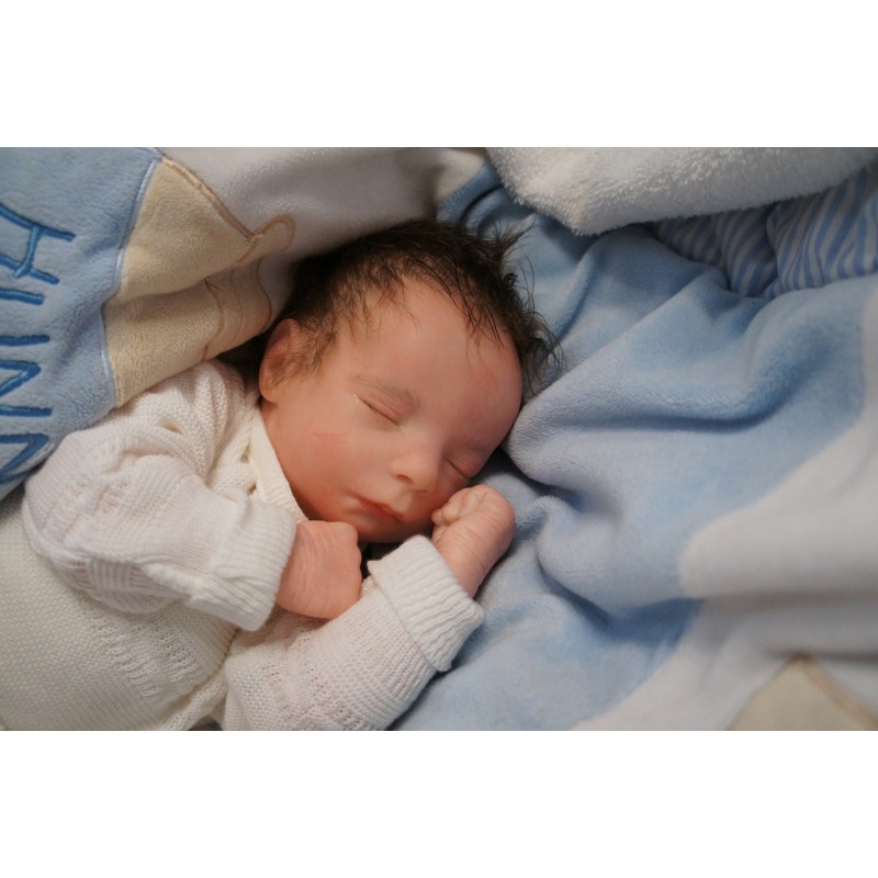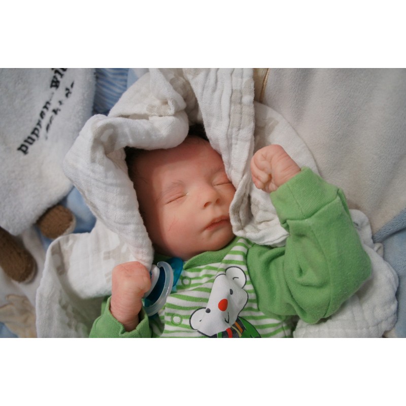 Ich wurde mit hochwertigen Farben in Real Effekt Technik eingefärbt. Mit Genesis Farben habe ich dieses alles noch mal zum Schluss gut versiegelt und eingebrannt. Diese wurde in mehreren Schichten aufgetragen, sodass ein sehr realistisches Hautbild entstanden ist. (Wisch- und Wasserfest kein Abblättern mgl). Feinste Schattierungen und leichte Betonung der Speckfalten wurden bei mir auch nicht vergessen. Leichte Äderchen an Händen, Armen, Füßchen, Beinen, Ohren, Kopf und Gesicht lassen mich wie ein echtes Baby aussehen. Jedes Fältchen an mir wurde einzeln betont. Zarte Augenbrauen wurden mir auch gegeben. Meine Nase wurde geöffnet und hinterlegt, sodass ich jetzt auch gut Luft bekomme. Auch zarte Befeuchtung der Augen, Mund und Nase lassen mich noch echter wirken.