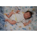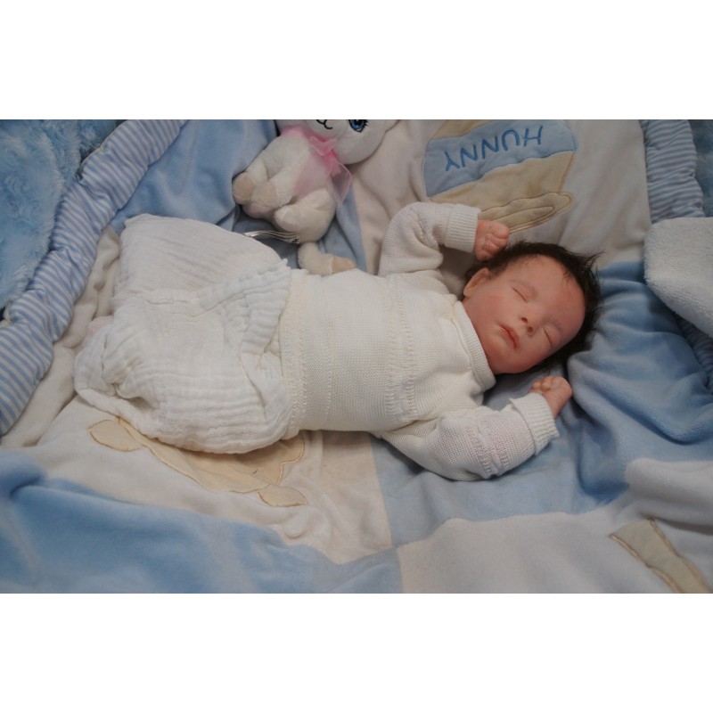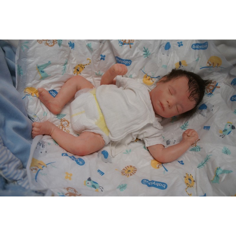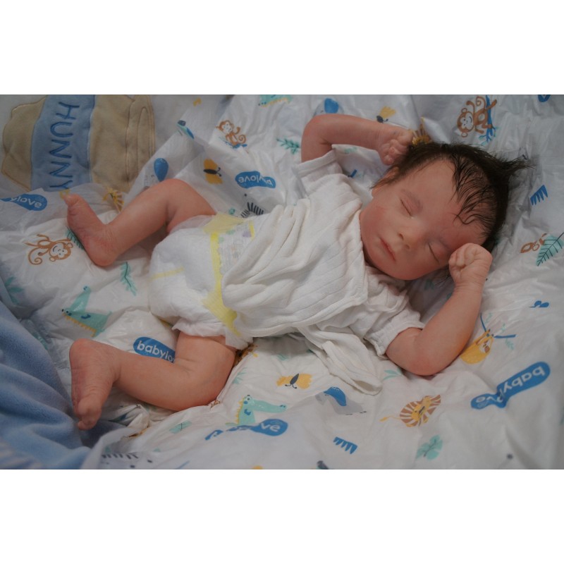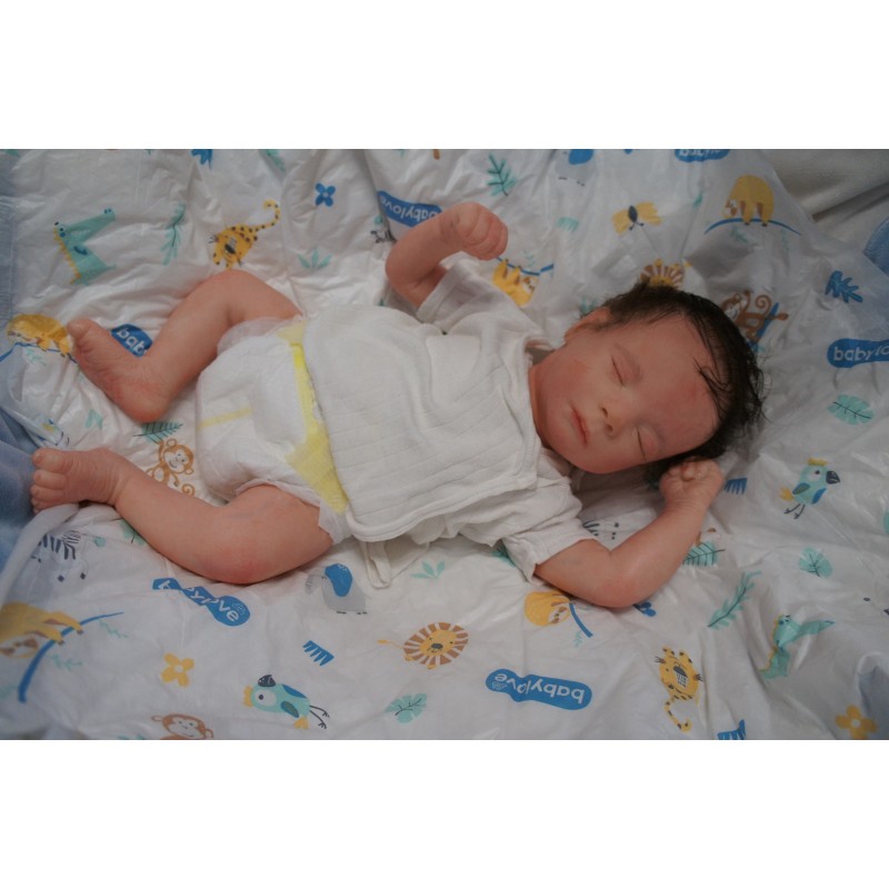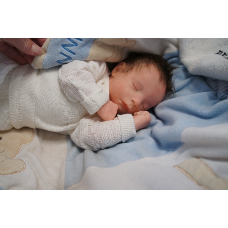 Ich wurde mit hochwertigen Farben in Real Effekt Technik eingefärbt. Mit Genesis Farben habe ich dieses alles noch mal zum Schluss gut versiegelt und eingebrannt. Diese wurde in mehreren Schichten aufgetragen, sodass ein sehr realistisches Hautbild entstanden ist. (Wisch- und Wasserfest kein Abblättern mgl). Feinste Schattierungen und leichte Betonung der Speckfalten wurden bei mir auch nicht vergessen. Leichte Äderchen an Händen, Armen, Füßchen, Beinen, Ohren, Kopf und Gesicht lassen mich wie ein echtes Baby aussehen. Jedes Fältchen an mir wurde einzeln betont. Zarte Augenbrauen wurden mir auch gegeben. Meine Nase wurde geöffnet und hinterlegt, sodass ich jetzt auch gut Luft bekomme. Auch zarte Befeuchtung der Augen, Mund und Nase lassen mich noch echter wirken.