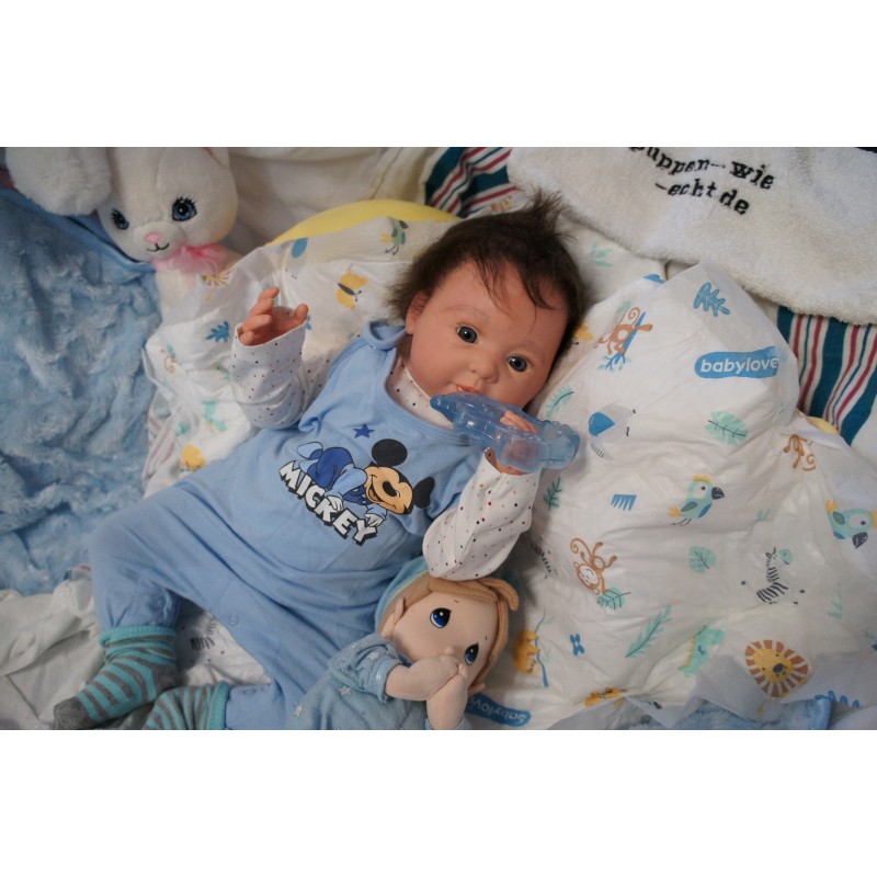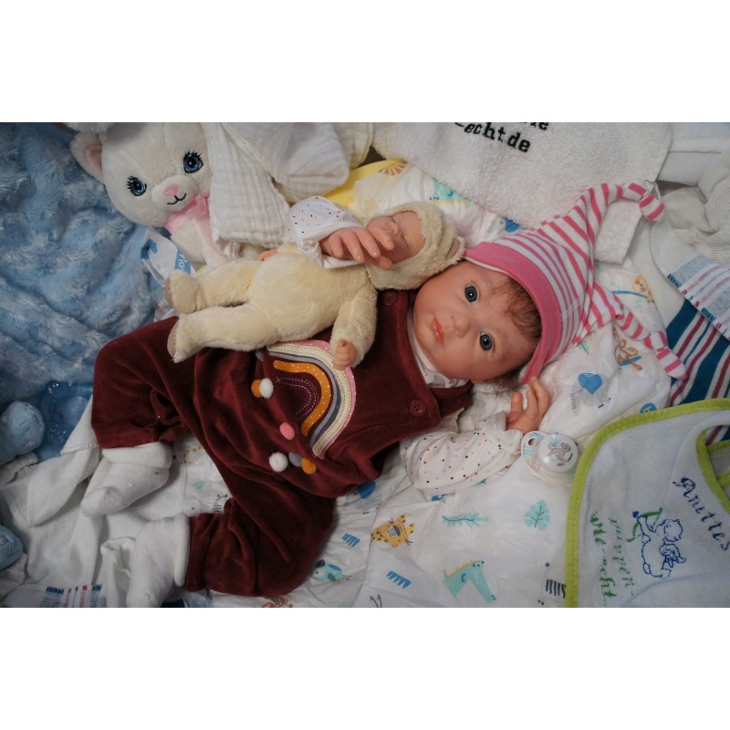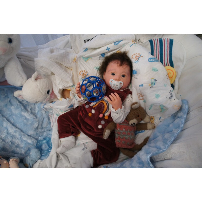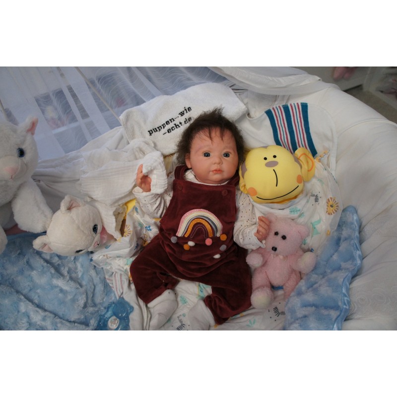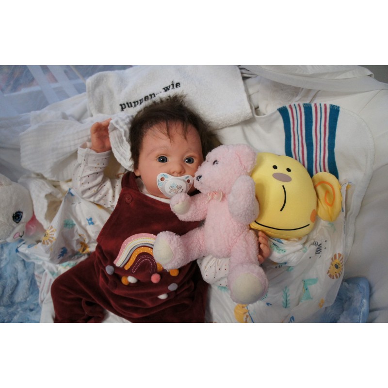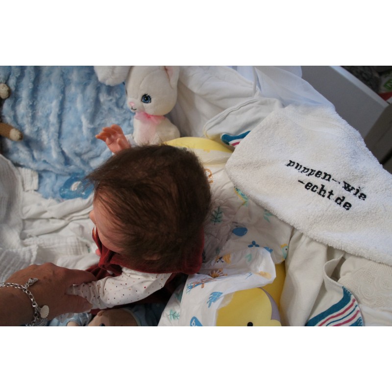 Meine Haare sind dunkelbraun und im micro Rooting Verfahren einzeln eingepflanzt (Feinstes Babyfluff Mohair ). Anschließend natürlich von innen versiegelt. Und nun kann man meine Haare kämmen und auch mal leicht waschen. Die passenden Wimpern habe ich auch dazu gerootet bekommen, das sieht jetzt richtig echt aus. Meine Finger- und Fußnägel wurden fein Pedi- und Manikürt und anschließend dauerhaft versiegelt. Zum Schluss bekam ich noch einen Magnetschnuller. Und ein Duftöl aufgetragen, jetzt riech ich auch noch wie ein echtes Baby.