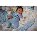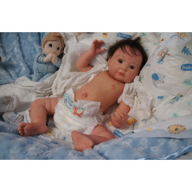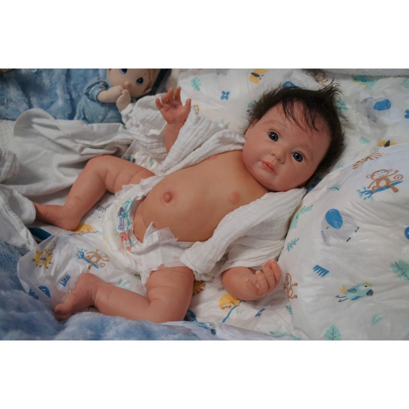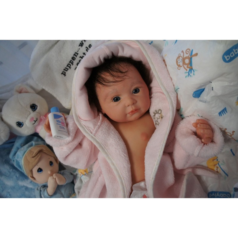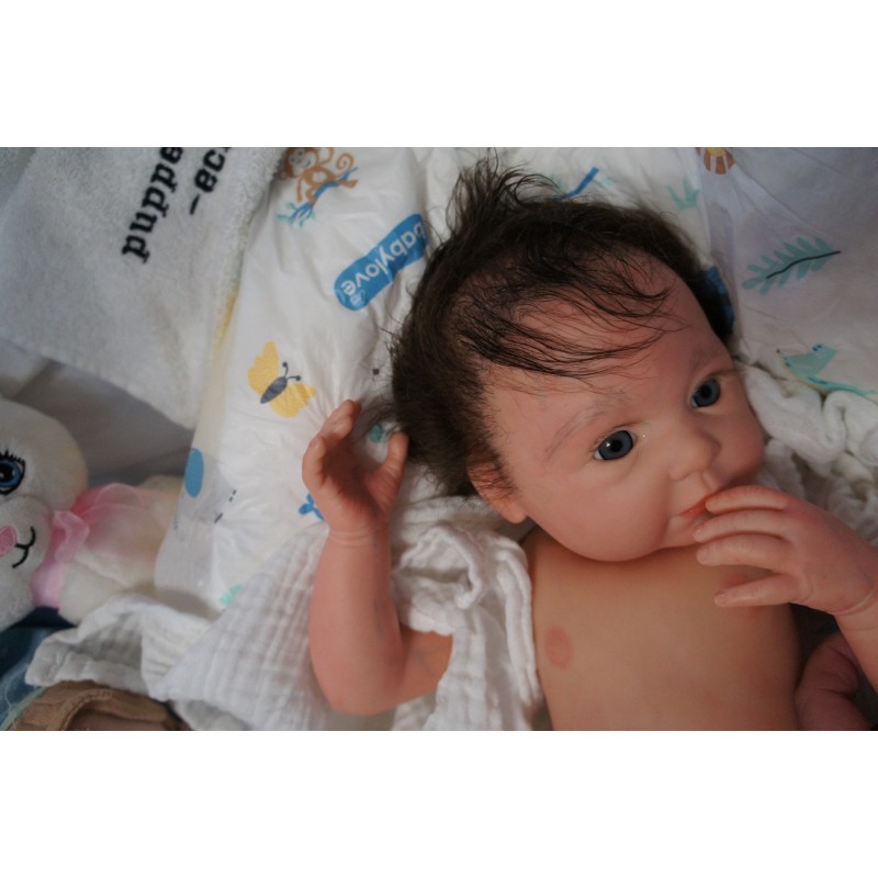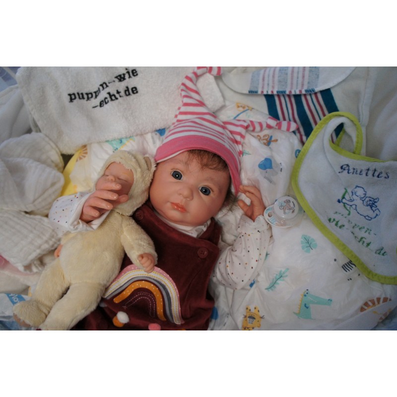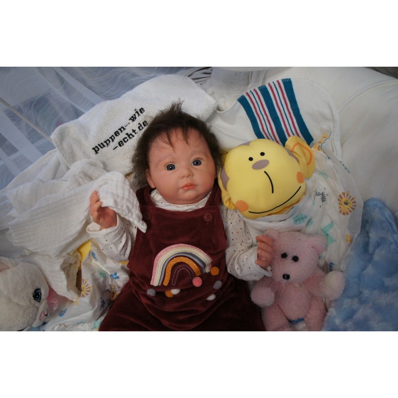 Ich wurde mit hochwertigen Farben in Real Effekt Technik eingefärbt. Mit Genesis Farben habe ich dieses alles noch mal zum Schluss gut versiegelt und eingebrannt. Diese wurde in mehreren Schichten aufgetragen, sodass ein sehr realistisches Hautbild entstanden ist. (Wisch- und Wasserfest kein Abblättern mgl). Feinste Schattierungen und leichte Betonung der Speckfalten wurden bei mir auch nicht vergessen. Leichte Äderchen an Händen, Armen, Füßchen, Beinen, Ohren, Kopf und Gesicht lassen mich wie ein echtes Baby aussehen. Jedes Fältchen an mir wurde einzeln betont. Zarte Augenbrauen wurden mir auch gegeben. Meine Nase wurde geöffnet und hinterlegt, sodass ich jetzt auch gut Luft bekomme. Auch zarte Befeuchtung der Augen, Mund und Nase lassen mich noch echter wirken.