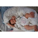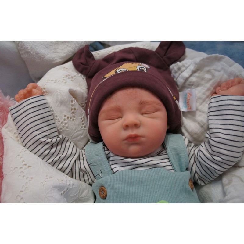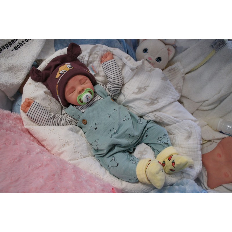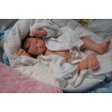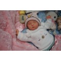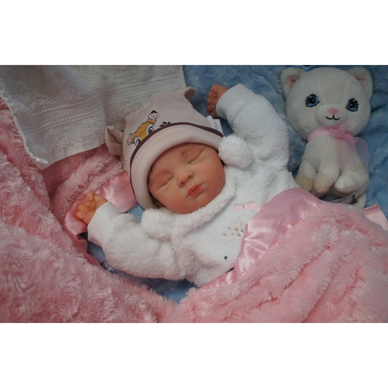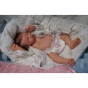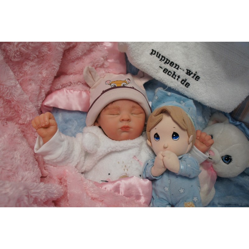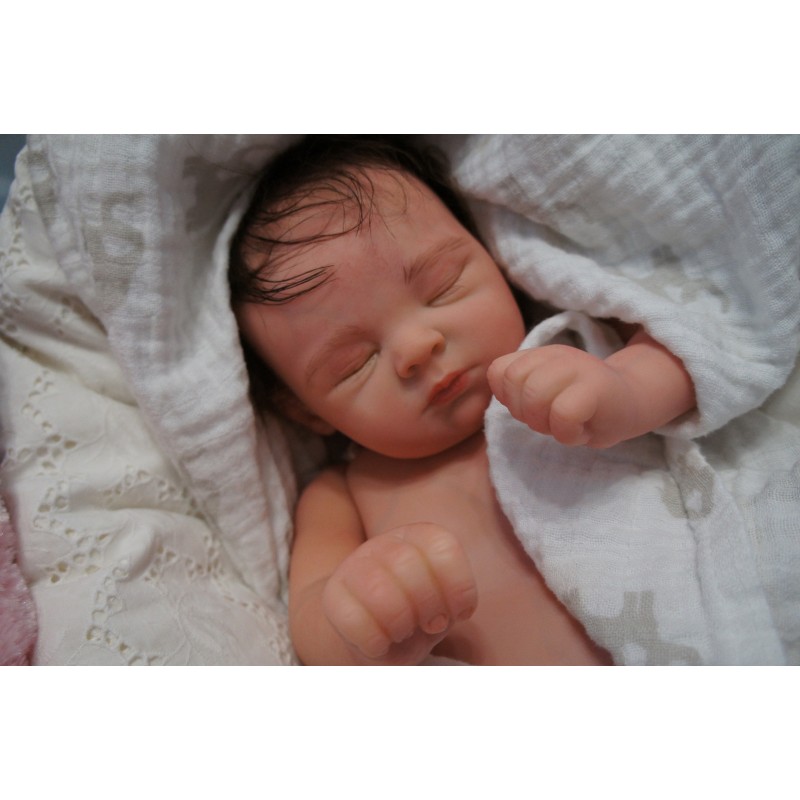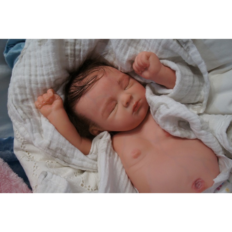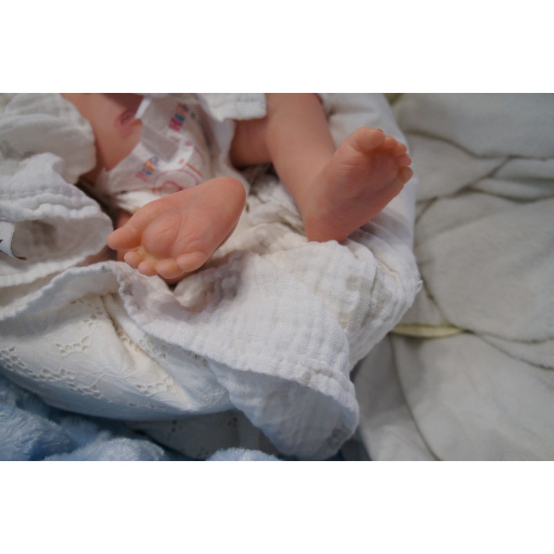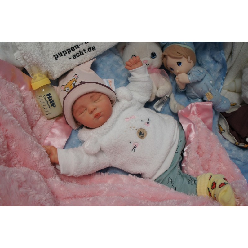 Ich wurde mit hochwertigen Farben in Real Effekt Technik eingefärbt. Mit Genesis Farben habe ich dieses alles noch mal zum Schluss gut versiegelt und eingebrannt. Diese wurde in mehreren Schichten aufgetragen, sodass ein sehr realistisches Hautbild entstanden ist. (Wisch- und Wasserfest kein Abblättern mgl). Feinste Schattierungen und leichte Betonung der Speckfalten wurden bei mir auch nicht vergessen. Leichte Äderchen an Händen, Armen, Füßchen, Beinen, Ohren, Kopf und Gesicht lassen mich wie ein echtes Baby aussehen. Jedes Fältchen an mir wurde einzeln betont. Zarte Augenbrauen wurden mir auch gegeben. Meine Nase wurde geöffnet und hinterlegt, sodass ich jetzt auch gut Luft bekomme. Auch zarte Befeuchtung der Augen, Mund und Nase lassen mich noch echter wirken.