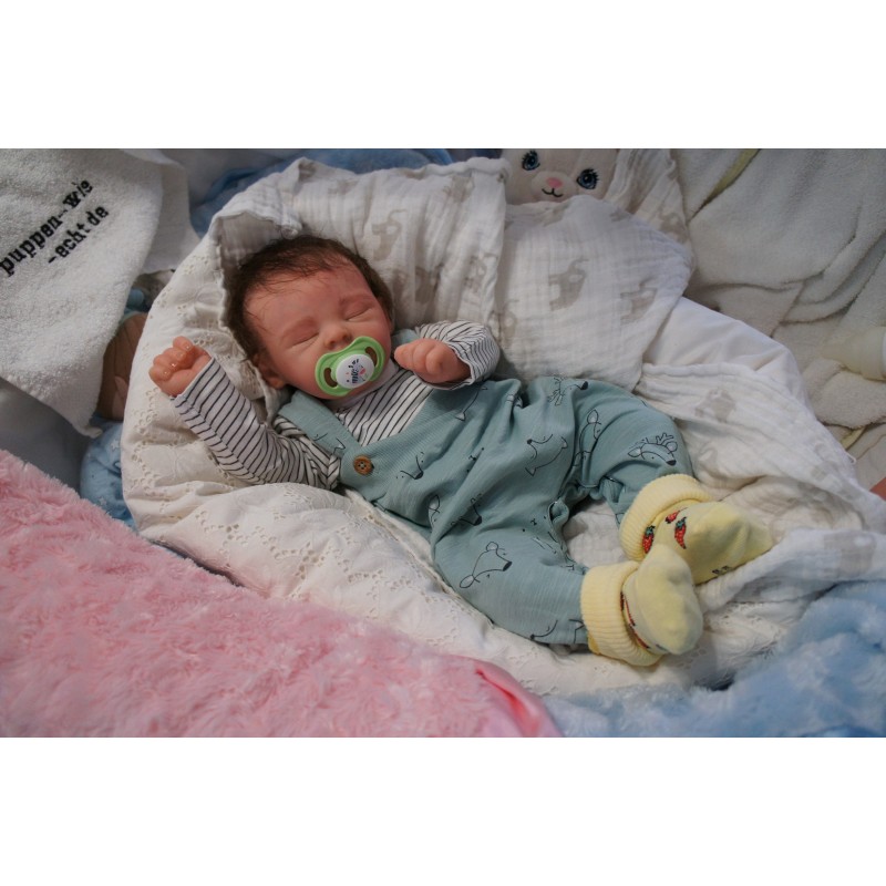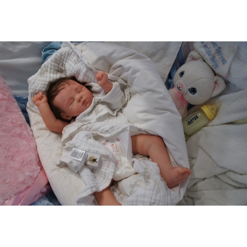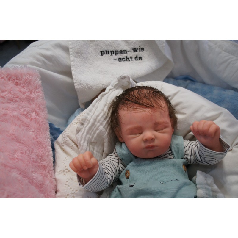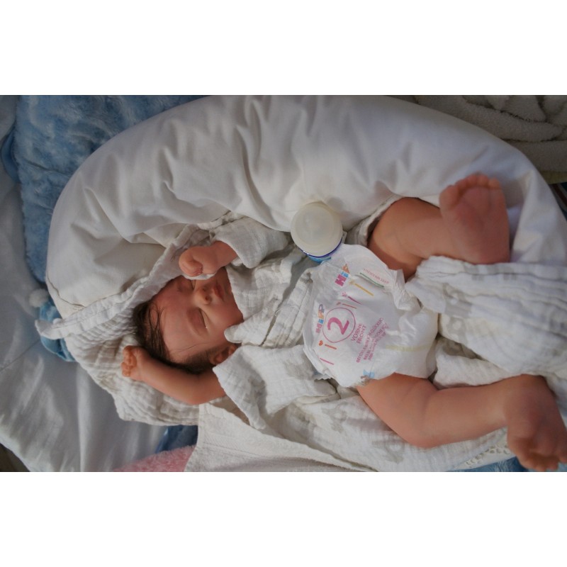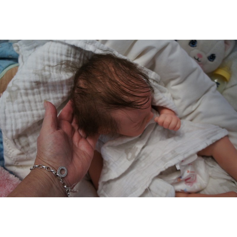 Meine Haare sind Schokoladenbraun und im micro Rooting Verfahren einzeln eingepflanzt (Feinstes Babyfluff Mohair ). Anschließend natürlich von innen versiegelt. Und nun kann man meine Haare kämmen und auch mal leicht waschen. Die passenden Wimpern habe ich auch dazu gerootet bekommen, das sieht jetzt richtig echt aus. Meine Finger- und Fußnägel wurden fein Pedi- und Manikürt und anschließend dauerhaft versiegelt. Zum Schluss bekam ich noch einen Magnetschnuller. Und ein Duftöl aufgetragen, jetzt riech ich auch noch wie ein echtes Baby.