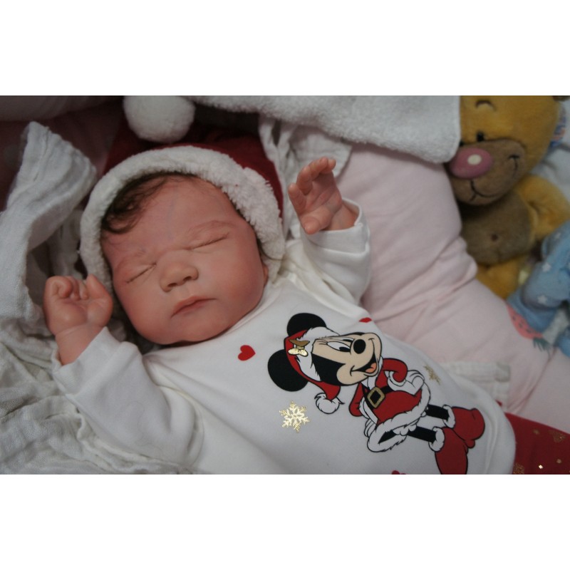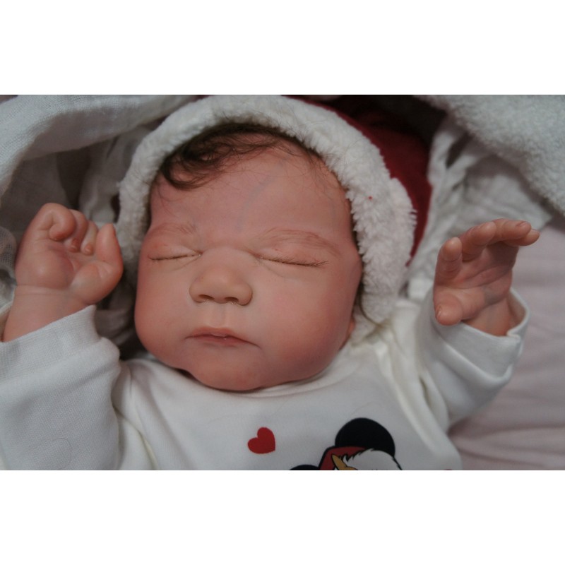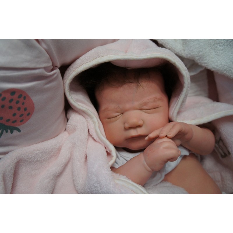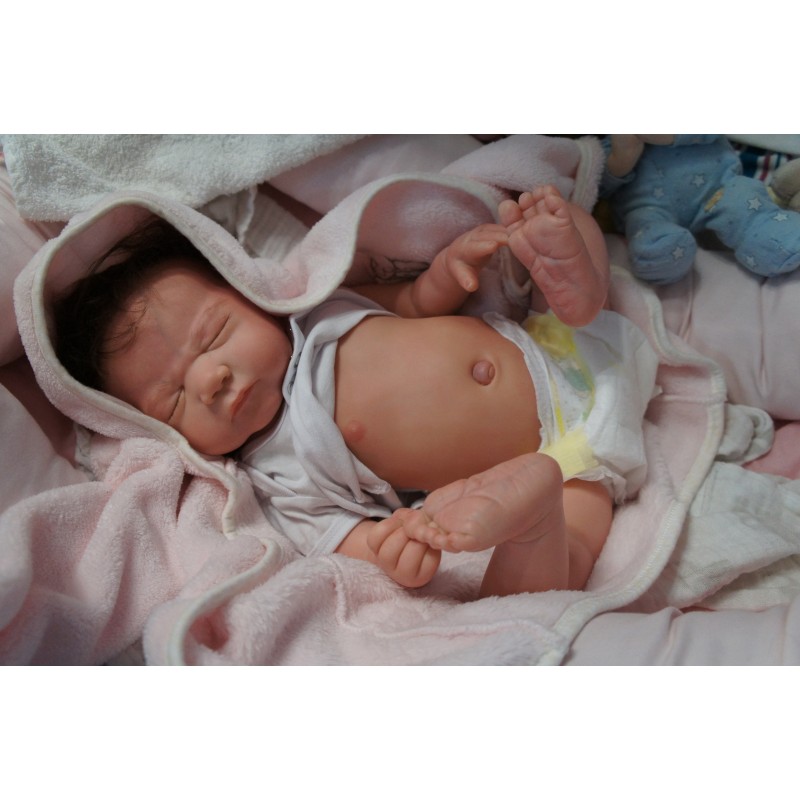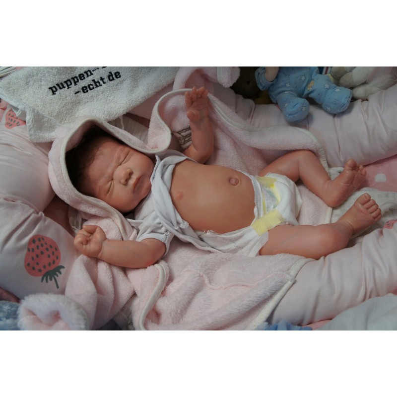 Ich wurde mit hochwertigen Farben in Real Effekt Technik eingefärbt. Mit Genesis Farben habe ich dieses alles noch mal zum Schluss gut versiegelt und eingebrannt. Diese wurde in mehreren Schichten aufgetragen, sodass ein sehr realistisches Hautbild entstanden ist. (Wisch- und Wasserfest kein Abblättern mgl). Feinste Schattierungen und leichte Betonung der Speckfalten wurden bei mir auch nicht vergessen. Leichte Äderchen an Händen, Armen, Füßchen, Beinen, Ohren, Kopf und Gesicht lassen mich wie ein echtes Baby aussehen. Jedes Fältchen an mir wurde einzeln betont. Zarte Augenbrauen wurden mir auch gegeben. Meine Nase wurde geöffnet und hinterlegt, sodass ich jetzt auch gut Luft bekomme. Auch zarte Befeuchtung der Augen, Mund und Nase lassen mich noch echter wirken.