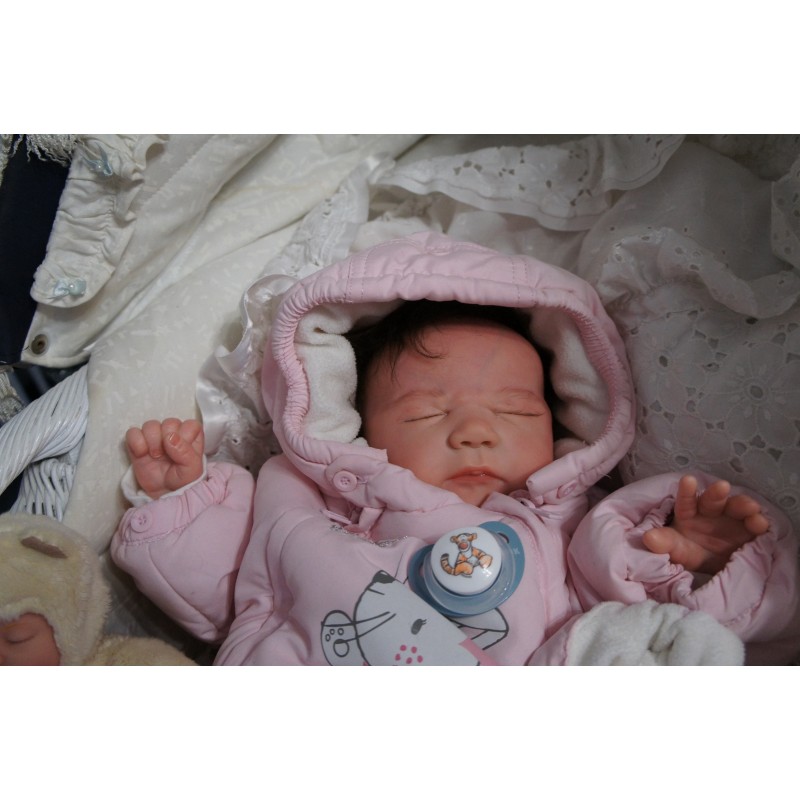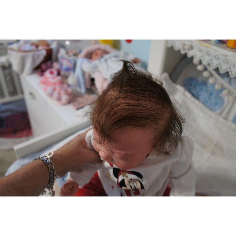 Meine Haare sind schokobraun und im micro Rooting Verfahren einzeln eingepflanzt (Feinstes BabyfluffMohair ). Anschließend natürlich von innen versiegelt. Und nun kann man meine Haare kämmen und auch mal leicht waschen. Die passenden Wimpern habe ich auch dazu gerootet bekommen, das sieht jetzt richtig echt aus. Meine Finger- und Fußnägel wurden fein Pedi- und Manikürt und anschließend dauerhaft versiegelt. Zum Schluss bekam ich noch einen Magnetschnuller. Und ein Duftöl aufgetragen, jetzt riech ich auch noch wie ein echtes Baby.