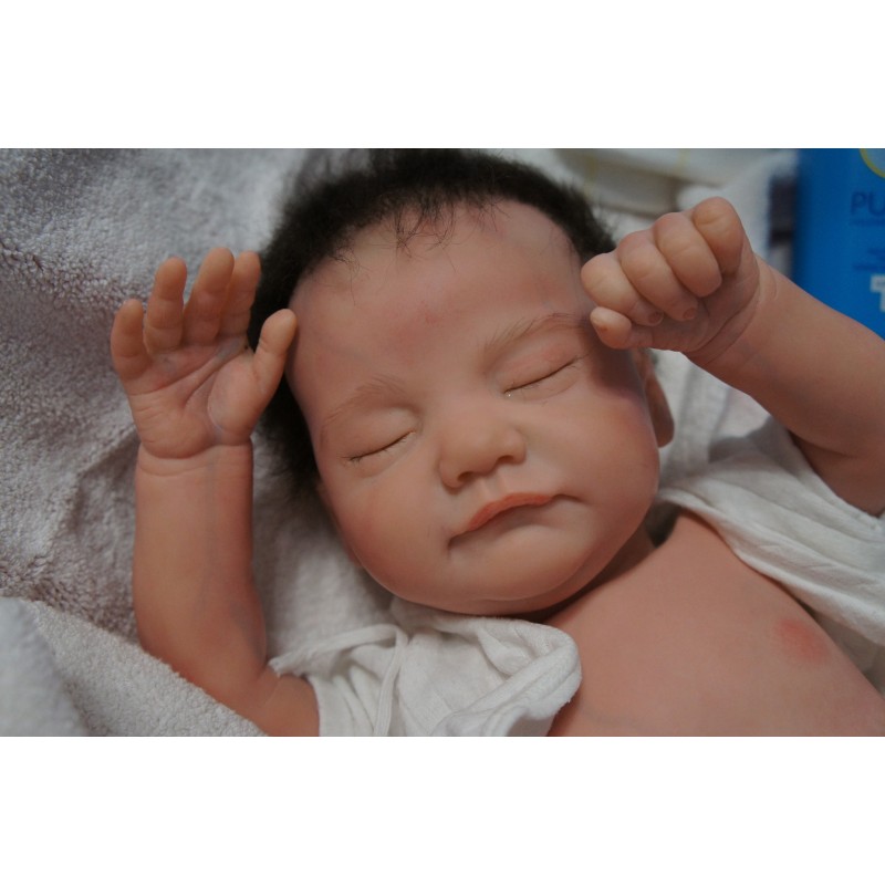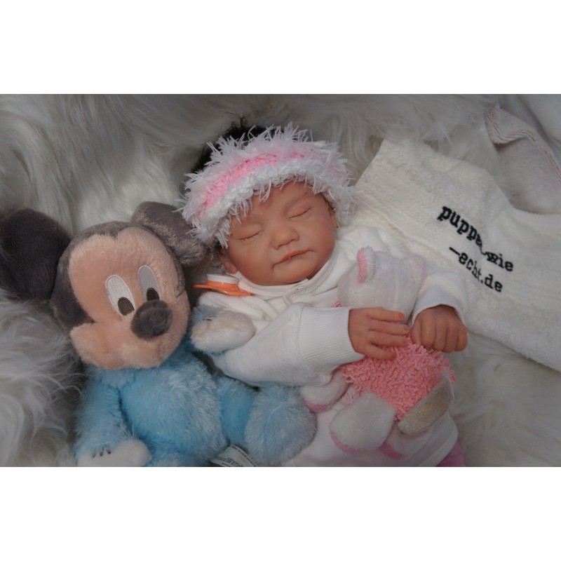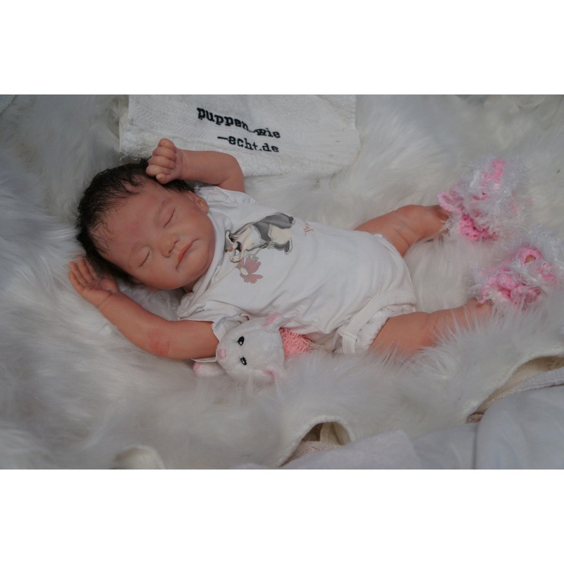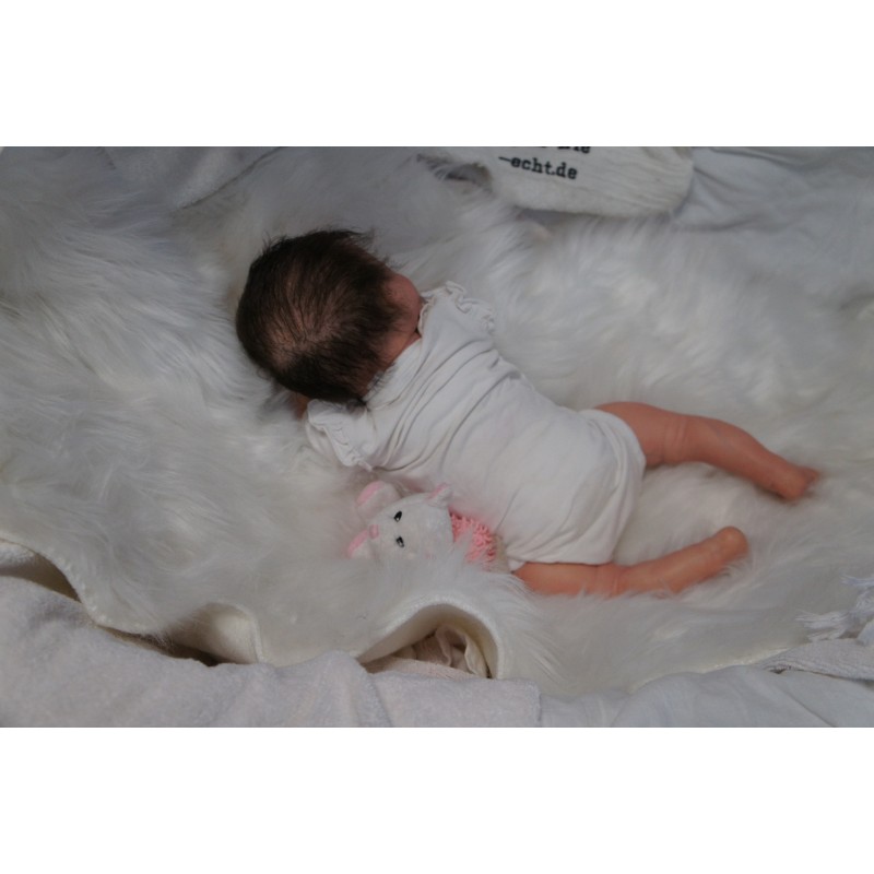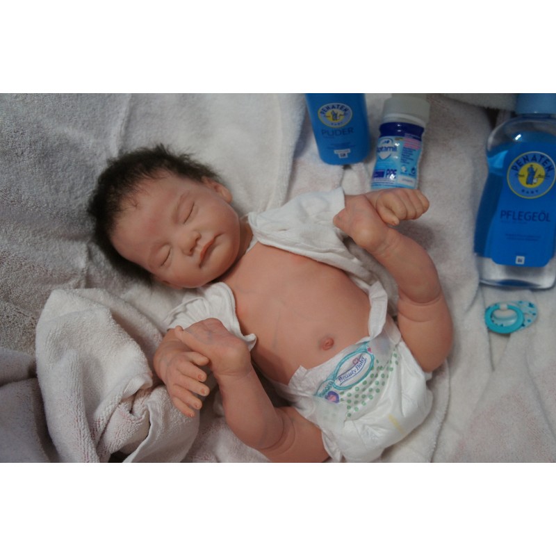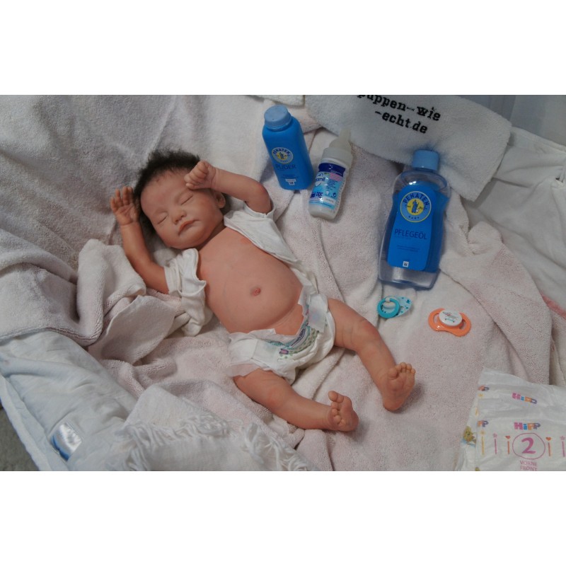 Ich wurde mit hochwertigen Farben in Real Effekt Technik eingefärbt. Mit Genesis Farben habe ich dieses alles noch mal zum Schluss gut versiegelt und eingebrannt. Diese wurde in mehreren Schichten aufgetragen, sodass ein sehr realistisches Hautbild entstanden ist. (Wisch- und Wasserfest kein Abblättern mgl). Feinste Schattierungen und leichte Betonung der Speckfalten wurden bei mir auch nicht vergessen. Leichte Äderchen an Händen, Armen, Füßchen, Beinen, Ohren, Kopf und Gesicht lassen mich wie ein echtes Baby aussehen. Jedes Fältchen an mir wurde einzeln betont. Zarte Augenbrauen wurden mir auch gegeben. Meine Nase wurde geöffnet und hinterlegt, sodass ich jetzt auch gut Luft bekomme. Auch zarte Befeuchtung der Augen, Mund und Nase lassen mich noch echter wirken.