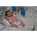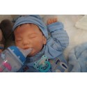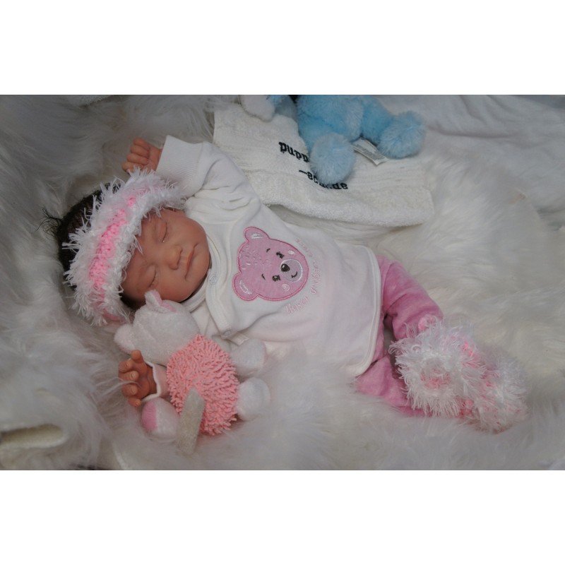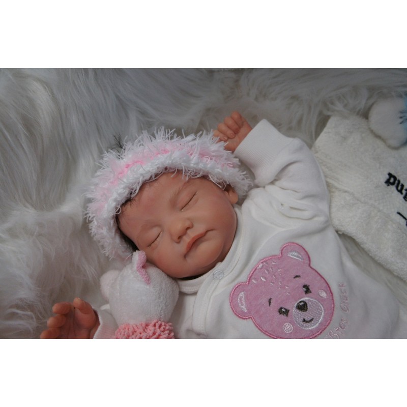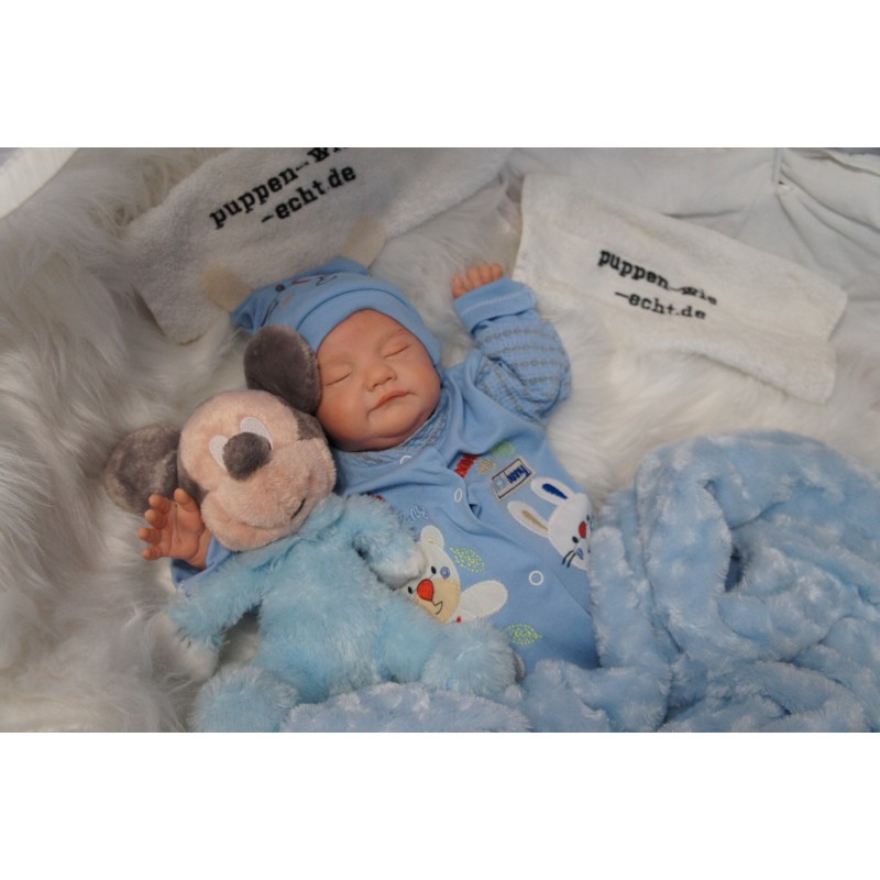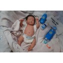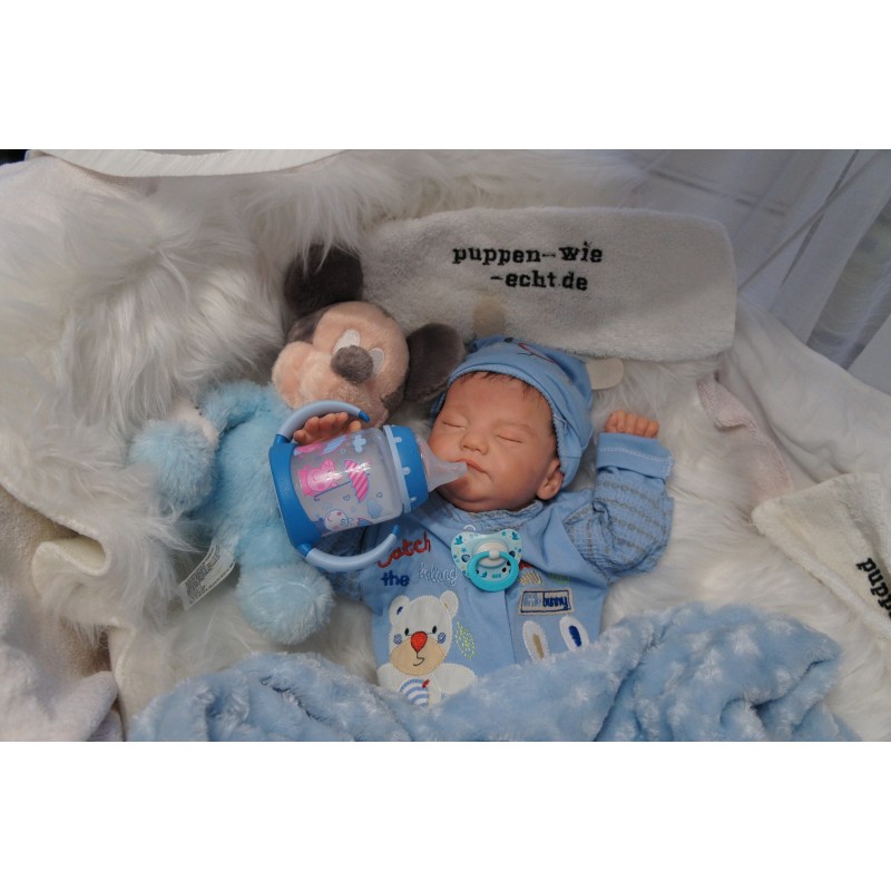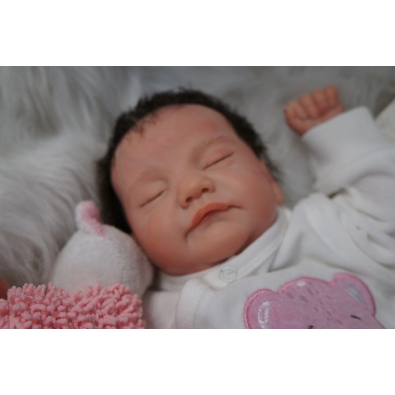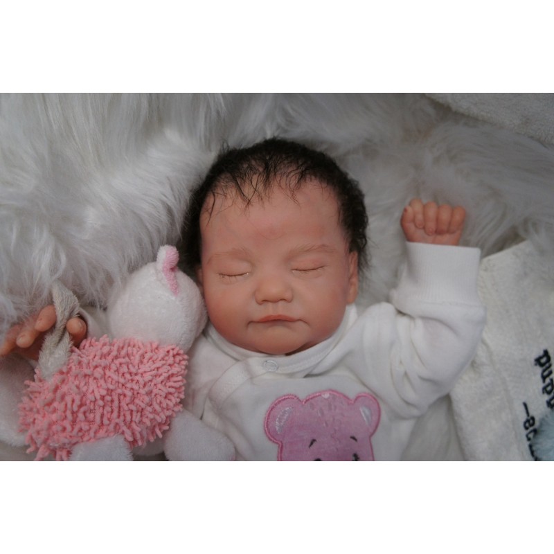 Ich wurde mit hochwertigen Farben in Real Effekt Technik eingefärbt. Mit Genesis Farben habe ich dieses alles noch mal zum Schluss gut versiegelt und eingebrannt. Diese wurde in mehreren Schichten aufgetragen, sodass ein sehr realistisches Hautbild entstanden ist. (Wisch- und Wasserfest kein Abblättern mgl). Feinste Schattierungen und leichte Betonung der Speckfalten wurden bei mir auch nicht vergessen. Leichte Äderchen an Händen, Armen, Füßchen, Beinen, Ohren, Kopf und Gesicht lassen mich wie ein echtes Baby aussehen. Jedes Fältchen an mir wurde einzeln betont. Zarte Augenbrauen wurden mir auch gegeben. Meine Nase wurde geöffnet und hinterlegt, sodass ich jetzt auch gut Luft bekomme. Auch zarte Befeuchtung der Augen, Mund und Nase lassen mich noch echter wirken.