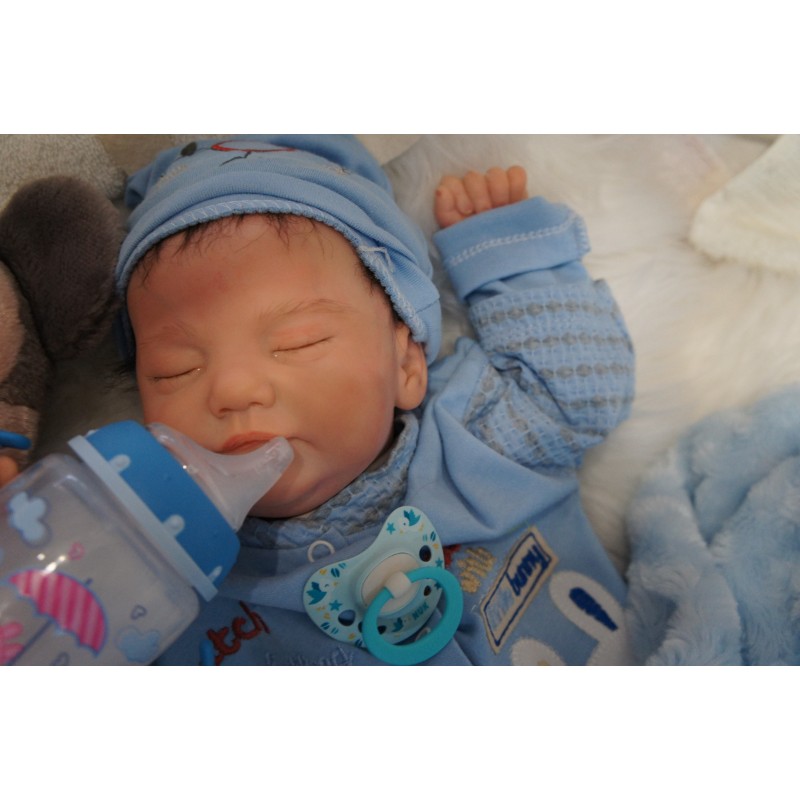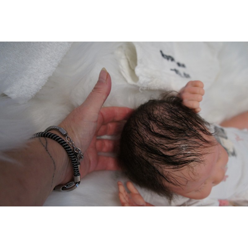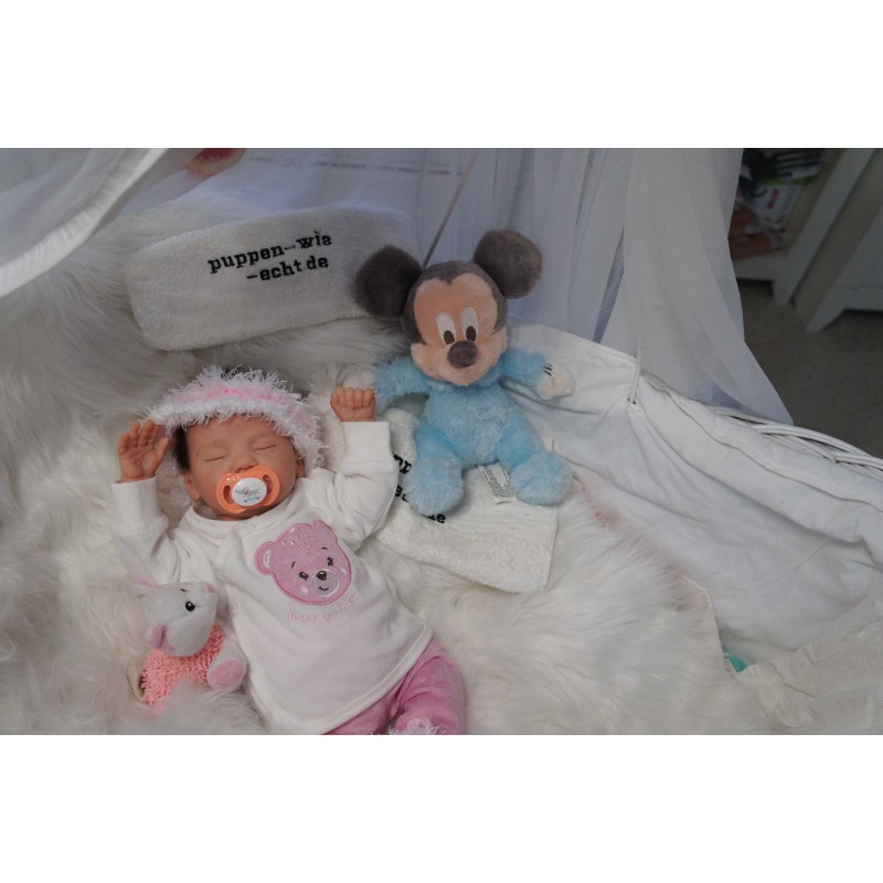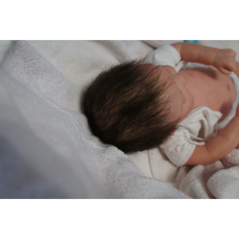 Meine Haare sind dunkelbraun und im micro Rooting Verfahren einzeln eingepflanzt (Feinstes Babyfluff Mohair ). Anschließend natürlich von innen versiegelt. Und nun kann man meine Haare kämmen und auch mal leicht waschen. Die passenden Wimpern habe ich auch dazu gerootet bekommen, das sieht jetzt richtig echt aus. Meine Finger- und Fußnägel wurden fein Pedi- und Manikürt und anschließend dauerhaft versiegelt. Zum Schluss bekam ich noch einen Magnetschnuller. Und ein Duftöl aufgetragen, jetzt riech ich auch noch wie ein echtes Baby.