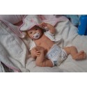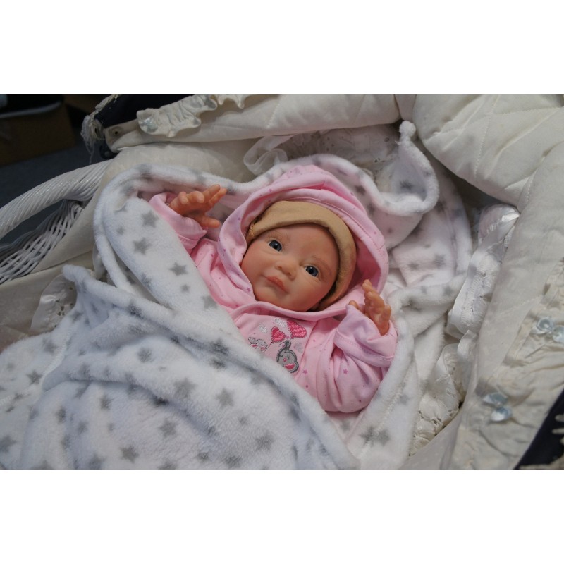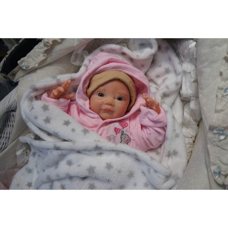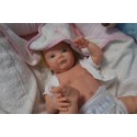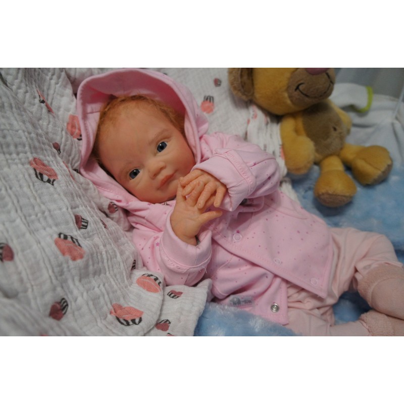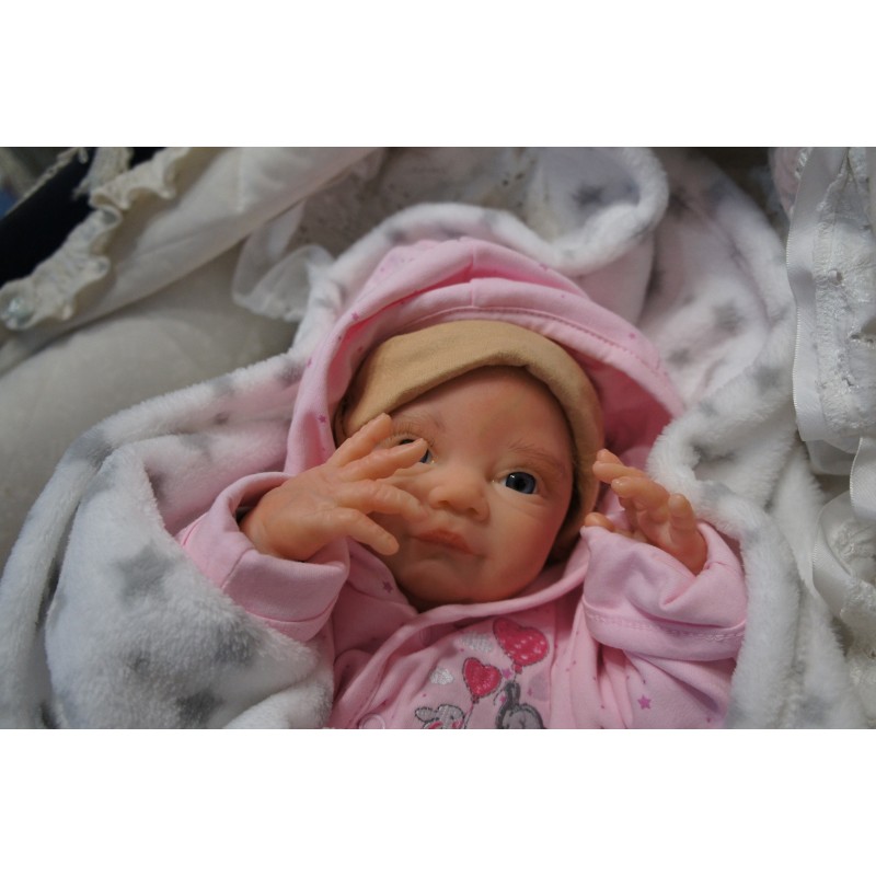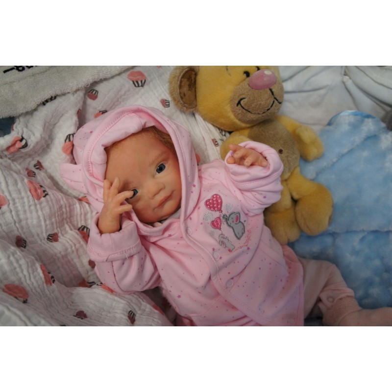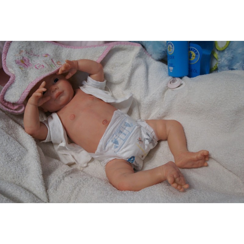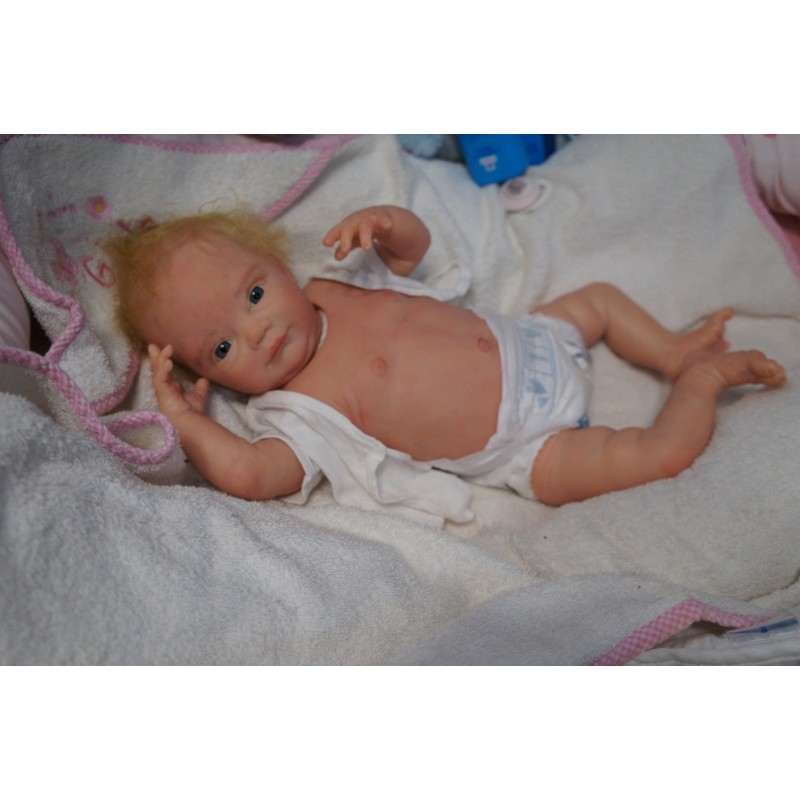 Ich wurde mit hochwertigen Farben in Real Effekt Technik eingefärbt. Mit Genesis Farben habe ich dieses alles noch mal zum Schluss gut versiegelt und eingebrannt. Diese wurde in mehreren Schichten aufgetragen, sodass ein sehr realistisches Hautbild entstanden ist. (Wisch- und Wasserfest kein Abblättern mgl). Feinste Schattierungen und leichte Betonung der Speckfalten wurden bei mir auch nicht vergessen. Leichte Äderchen an Händen, Armen, Füßchen, Beinen, Ohren, Kopf und Gesicht lassen mich wie ein echtes Baby aussehen. Jedes Fältchen an mir wurde einzeln betont. Zarte Augenbrauen wurden mir auch gegeben. Meine Nase wurde geöffnet und hinterlegt, sodass ich jetzt auch gut Luft bekomme. Auch zarte Befeuchtung der Augen, Mund und Nase lassen mich noch echter wirken.