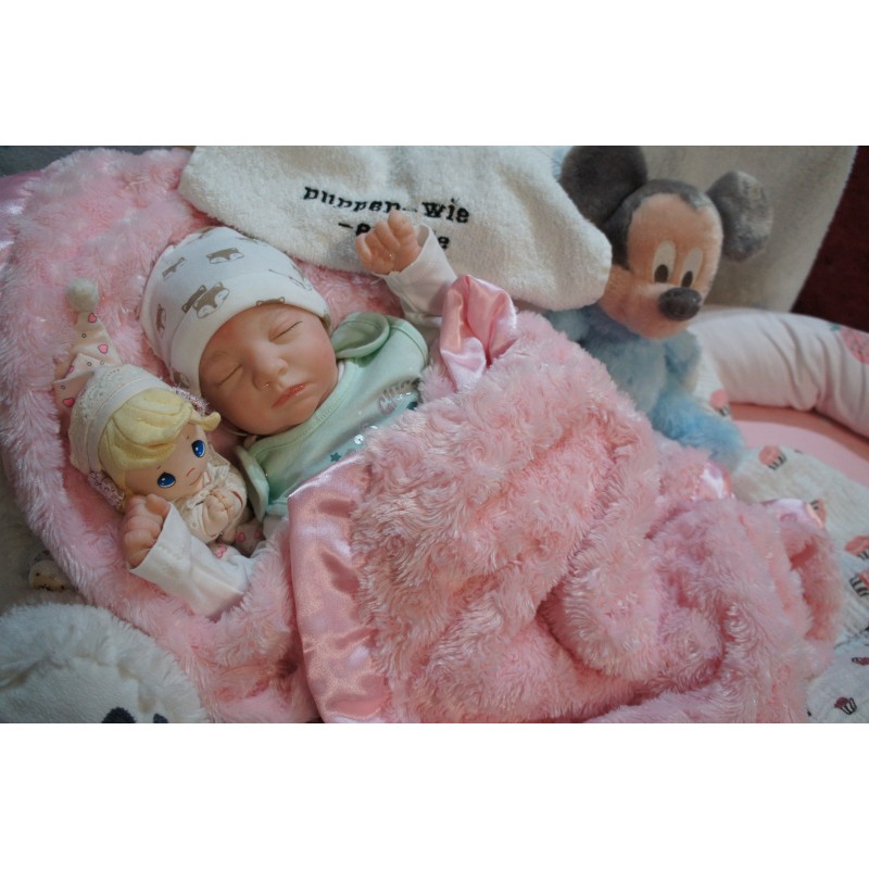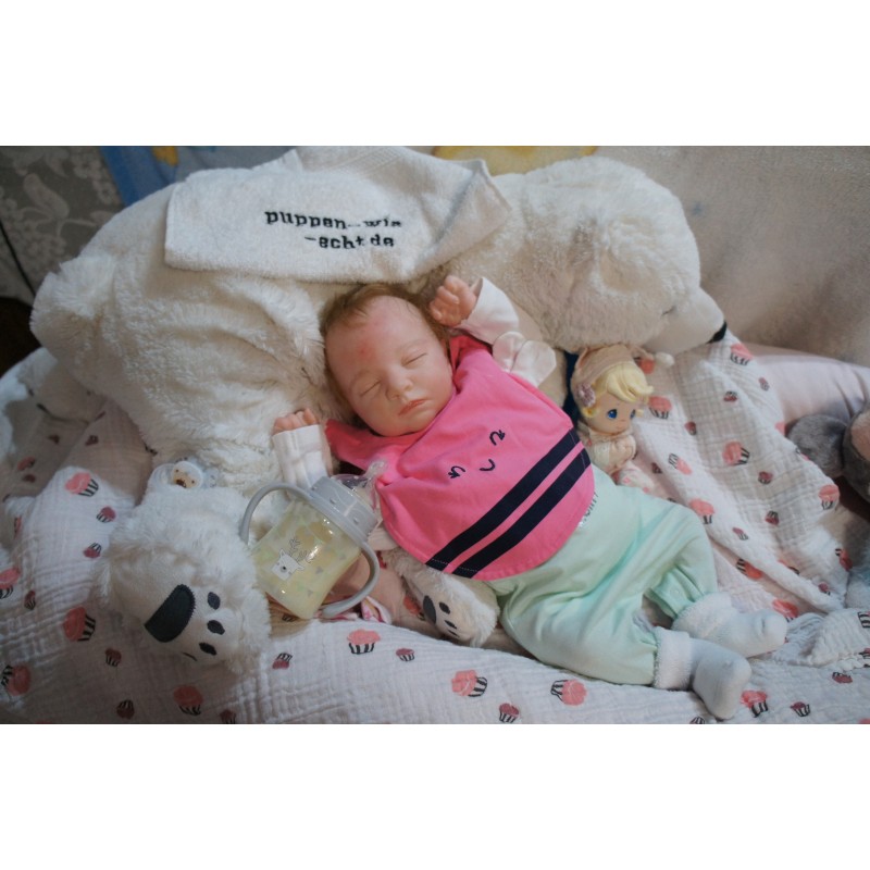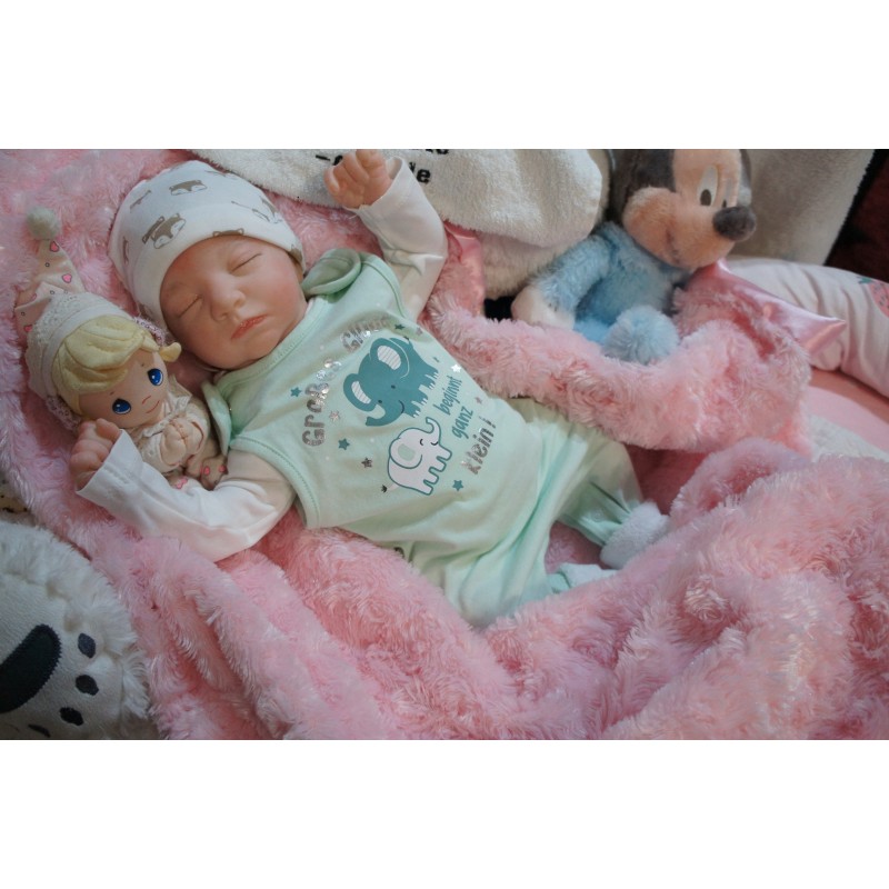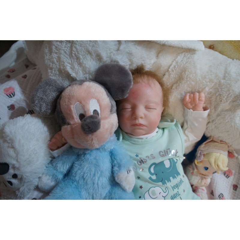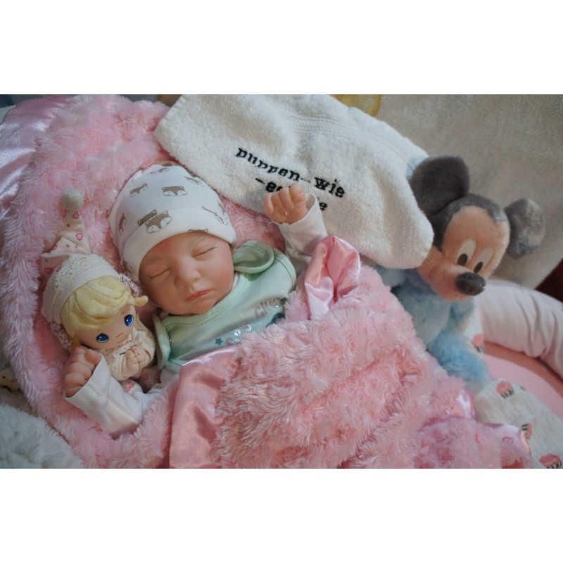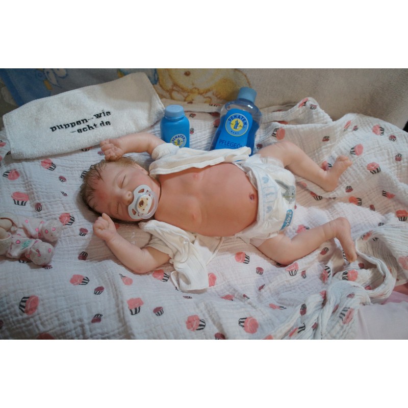 Ich wurde mit hochwertigen Farben in Real Effekt Technik eingefärbt. Mit Genesis Farben habe ich dieses alles noch mal zum Schluss gut versiegelt und eingebrannt. Diese wurde in mehreren Schichten aufgetragen, sodass ein sehr realistisches Hautbild entstanden ist. (Wisch- und Wasserfest kein Abblättern mgl). Feinste Schattierungen und leichte Betonung der Speckfalten wurden bei mir auch nicht vergessen. Leichte Äderchen an Händen, Armen, Füßchen, Beinen, Ohren, Kopf und Gesicht lassen mich wie ein echtes Baby aussehen. Jedes Fältchen an mir wurde einzeln betont. Zarte Augenbrauen wurden mir auch gegeben. Meine Nase wurde geöffnet und hinterlegt, sodass ich jetzt auch gut Luft bekomme. Auch zarte Befeuchtung der Augen, Mund und Nase lassen mich noch echter wirken.
