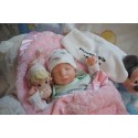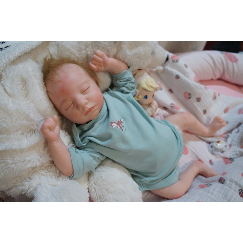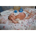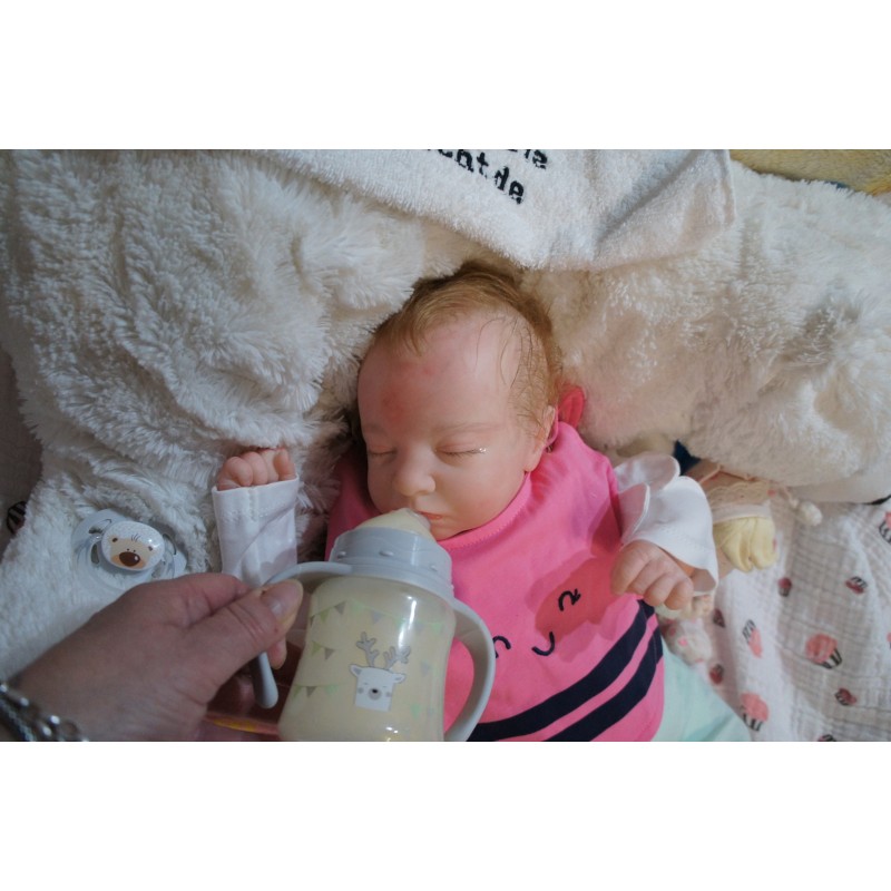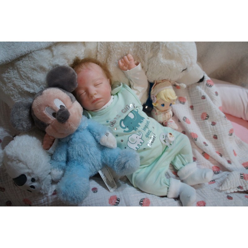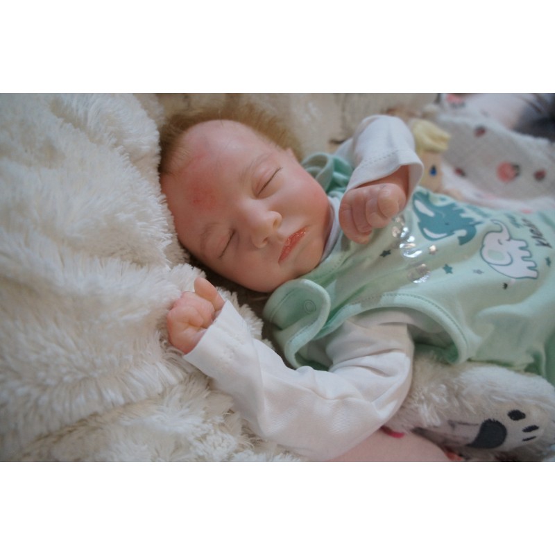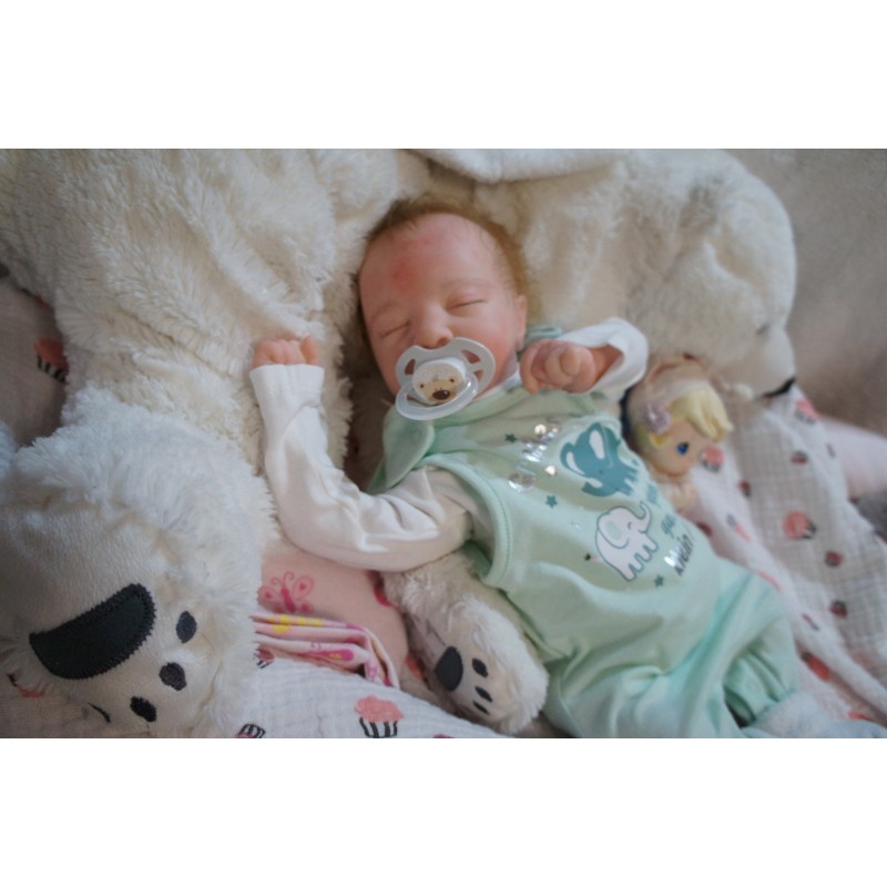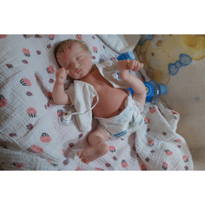 Ich wurde mit hochwertigen Farben in Real Effekt Technik eingefärbt. Mit Genesis Farben habe ich dieses alles noch mal zum Schluss gut versiegelt und eingebrannt. Diese wurde in mehreren Schichten aufgetragen, sodass ein sehr realistisches Hautbild entstanden ist. (Wisch- und Wasserfest kein Abblättern mgl). Feinste Schattierungen und leichte Betonung der Speckfalten wurden bei mir auch nicht vergessen. Leichte Äderchen an Händen, Armen, Füßchen, Beinen, Ohren, Kopf und Gesicht lassen mich wie ein echtes Baby aussehen. Jedes Fältchen an mir wurde einzeln betont. Zarte Augenbrauen wurden mir auch gegeben. Meine Nase wurde geöffnet und hinterlegt, sodass ich jetzt auch gut Luft bekomme. Auch zarte Befeuchtung der Augen, Mund und Nase lassen mich noch echter wirken.