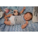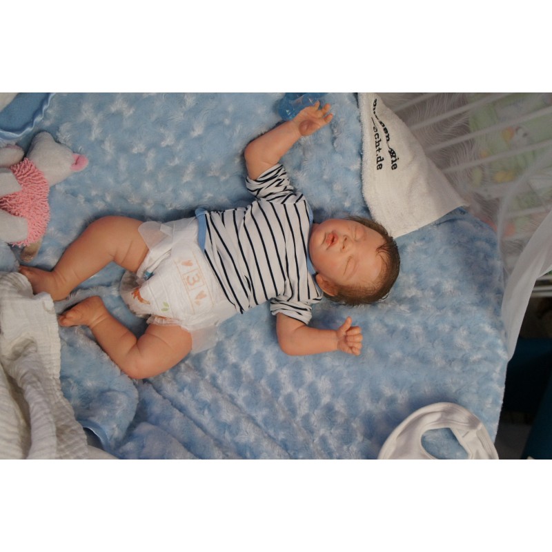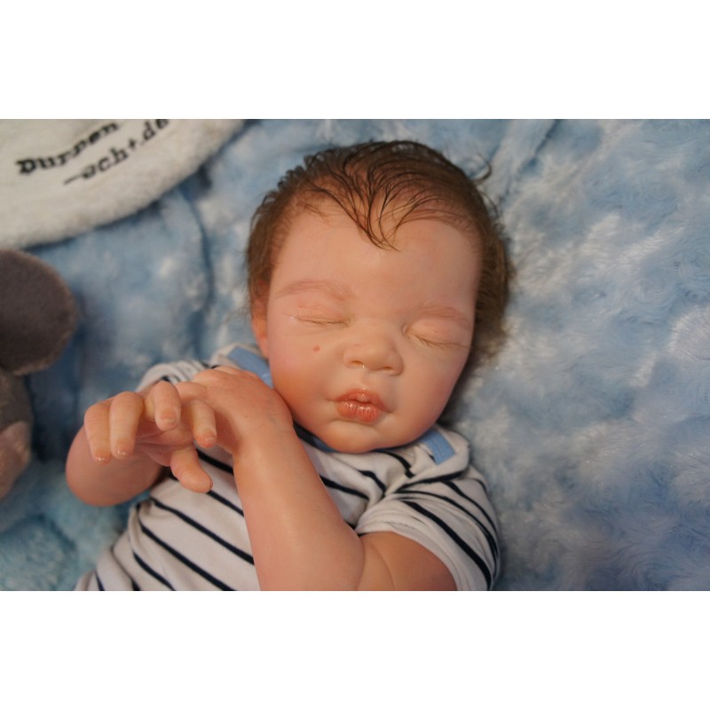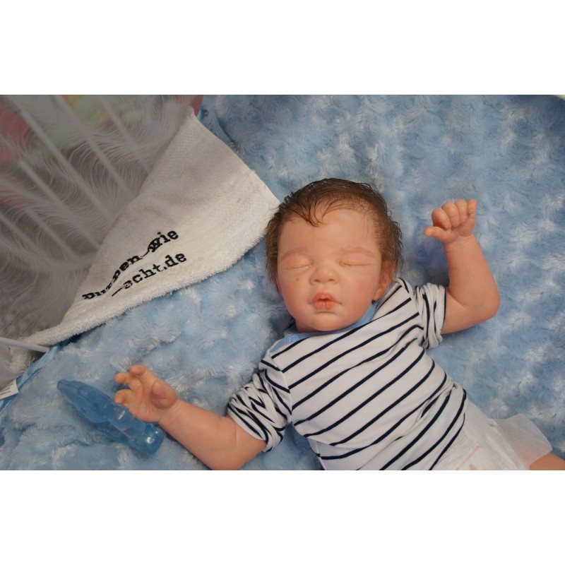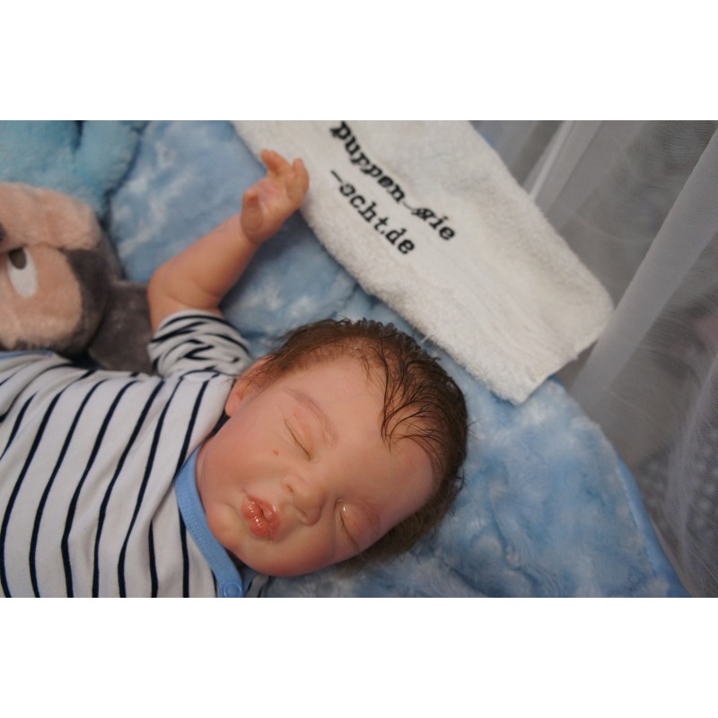 Ich wurde mit hochwertigen Farben in Real Effekt Technik eingefärbt. Mit Genesis Farben habe ich dieses alles noch mal zum Schluss gut versiegelt und eingebrannt. Diese wurde in mehreren Schichten aufgetragen, sodass ein sehr realistisches Hautbild entstanden ist. (Wisch- und Wasserfest kein Abblättern mgl). Feinste Schattierungen und leichte Betonung der Speckfalten wurden bei mir auch nicht vergessen. Leichte Äderchen an Händen, Armen, Füßchen, Beinen, Ohren, Kopf und Gesicht lassen mich wie ein echtes Baby aussehen. Jedes Fältchen an mir wurde einzeln betont. Zarte Augenbrauen wurden mir auch gegeben. Meine Nase wurde geöffnet und hinterlegt, sodass ich jetzt auch gut Luft bekomme. Auch zarte Befeuchtung der Augen, Mund und Nase lassen mich noch echter wirken.