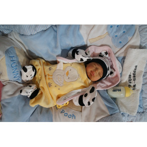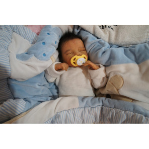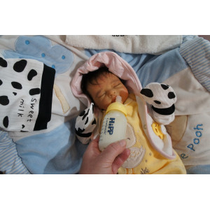 Meine Haare sind schwarz und im micro Rooting Verfahren einzeln eingepflanzt (Feinstes HQ Mohair Premium Kids). Anschließend natürlich von innen versiegelt. Und nun kann man meine Haare kämmen und auch mal leicht waschen. Die passenden Wimpern habe ich auch dazu gerootet bekommen, das sieht jetzt richtig echt aus. Meine Finger- und Fußnägel wurden fein Pedi- und Manikürt und anschließend dauerhaft versiegelt. Zum Schluss bekam ich noch einen Magnetschnuller. Und ein Duftöl aufgetragen, jetzt riech ich auch noch wie ein echtes Baby.