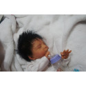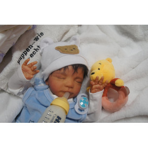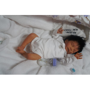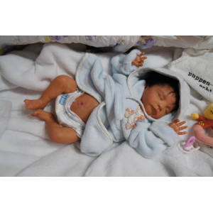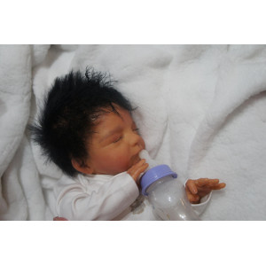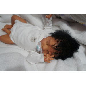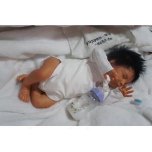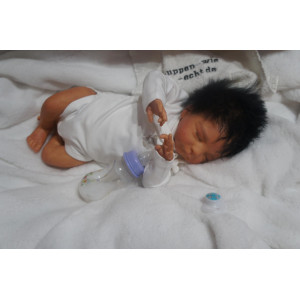 Meine Haare sind schwarz und im micro Rooting Verfahren einzeln eingepflanzt (Feinstes Mohair ). Anschließend natürlich von innen versiegelt. Und nun kann man meine Haare kämmen und auch mal leicht waschen. Die passenden Wimpern habe ich auch dazu gerootet bekommen, das sieht jetzt richtig echt aus. Meine Finger- und Fußnägel wurden fein Pedi- und Manikürt und anschließend dauerhaft versiegelt. Zum Schluss bekam ich noch einen Magnetschnuller. Und ein Duftöl aufgetragen, jetzt riech ich auch noch wie ein echtes Baby.