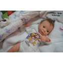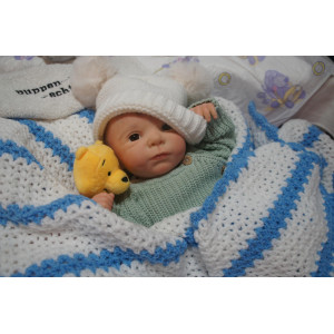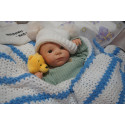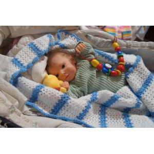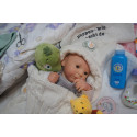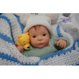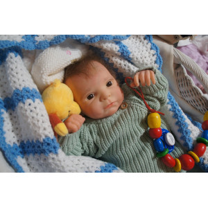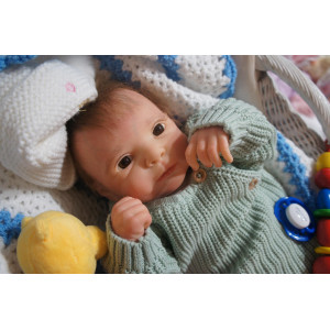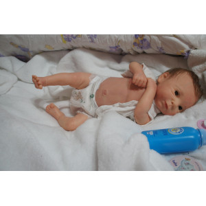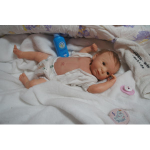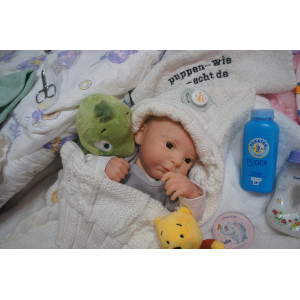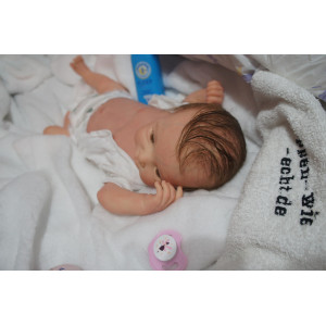 Ich wurde mit hochwertigen Farben in Real Effekt Technik eingefärbt. Mit Genesis Farben habe ich dieses alles noch mal zum Schluss gut versiegelt und eingebrannt. Diese wurde in mehreren Schichten aufgetragen, sodass ein sehr realistisches Hautbild entstanden ist. (Wisch- und Wasserfest kein Abblättern mgl). Feinste Schattierungen und leichte Betonung der Speckfalten wurden bei mir auch nicht vergessen. Leichte Äderchen an Händen, Armen, Füßchen, Beinen, Ohren, Kopf und Gesicht lassen mich wie ein echtes Baby aussehen. Jedes Fältchen an mir wurde einzeln betont. Zarte Augenbrauen wurden mir auch gegeben. Meine Nase wurde geöffnet und hinterlegt, sodass ich jetzt auch gut Luft bekomme. Auch zarte Befeuchtung der Augen, Mund und Nase lassen mich noch echter wirken.