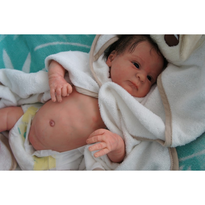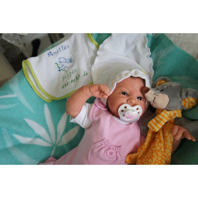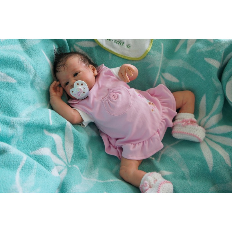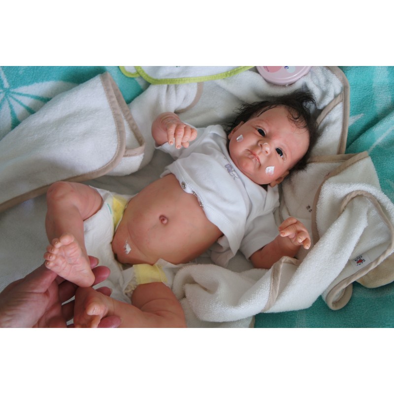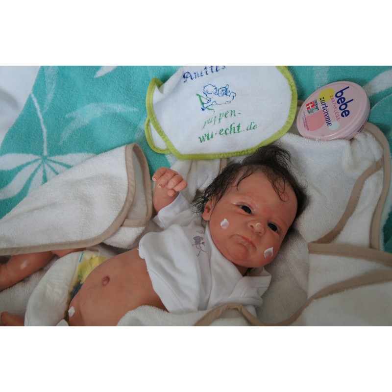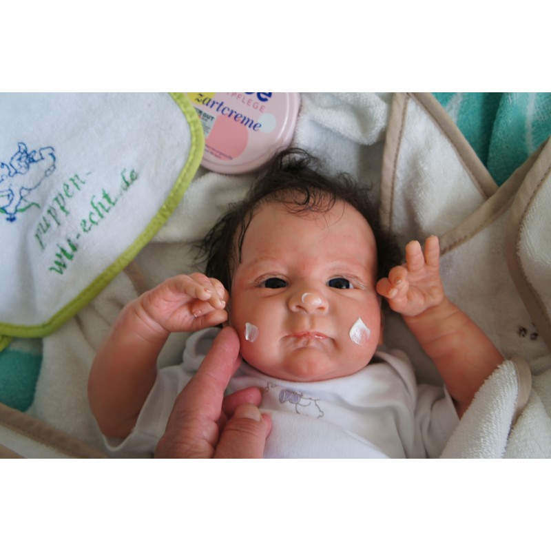 Ich wurde mit hochwertigen Farben in Real Effekt Technik eingefärbt. Mit Genesis Farben habe ich dieses alles noch mal zum Schluss gut versiegelt und eingebrannt. Diese wurde in mehreren Schichten aufgetragen, sodass ein sehr realistisches Hautbild entstanden ist. (Wisch- und Wasserfest kein Abblättern mgl). Feinste Schattierungen und leichte Betonung der Speckfalten wurden bei mir auch nicht vergessen. Leichte Äderchen an Händen, Armen, Füßchen, Beinen, Ohren, Kopf und Gesicht lassen mich wie ein echtes Baby aussehen. Jedes Fältchen an mir wurde einzeln betont. Zarte Augenbrauen wurden mir auch gegeben. Meine Nase wurde geöffnet und hinterlegt, sodass ich jetzt auch gut Luft bekomme. Auch zarte Befeuchtung der Augen, Mund und Nase lassen mich noch echter wirken.