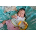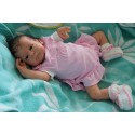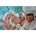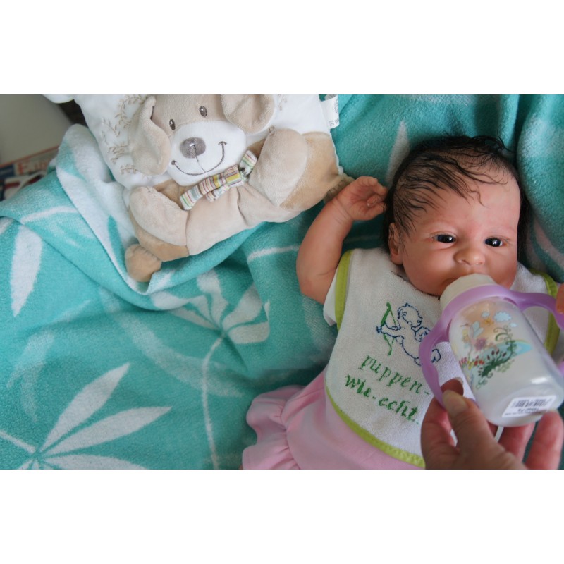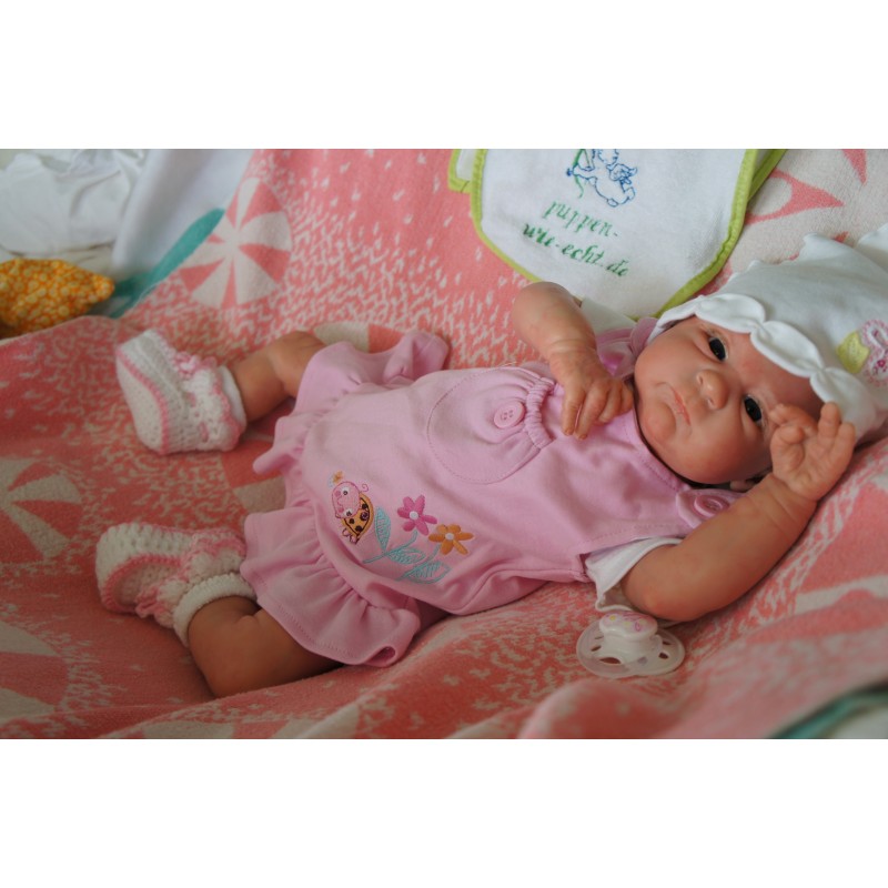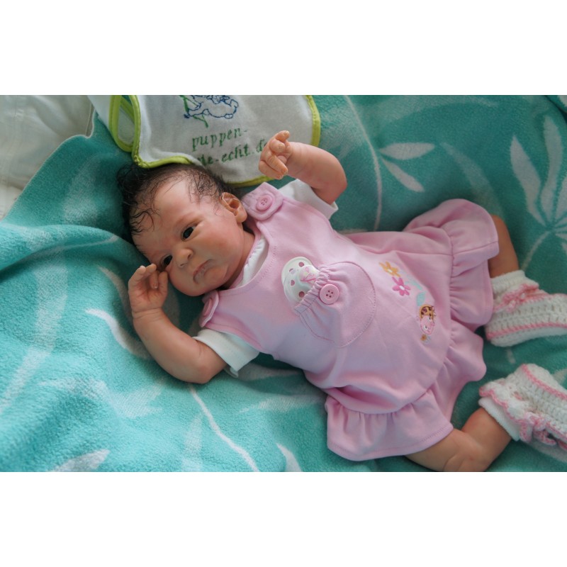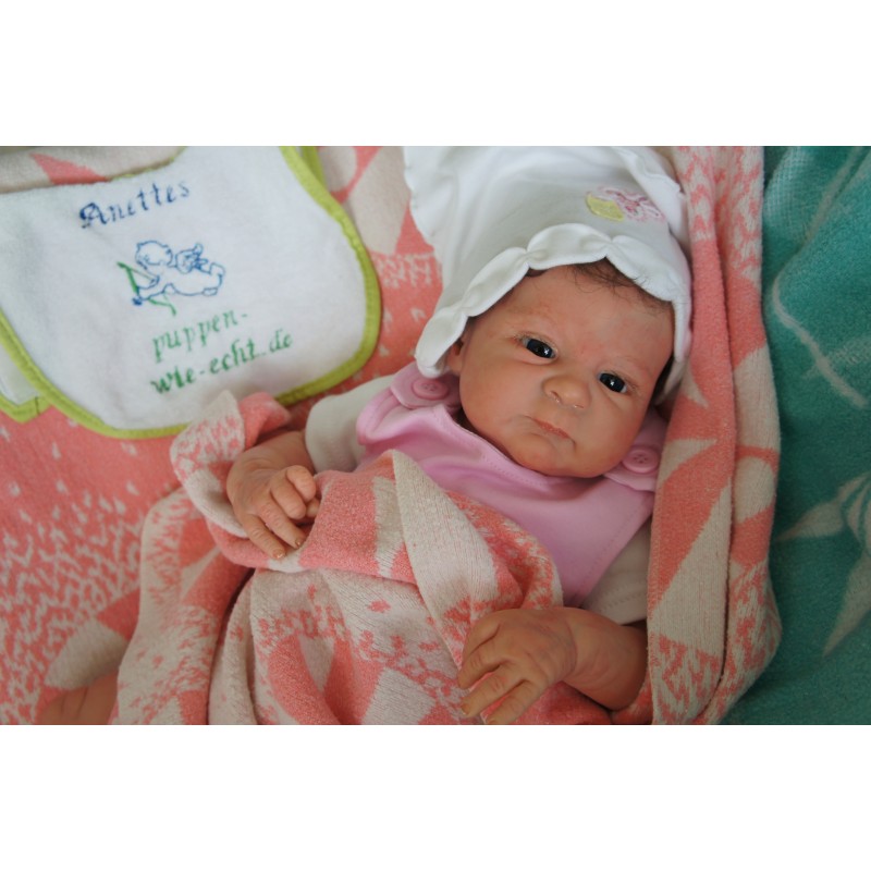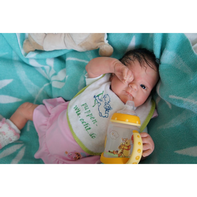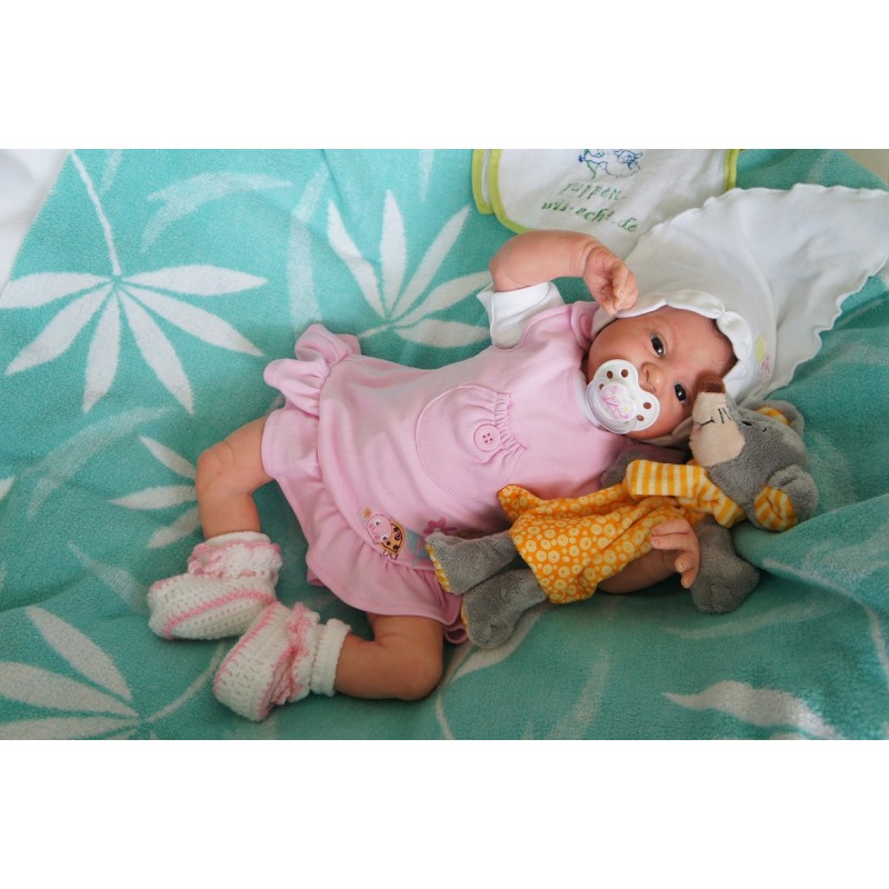 Ich wurde mit hochwertigen Farben in Real Effekt Technik eingefärbt. Mit Genesis Farben habe ich dieses alles noch mal zum Schluss gut versiegelt und eingebrannt. Diese wurde in mehreren Schichten aufgetragen, sodass ein sehr realistisches Hautbild entstanden ist. (Wisch- und Wasserfest kein Abblättern mgl). Feinste Schattierungen und leichte Betonung der Speckfalten wurden bei mir auch nicht vergessen. Leichte Äderchen an Händen, Armen, Füßchen, Beinen, Ohren, Kopf und Gesicht lassen mich wie ein echtes Baby aussehen. Jedes Fältchen an mir wurde einzeln betont. Zarte Augenbrauen wurden mir auch gegeben. Meine Nase wurde geöffnet und hinterlegt, sodass ich jetzt auch gut Luft bekomme. Auch zarte Befeuchtung der Augen, Mund und Nase lassen mich noch echter wirken.