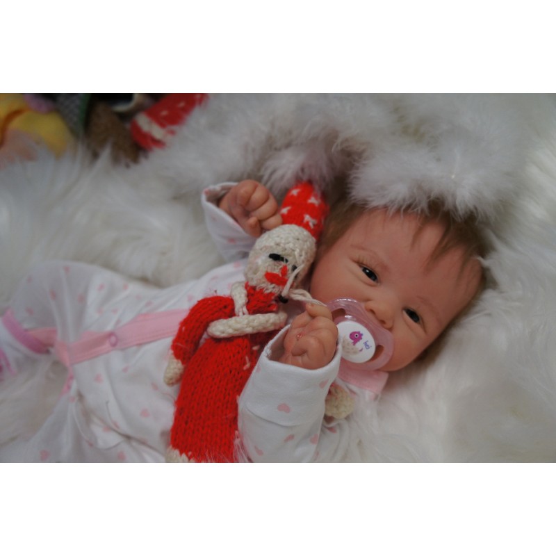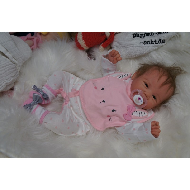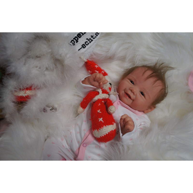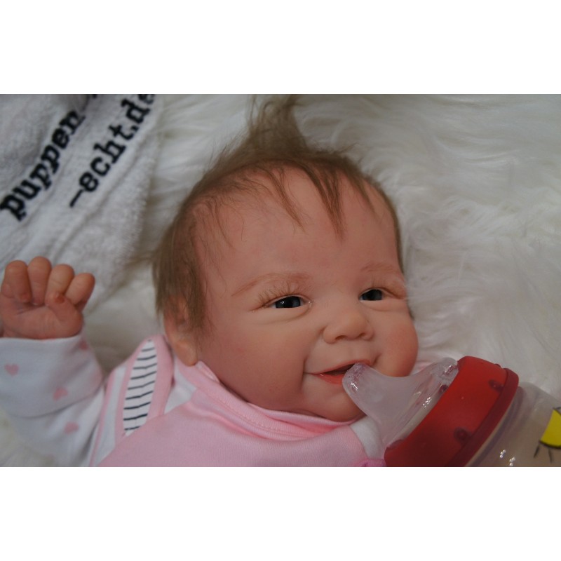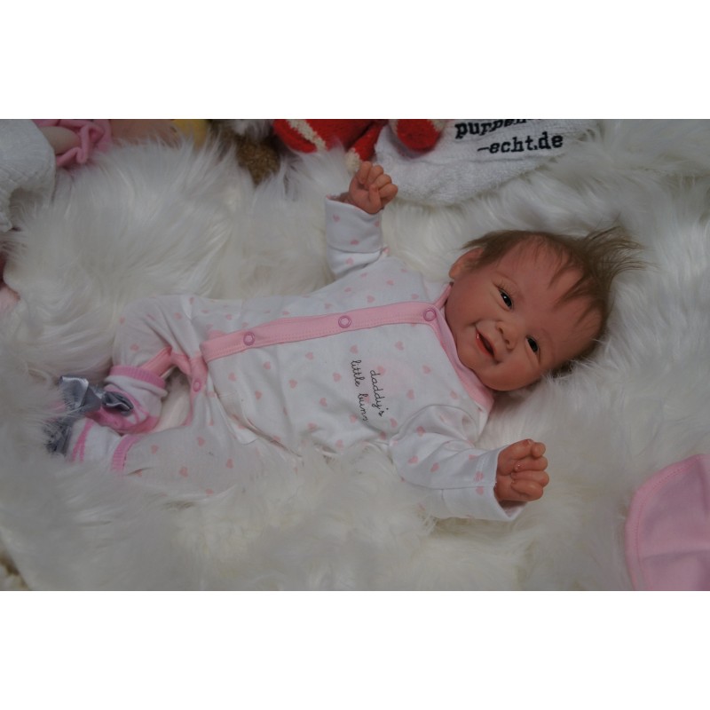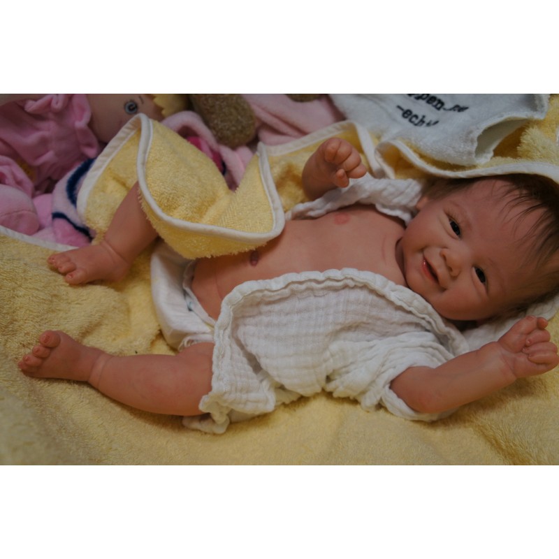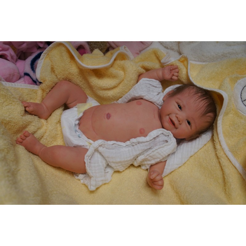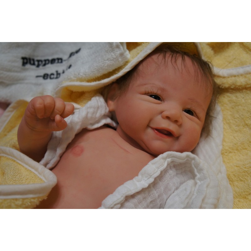 Ich wurde mit hochwertigen Farben in Real Effekt Technik eingefärbt. Mit Genesis Farben habe ich dieses alles noch mal zum Schluss gut versiegelt und eingebrannt. Diese wurde in mehreren Schichten aufgetragen, sodass ein sehr realistisches Hautbild entstanden ist. (Wisch- und Wasserfest kein Abblättern mgl). Feinste Schattierungen und leichte Betonung der Speckfalten wurden bei mir auch nicht vergessen. Leichte Äderchen an Händen, Armen, Füßchen, Beinen, Ohren, Kopf und Gesicht lassen mich wie ein echtes Baby aussehen. Jedes Fältchen an mir wurde einzeln betont. Zarte Augenbrauen wurden mir auch gegeben. Meine Nase wurde geöffnet und hinterlegt, sodass ich jetzt auch gut Luft bekomme. Auch zarte Befeuchtung der Augen, Mund und Nase lassen mich noch echter wirken.